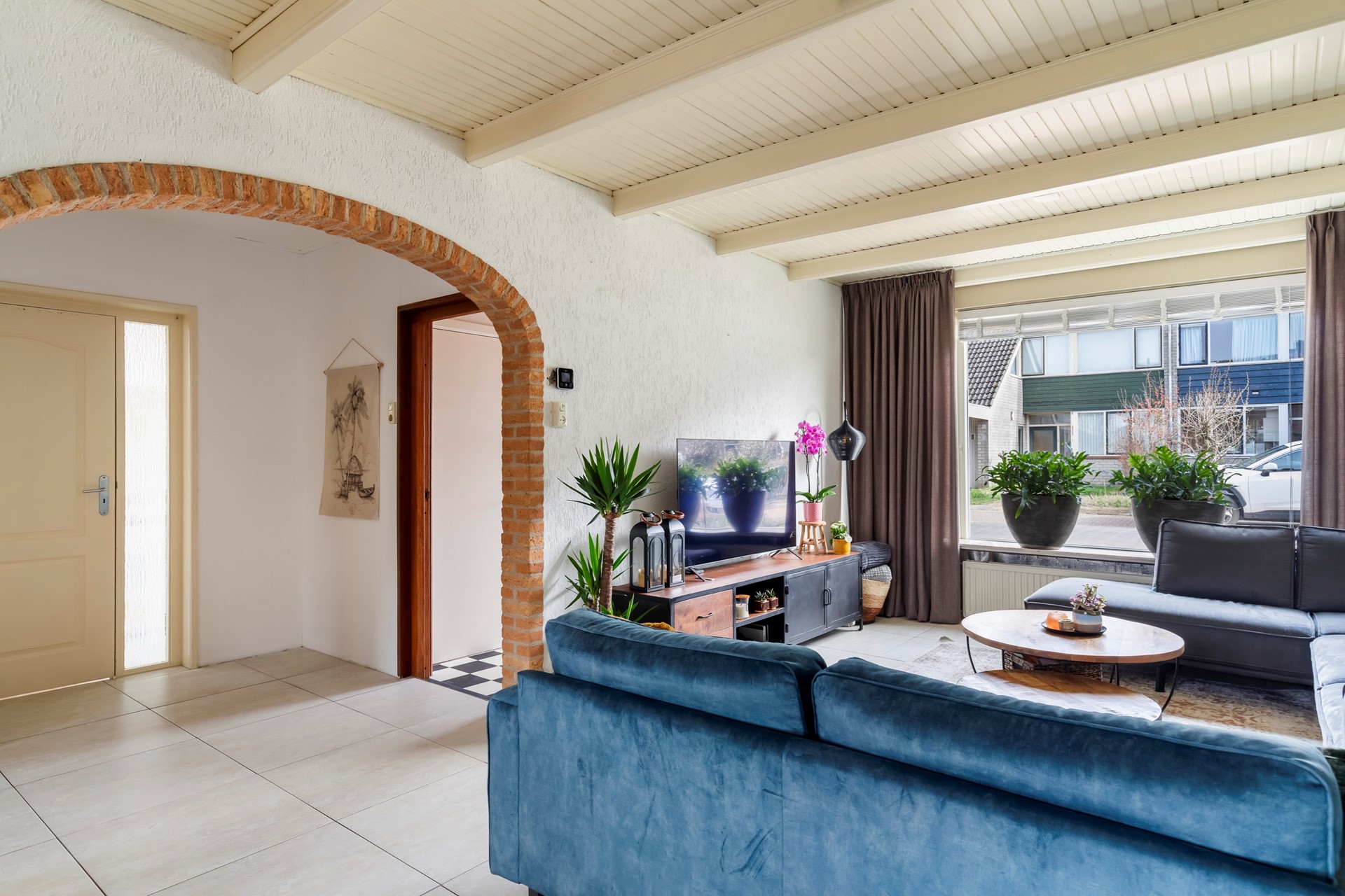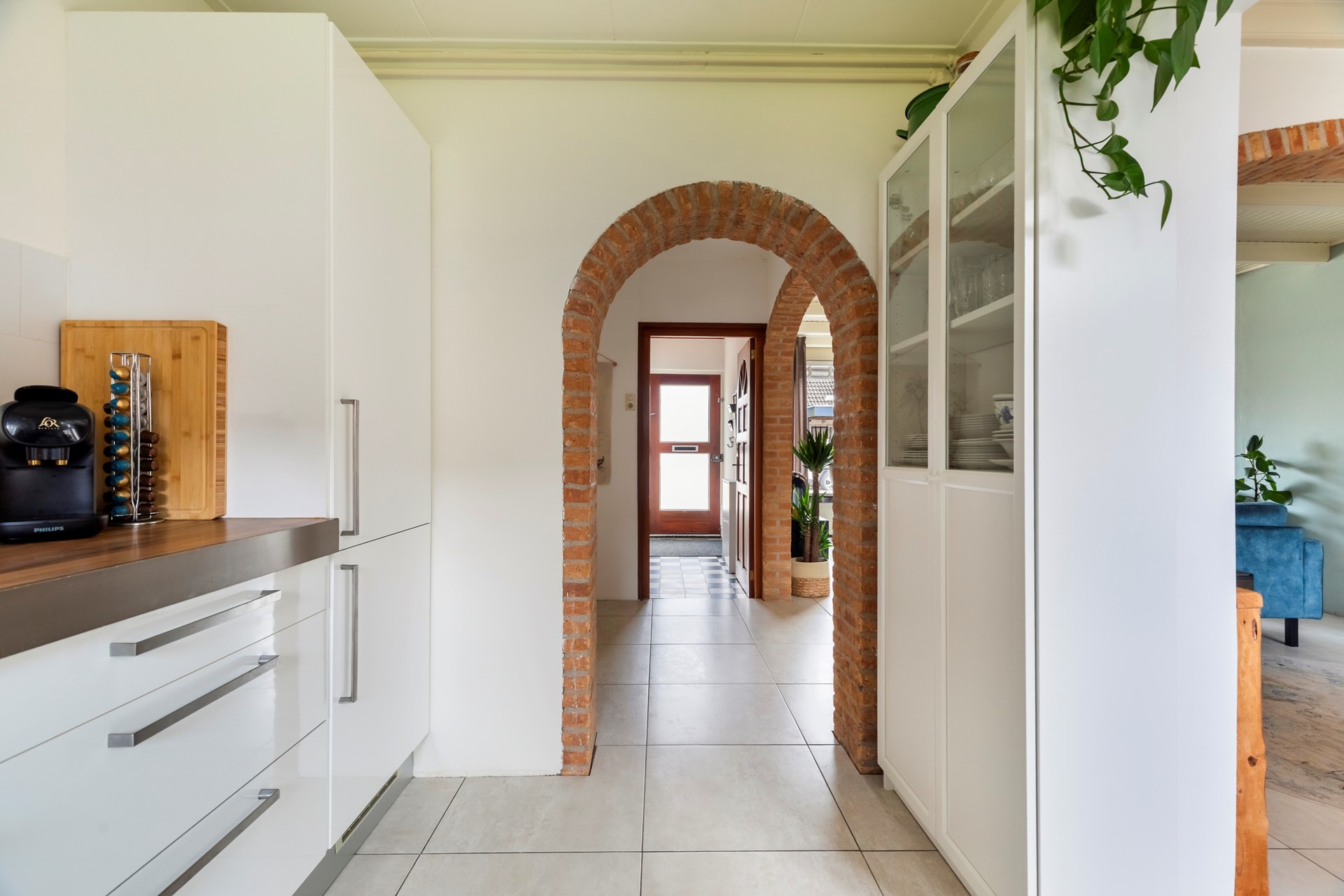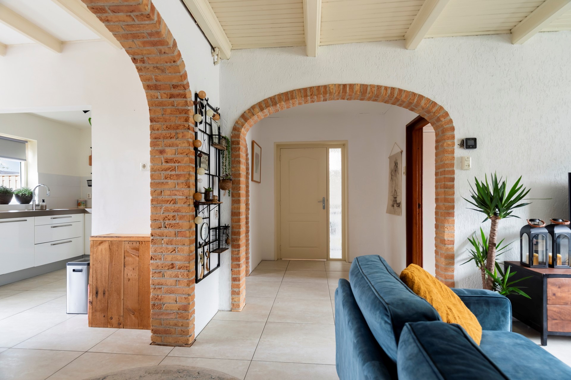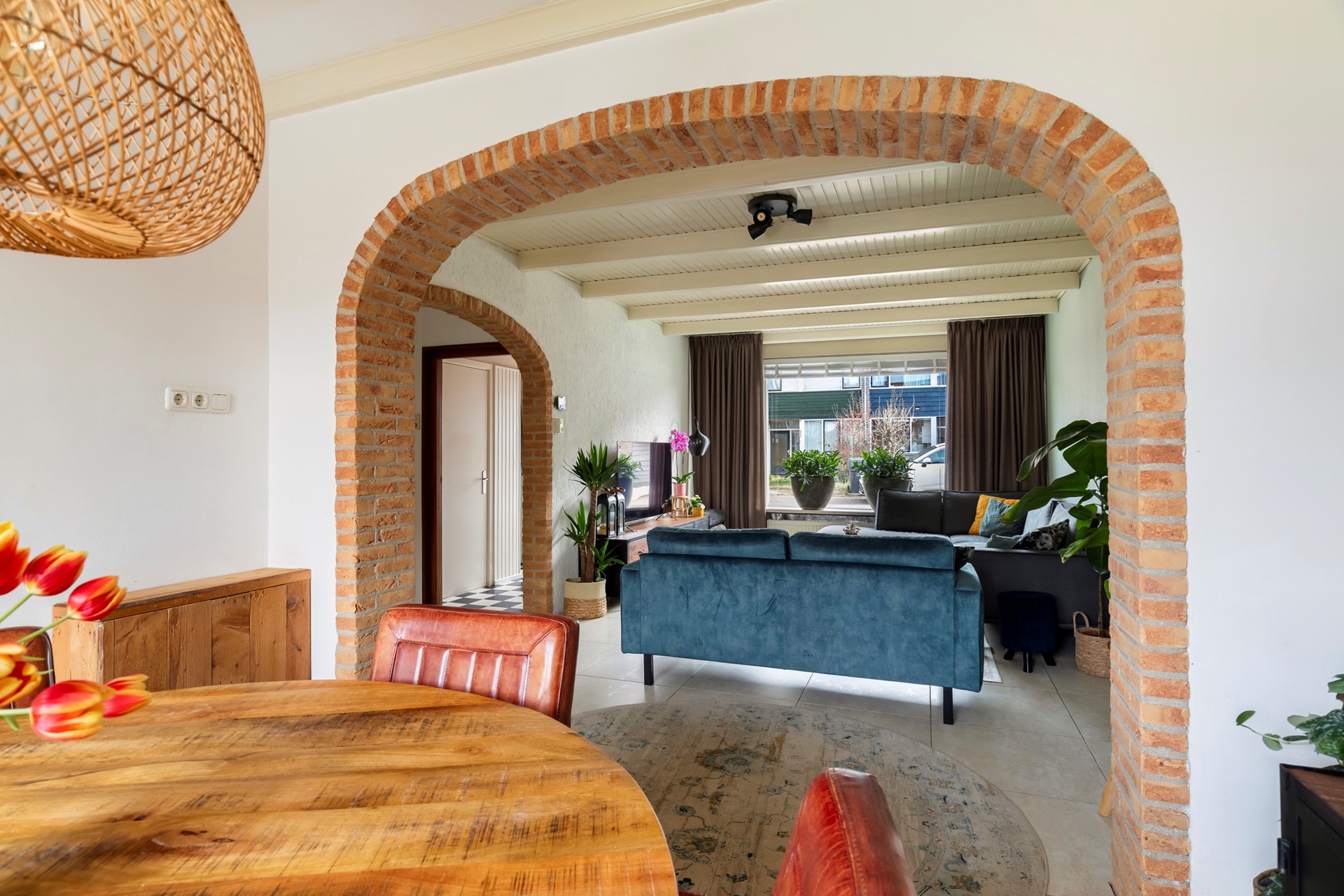 Via de entree kom je in de hal met meterkast, trapopgang en praktische trapkast. Vanuit hier stap je de woonkamer binnen, die dankzij de uitbouw een fijne en ruime leefruimte biedt. De plavuizenvloer met vloerverwarming zorgt voor extra comfort. De woonkamer staat in directe verbinding met de tuin door de openslaande deuren, waardoor binnen en buiten mooi in elkaar overlopen.