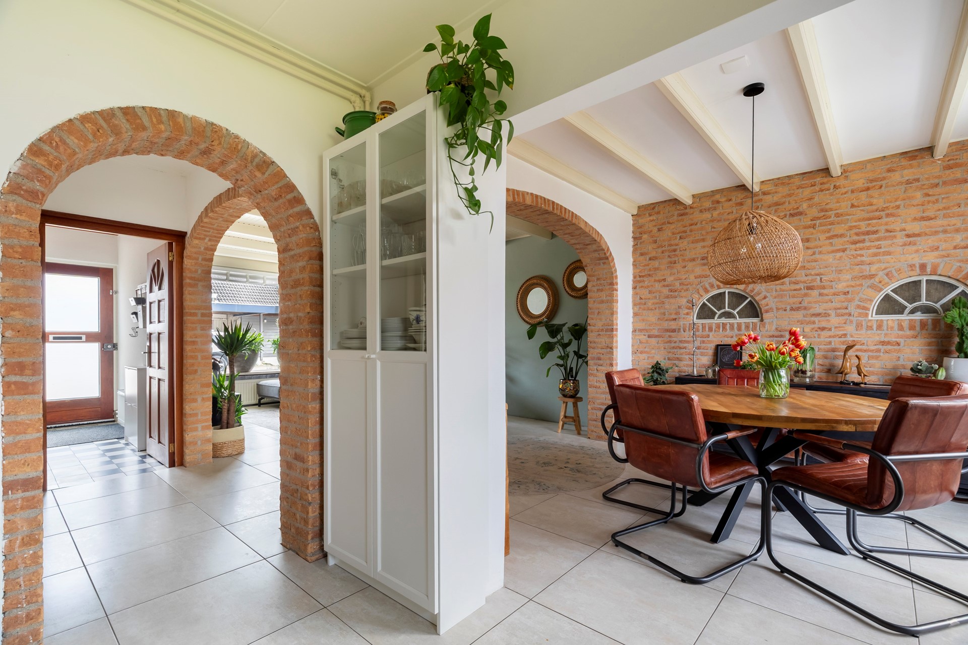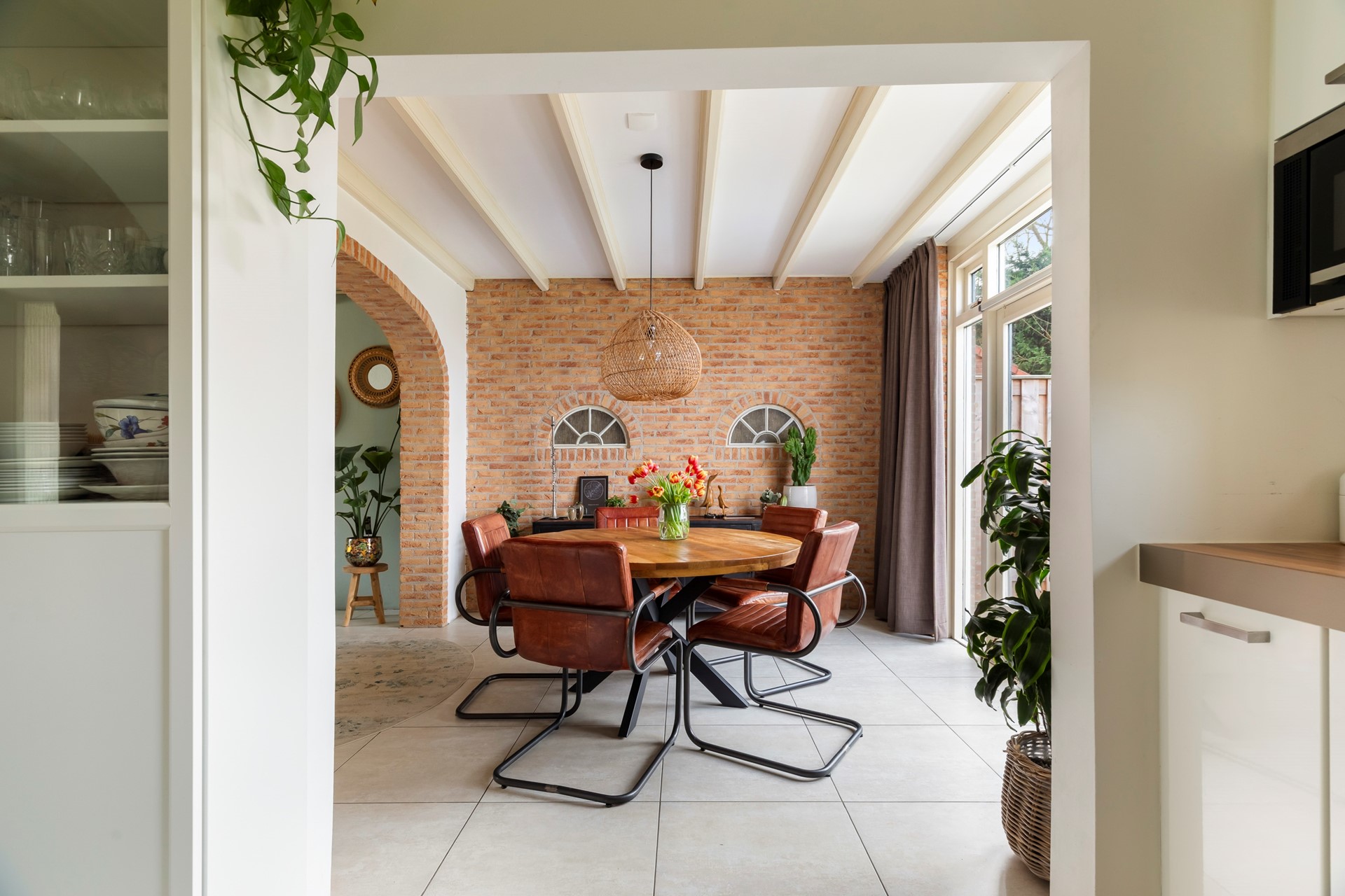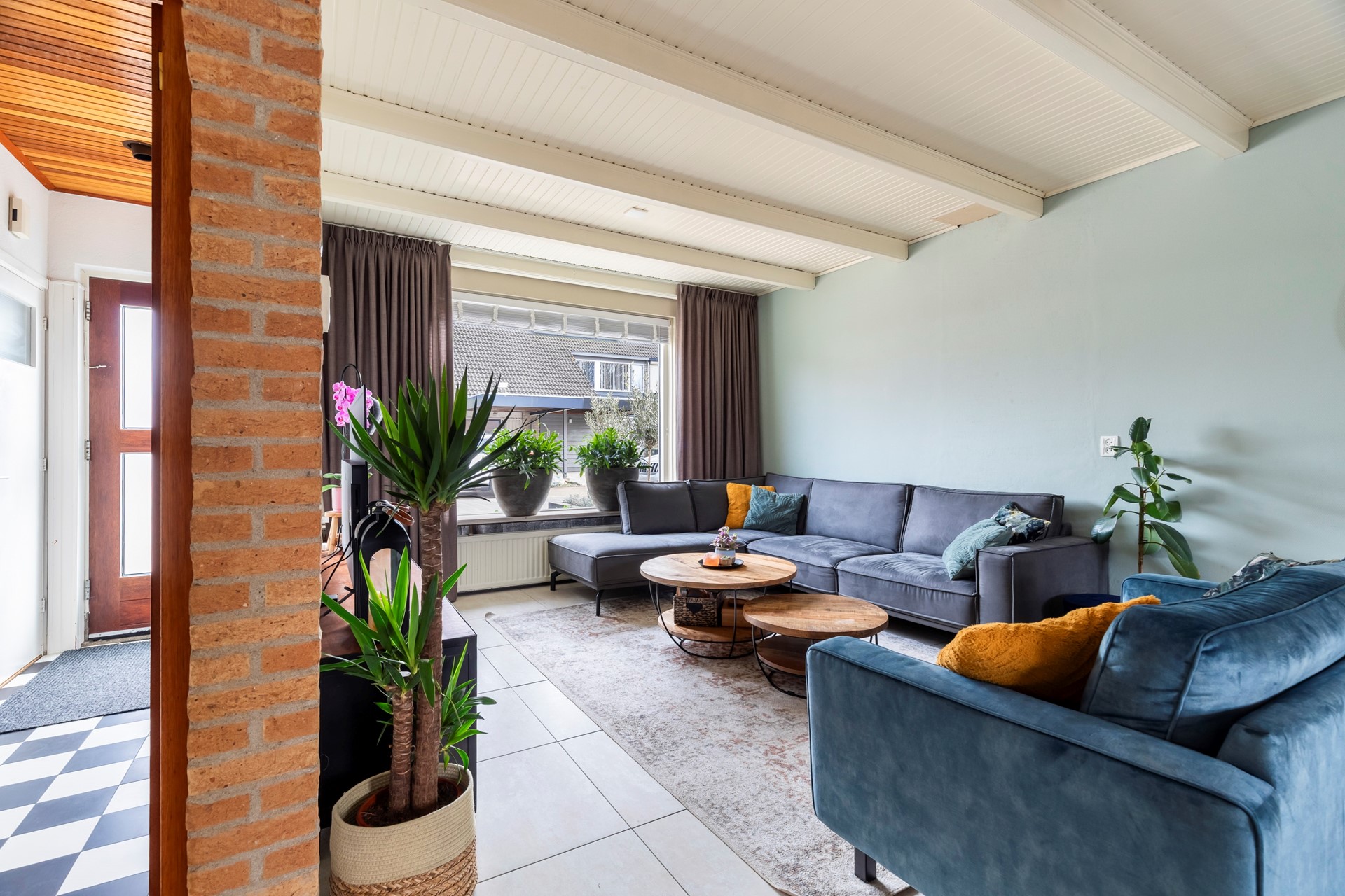 Via de entree kom je in de hal met meterkast, trapopgang en praktische trapkast. Vanuit hier stap je de woonkamer binnen, die dankzij de uitbouw een fijne en ruime leefruimte biedt. De plavuizenvloer met vloerverwarming zorgt voor extra comfort. De woonkamer staat in directe verbinding met de tuin door de openslaande deuren, waardoor binnen en buiten mooi in elkaar overlopen.