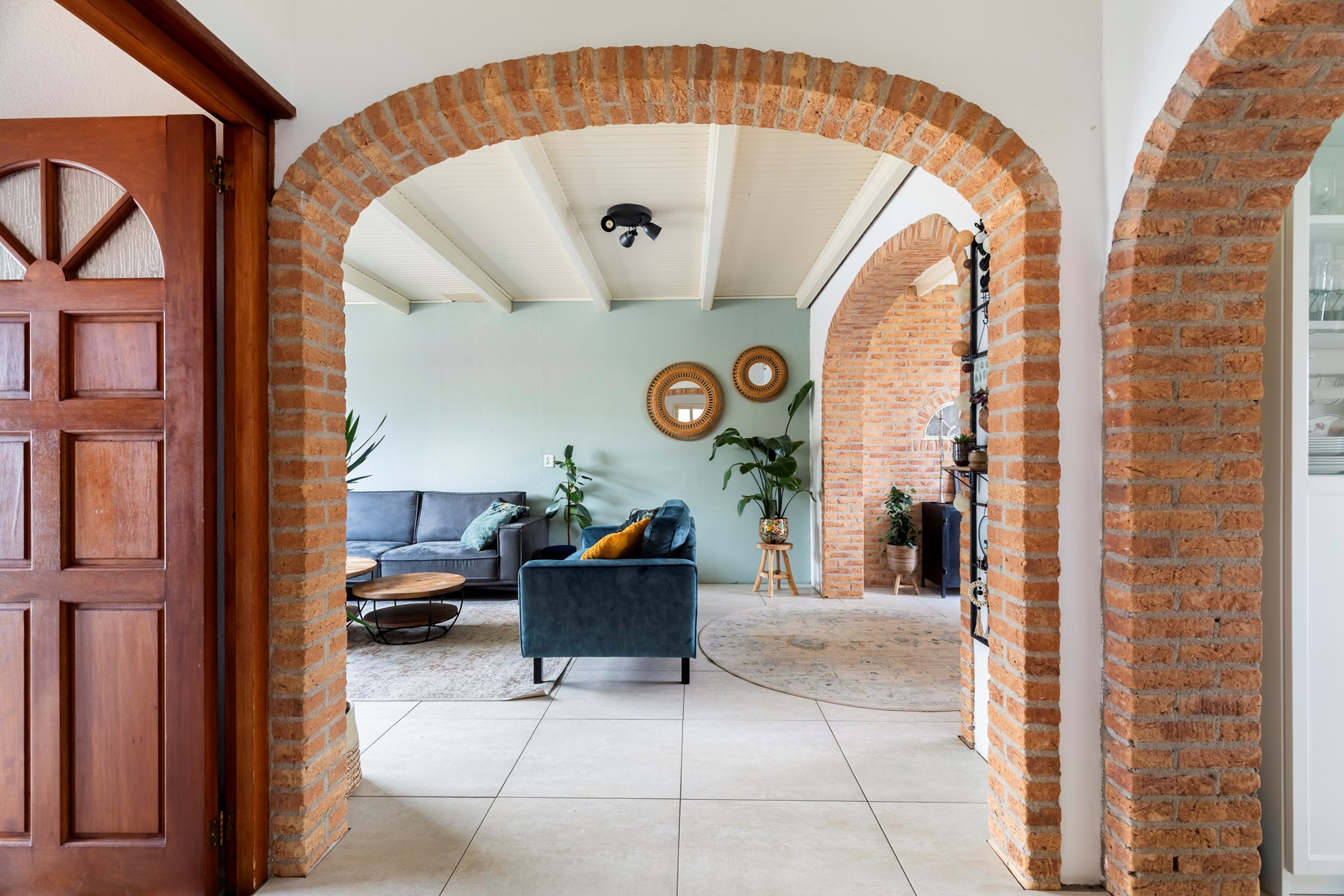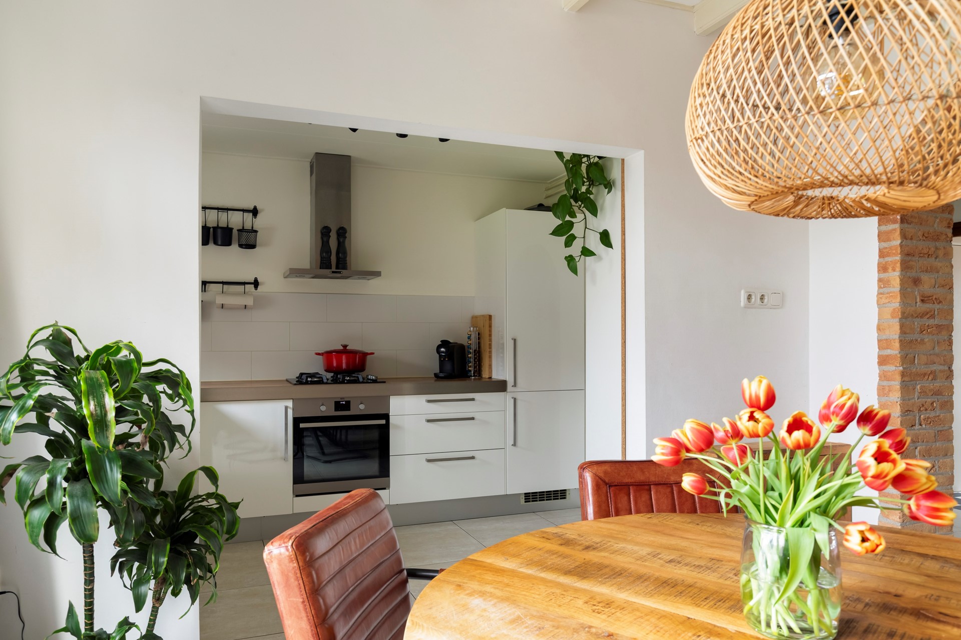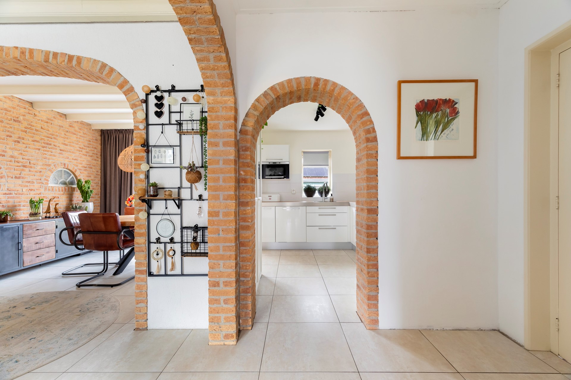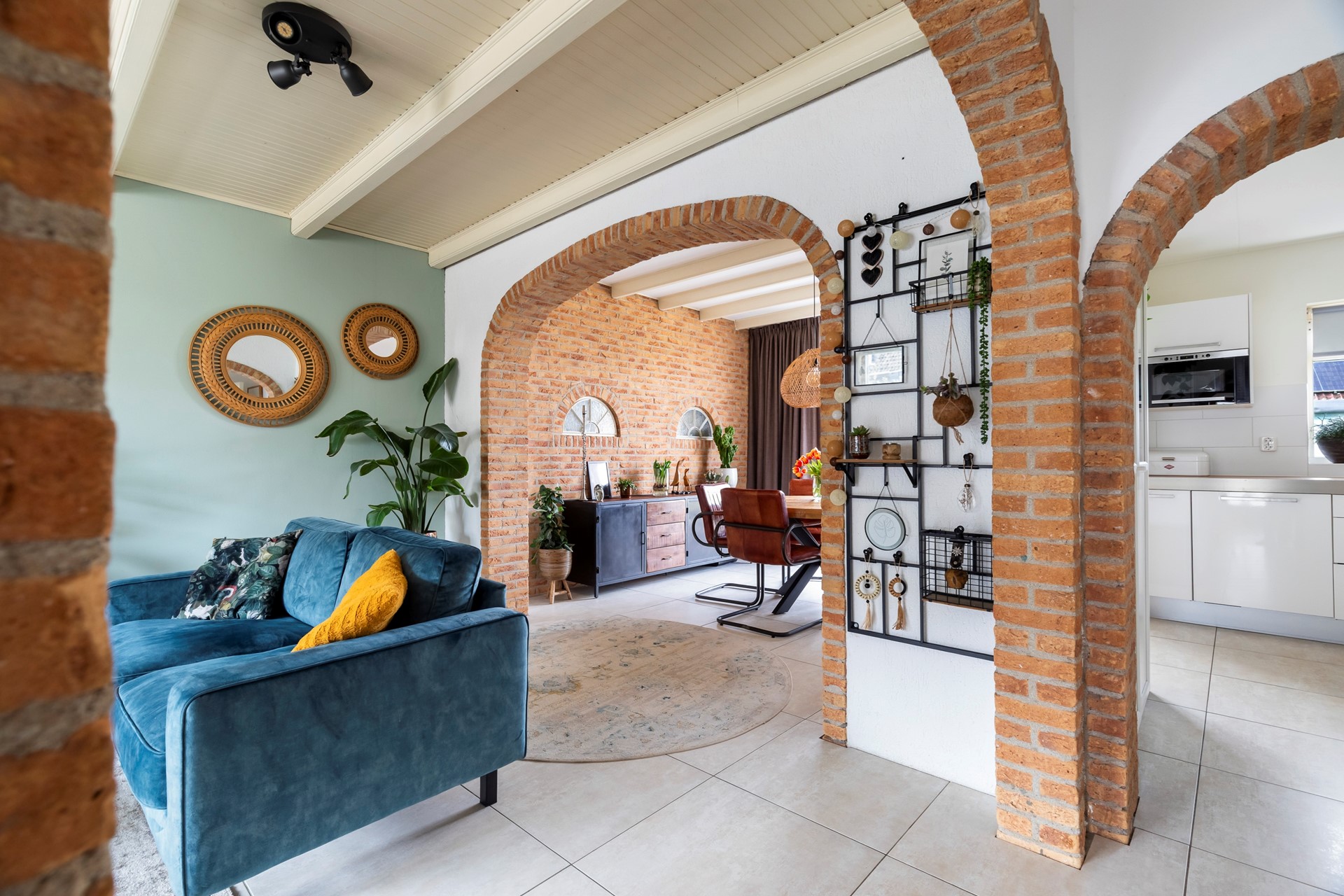 Via de entree kom je in de hal met meterkast, trapopgang en praktische trapkast. Vanuit hier stap je de woonkamer binnen, die dankzij de uitbouw een fijne en ruime leefruimte biedt. De plavuizenvloer met vloerverwarming zorgt voor extra comfort. De woonkamer staat in directe verbinding met de tuin door de openslaande deuren, waardoor binnen en buiten mooi in elkaar overlopen.