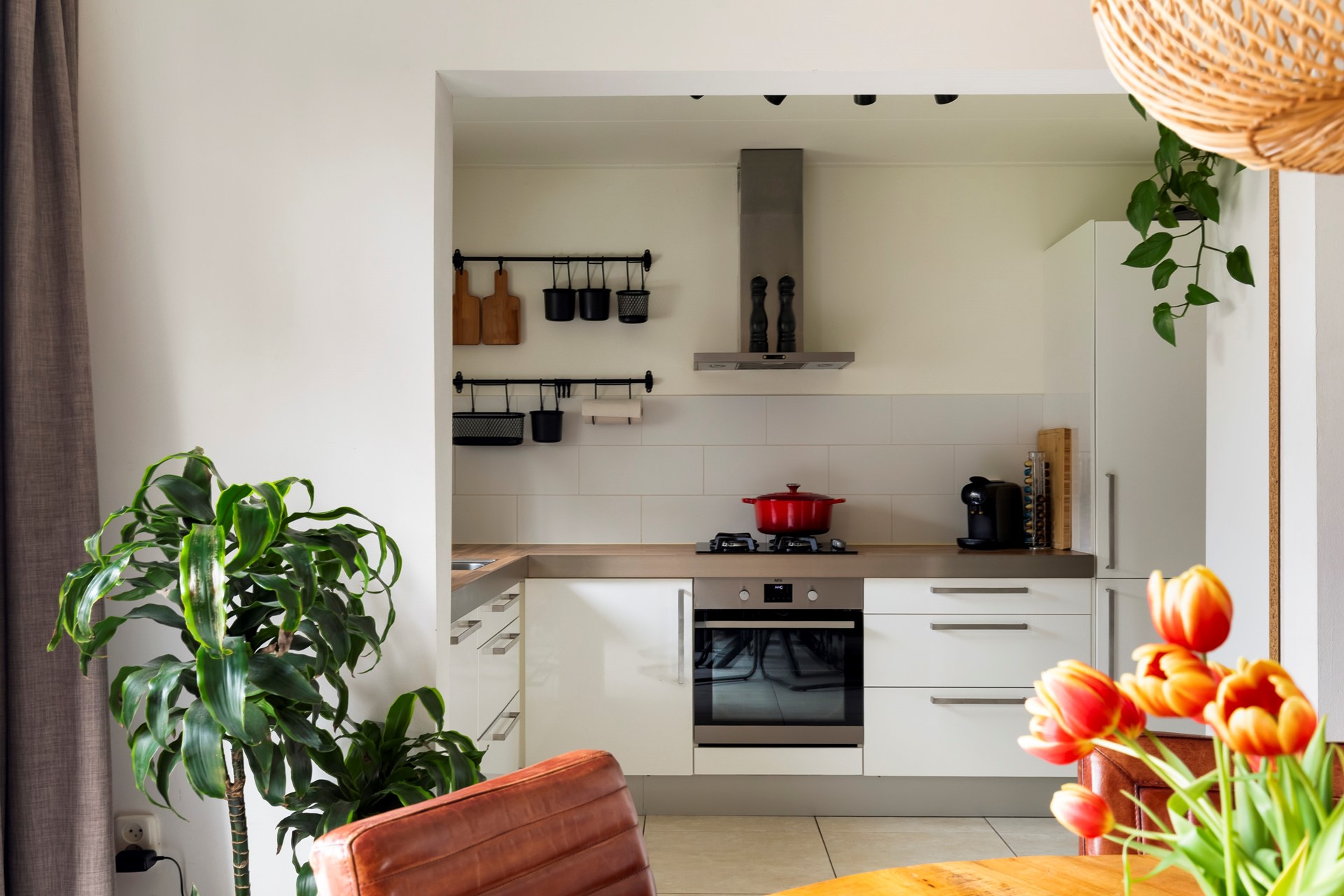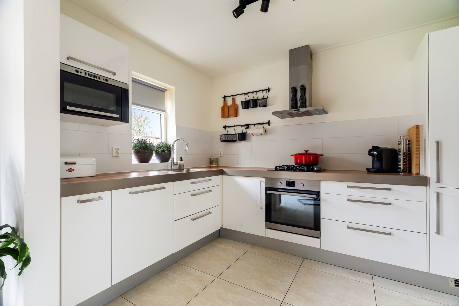 - Keuken met 4-pits gaskookplaat, afzuigkap, vaatwasser, koelkast, vriezer en magnetron