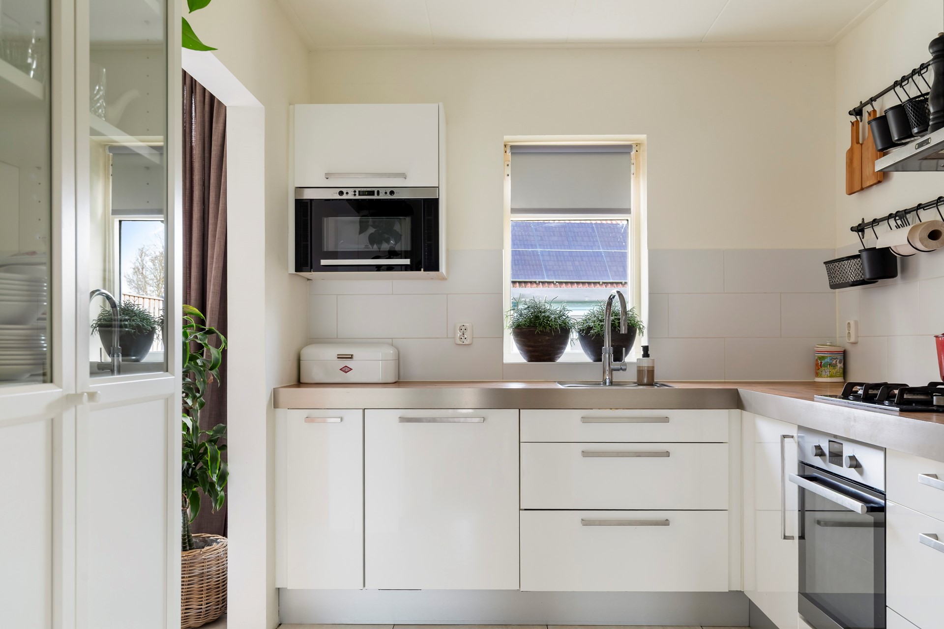 De keuken is praktisch ingericht en voorzien van diverse inbouwapparatuur, waaronder een 4-pits gaskookplaat, afzuigkap, vaatwasser, koelkast, vriezer en magnetron. Op de begane grond bevindt zich tevens de badkamer, uitgerust met een douche/badcombinatie, toilet en wastafelmeubel.