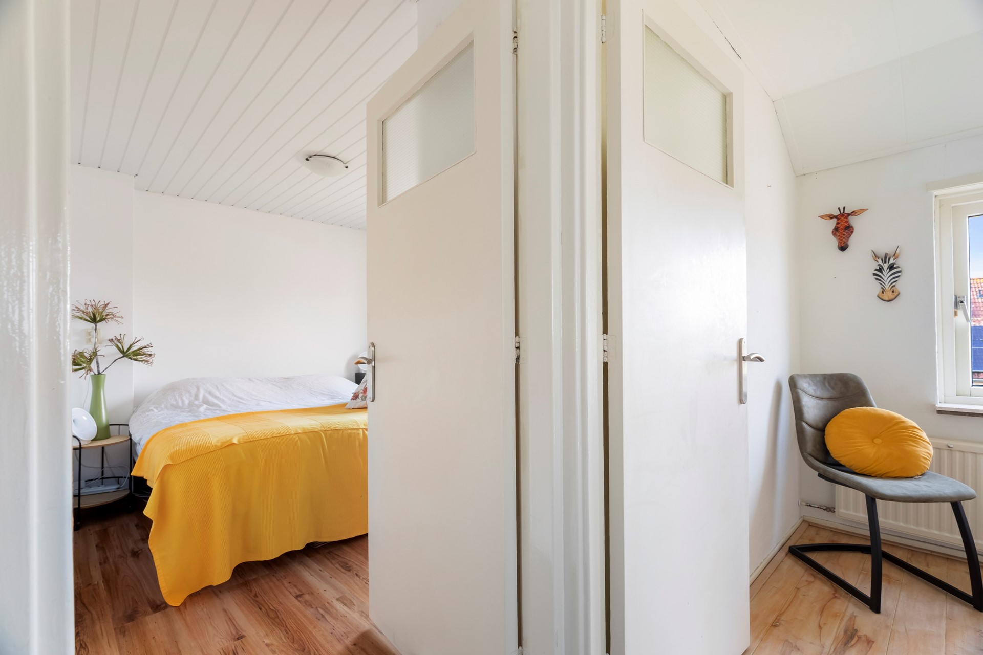 De overloop geeft toegang tot drie slaapkamers, een praktische inloopkast en de vaste trap naar de vliering. De kamers zijn veelzijdig te gebruiken als slaap-, werk- of hobbyruimte en bieden voldoende mogelijkheden voor verschillende woonwensen.