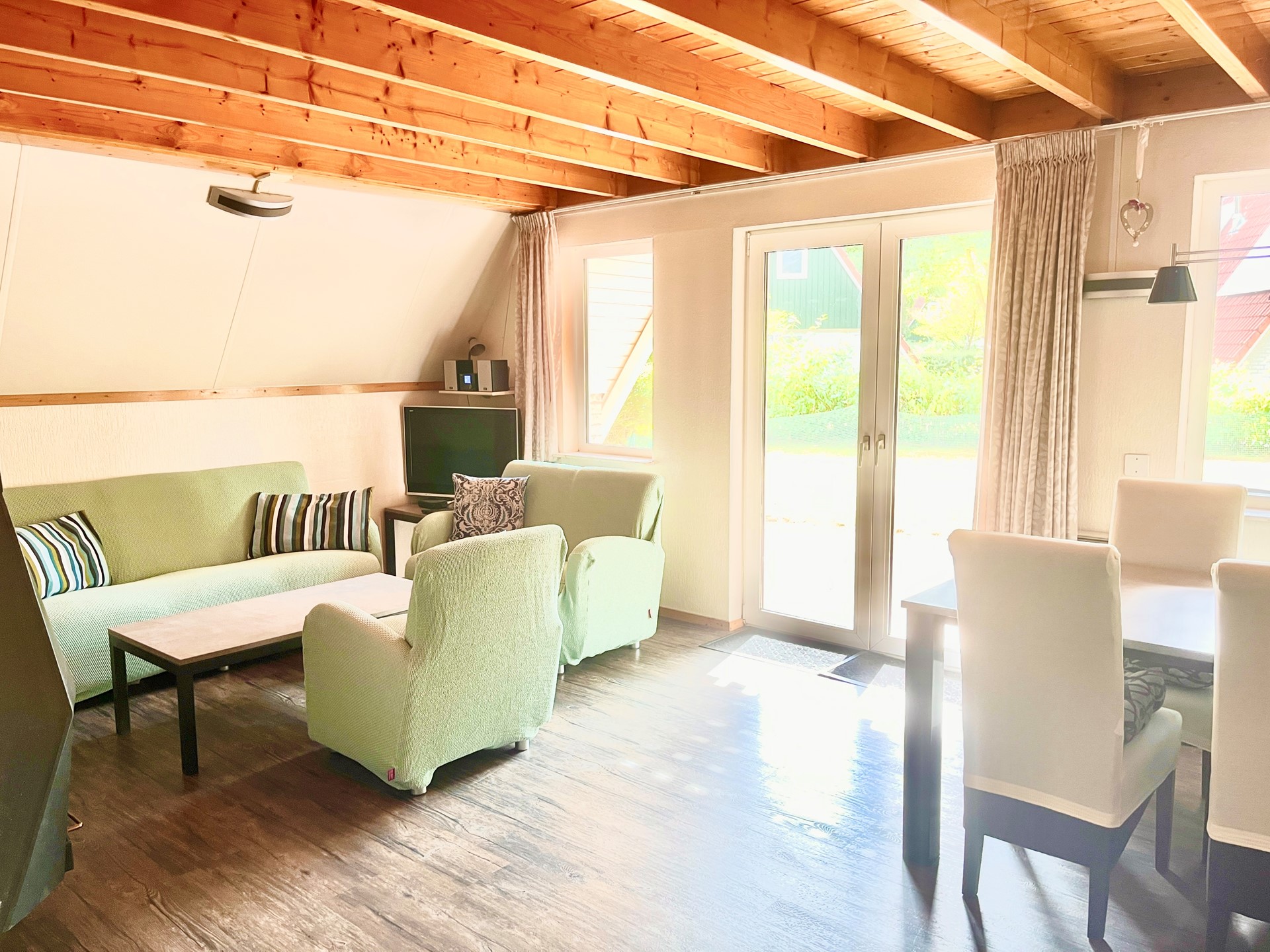 De woonkamer heeft vrij uitzicht over een ruim grasveld en een leuke zit- en eethoek met modern interieur. De gerenoveerde open keuken is voorzien van o.a. een koelkast met vriesvak, inductiekookplaat, vaatwasser en losse combimagnetron.