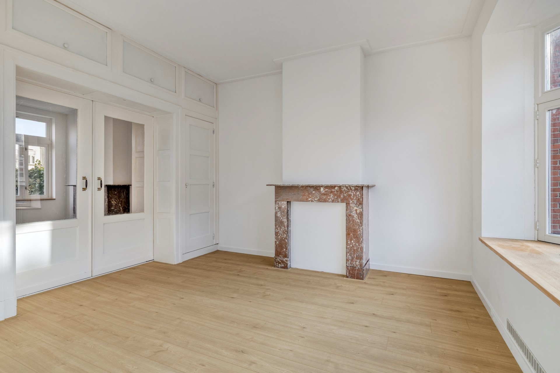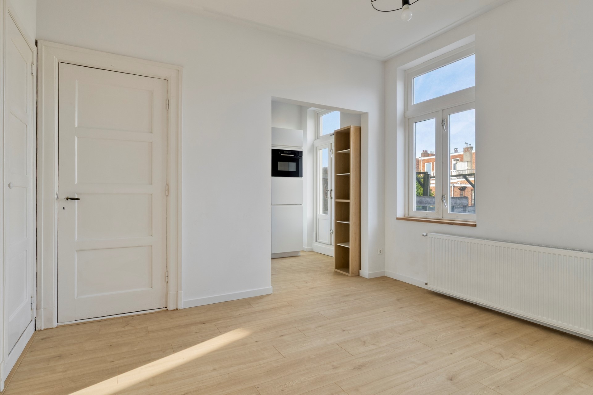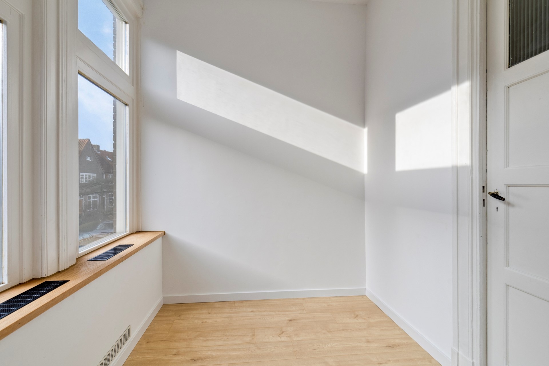 Bij binnenkomst valt direct de lichte en sfeervolle woonkamer ensuite op. Dankzij de karakteristieke erker en de grote raampartijen geniet je hier van heerlijk veel lichtinval. De originele sfeer wordt versterkt door de stijlvolle schouwen, wat het geheel een warme uitstraling geeft. Alle verwarmingsradiatoren zijn nieuw. De half open keuken is modern uitgevoerd en voorzien van hoekopstelling met diverse inbouwapparatuur. De gehele keuken is splinternieuw. Vanuit de keuken heb je toegang tot een klein dakterrasje. Aan de voorzijde bevindt zich een extra kamer, ideaal als werkplek, hobbyruimte of logeerkamer. Deze ruimte is zowel vanuit de woonkamer als vanuit de hal bereikbaar, wat zorgt voor extra flexibiliteit.