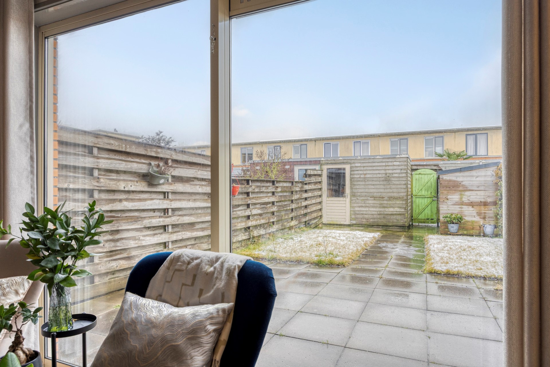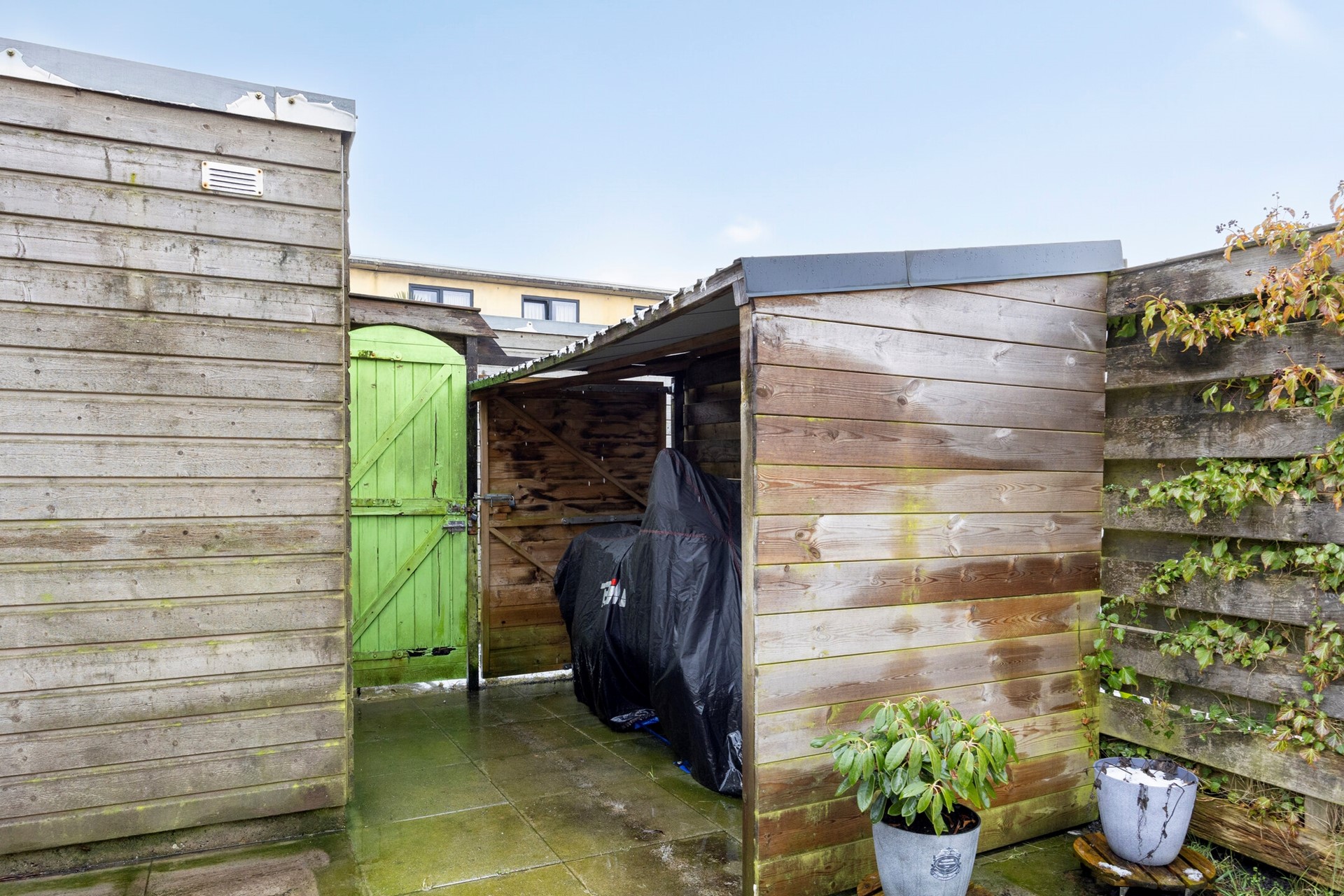 Via de schuifpui bereik je de zonnige achtertuin op het zuiden. Deze is deels betegeld en deels voorzien van gras, waardoor er een fijne combinatie is van terras en groen. De tuin beschikt daarnaast over een achterom en een praktische berging met ruimte voor meerdere fietsen en tuingereedschap.