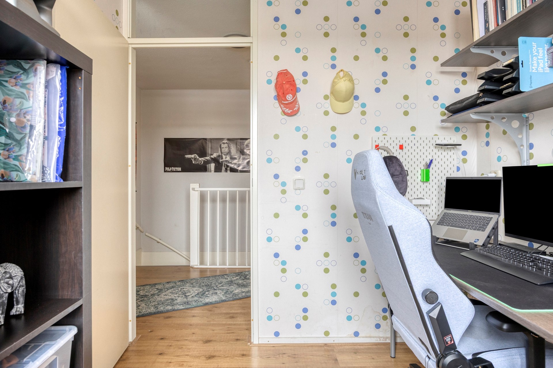 Op de eerste verdieping bevinden zich drie slaapkamers van circa 13 m², 7,5 m² en 6,5 m². De grootste slaapkamer ligt aan de voorzijde en is eveneens voorzien van een airco met koel- en verwarmingsfunctie. De moderne badkamer van circa 4,5 m² is in 2023 volledig gerenoveerd en beschikt over een douche, tweede toilet, wastafelmeubel en handdoekradiator. Op de overloop zijn tevens de aansluitingen voor de wasmachine en droger aanwezig.