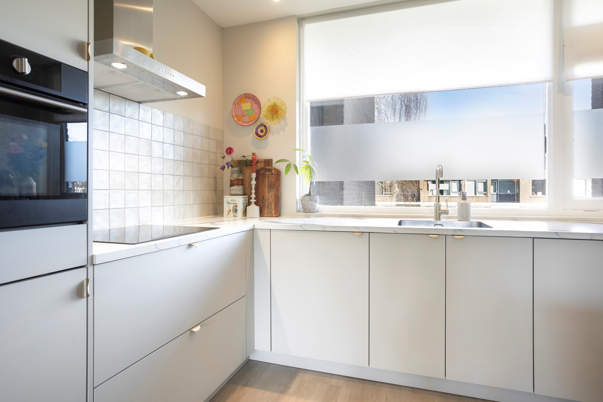 De woonkamer met open keuken is circa 33 m² groot. Dankzij de grote raampartijen geniet je hier van een prettige lichtinval. Wat dit appartement uniek maakt ten opzichte van andere woningen in het complex, is de slimme herindeling: in 2022 is er een volledig nieuwe, grote keuken geplaatst in de voormalige eetkamer. Zo is er optimaal gebruik gemaakt van de ruimtes.