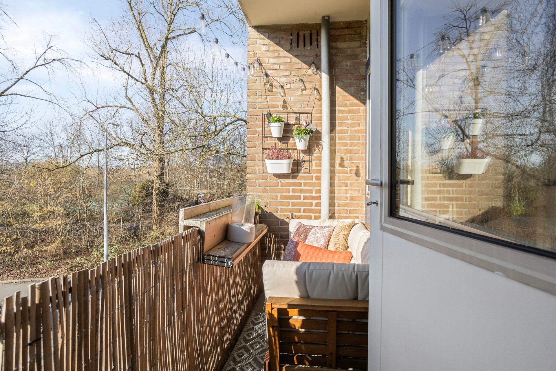 Vanuit de woonkamer is het balkon te bereiken, waar je een rustig uitzicht hebt op het omliggende groen. Zowel in de middag als avond geniet je van de zon op het balkon. De dag starten met een kop koffie in de ochtendzon kan juist goed aan de voorkant van het appartement, op de galerij.