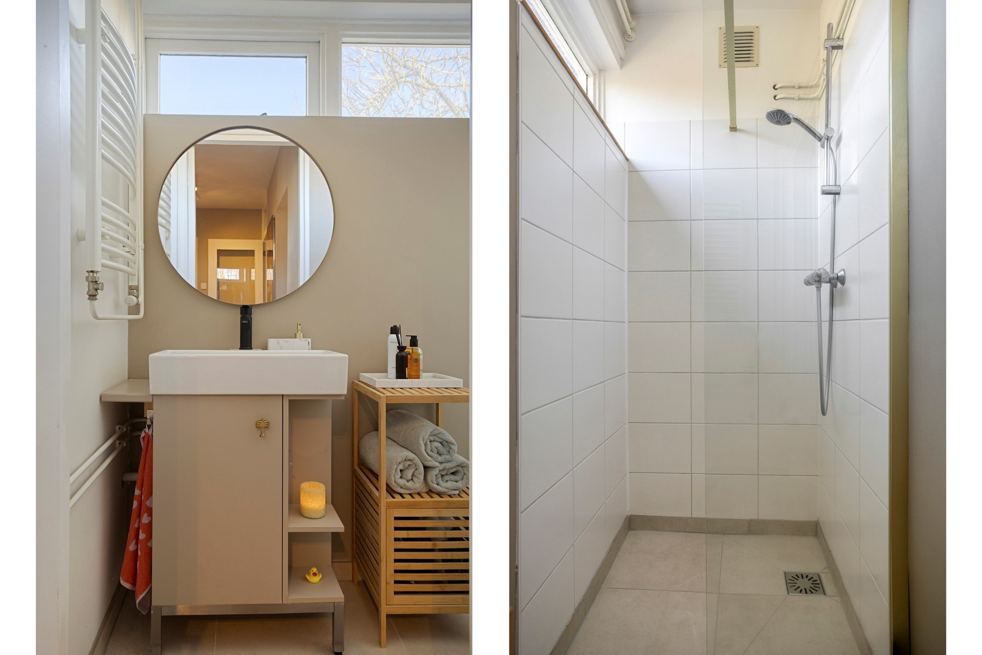 De twee slaapkamers zijn beide circa 8 m² groot. Eén van de slaapkamers biedt ook toegang tot het balkon. De badkamer is circa 3 m² groot, verkeert in nette staat en is voorzien van een wastafel en inloopdouche met glaswand. Het toilet bevindt zich separaat van de badkamer. In het souterrain van het complex bevindt zich bovendien een eigen inpandige berging van circa 8 m².
