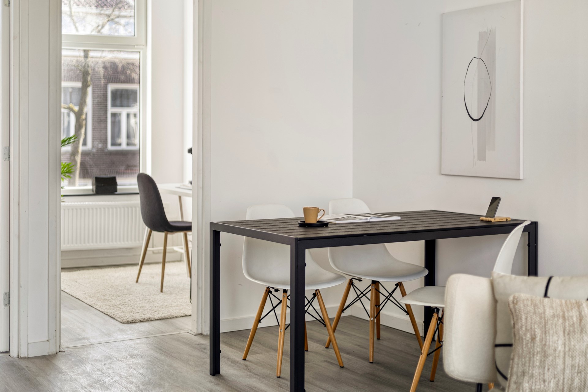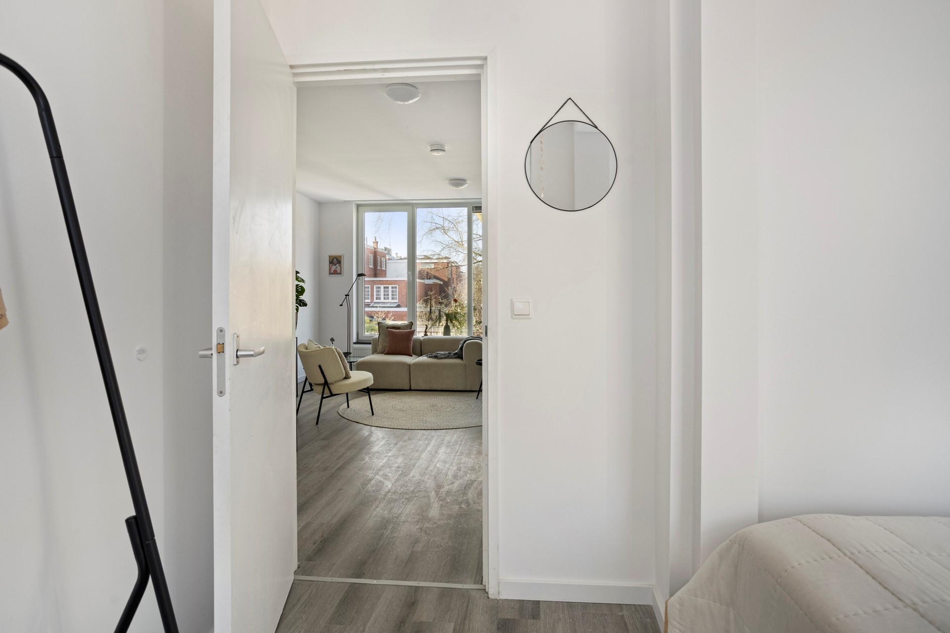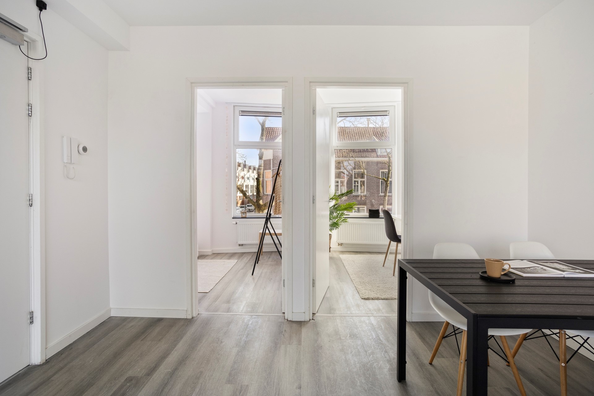 Via de gezamenlijke entree met nummer 24b op de begane grond bereik je de trap naar de eerste verdieping. Hier bevindt zich de voordeur van het appartement. Je komt binnen in de lichte en sfeervolle woonkamer met open keuken. Dankzij de grote ramen geniet de ruimte van een prettige, natuurlijke lichtinval.
