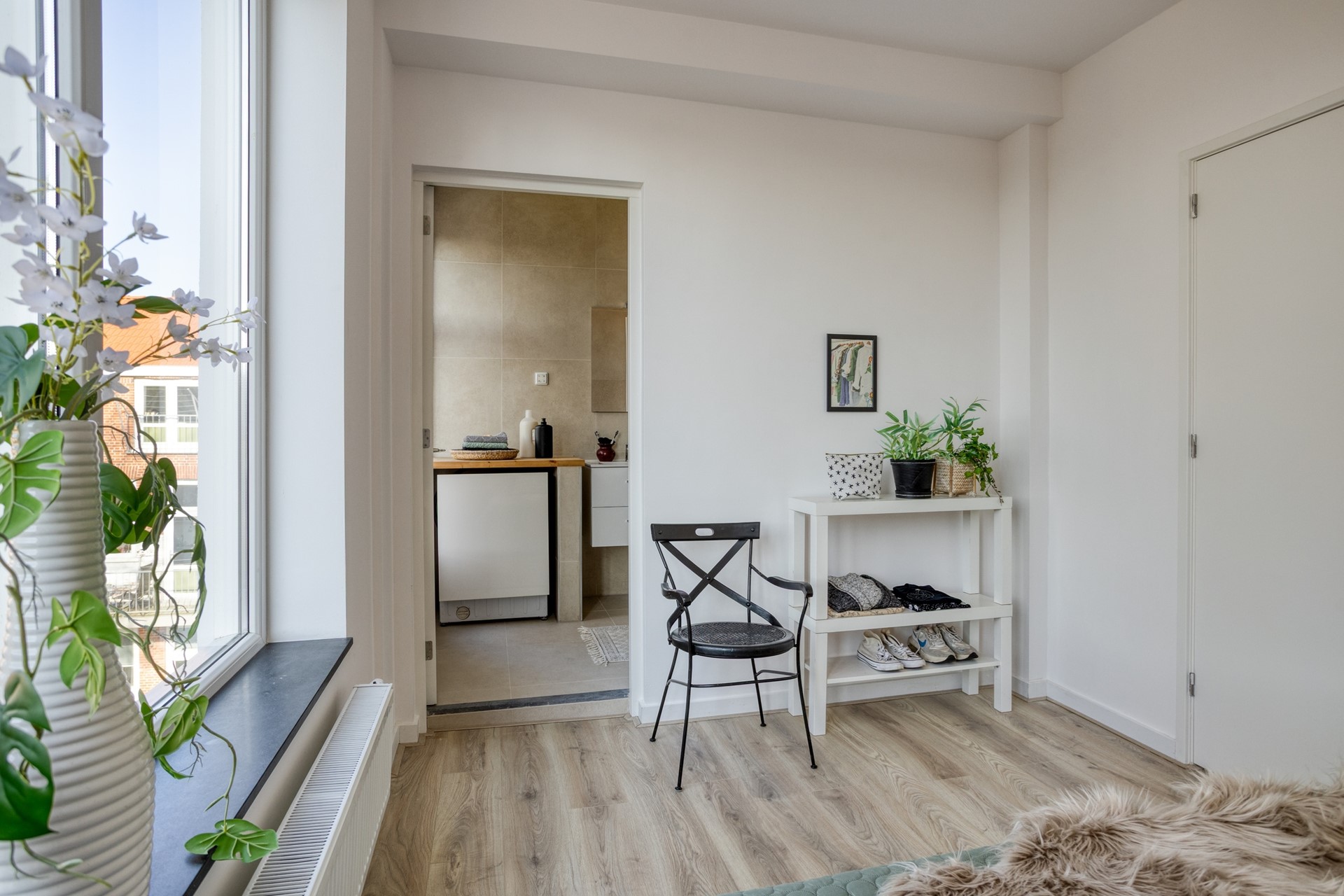 Via de gezamenlijke entree op de begane grond bereik je de trap naar de tweede verdieping, waar de entree van het appartement zich bevindt. Binnenkomst is in de lichte woonkamer met open keuken, waar de combinatie van grote ramen en een lichtkoepel zorgt voor een aangename en ruimtelijke sfeer. De indeling is praktisch en verzorgd, met vanuit de woonkamer toegang tot de slaapkamer, die beschikt over een en-suite badkamer met luxe afwerking. De keuken is geplaatst in 2020 en verkeert in goede staat, terwijl de rest van het appartement in 2026 grondig is gemoderniseerd. Vanuit de woonkamer stap je zo het balkon op, een fijne plek om even buiten te zitten.