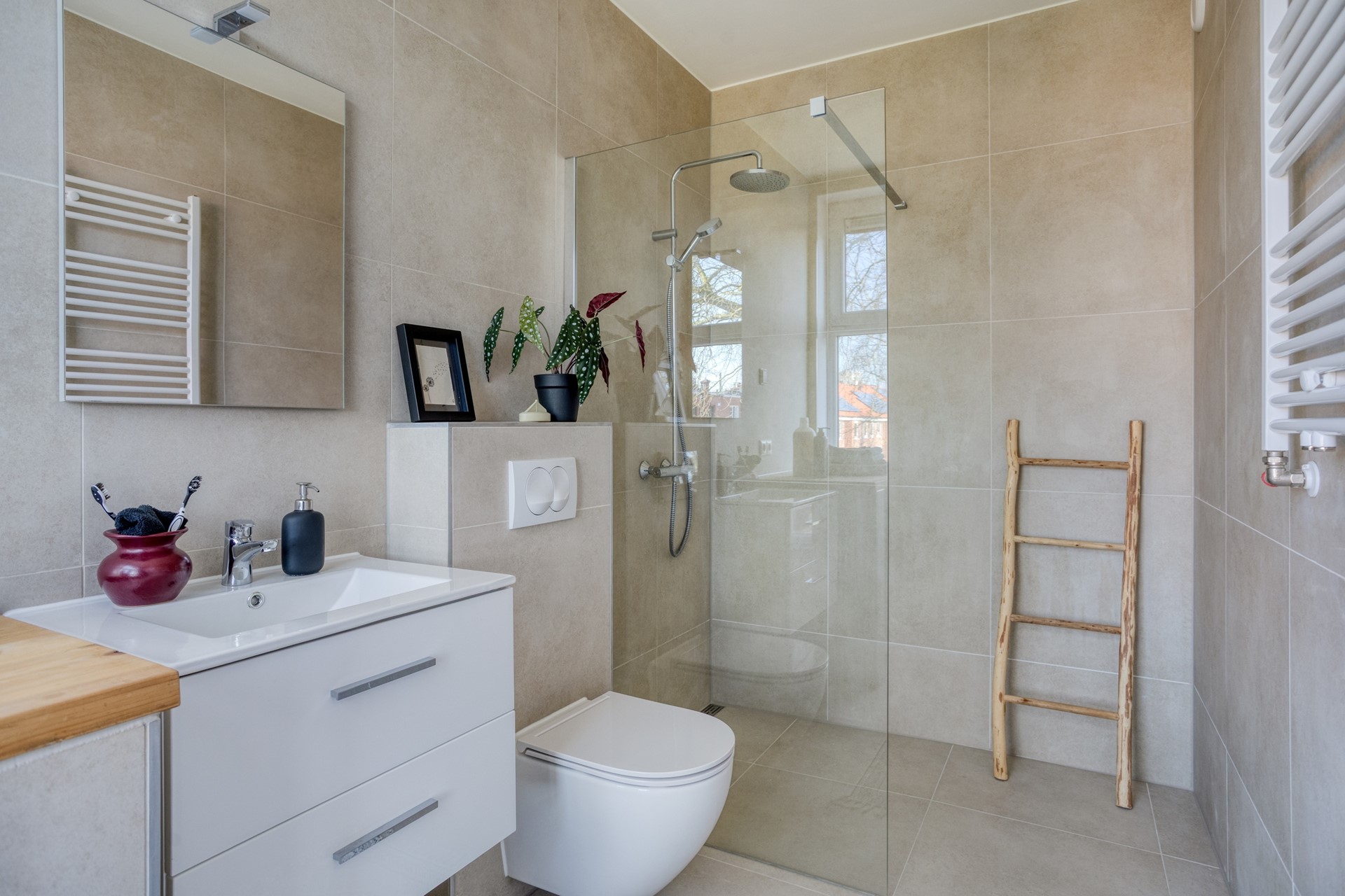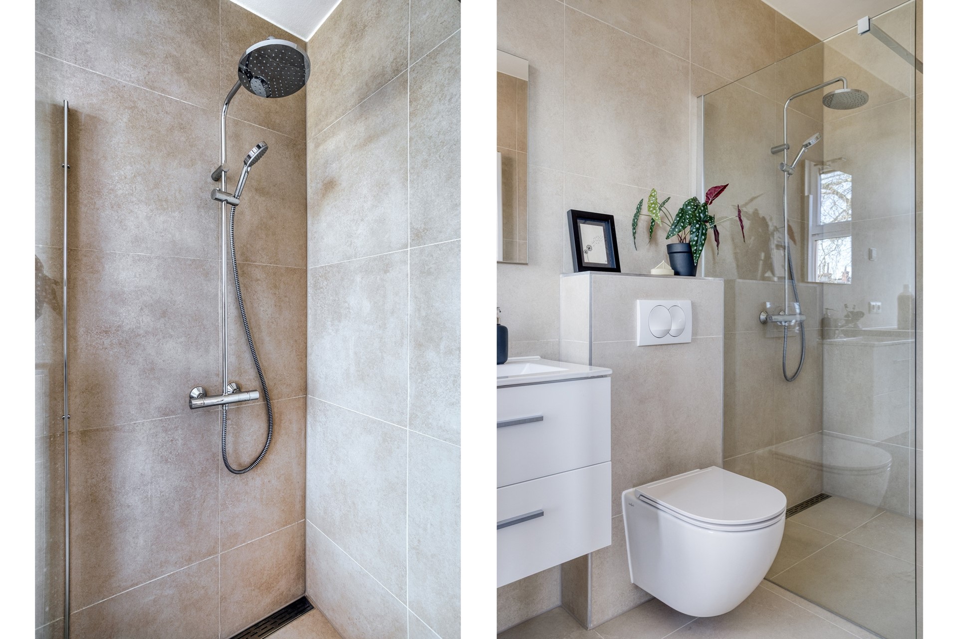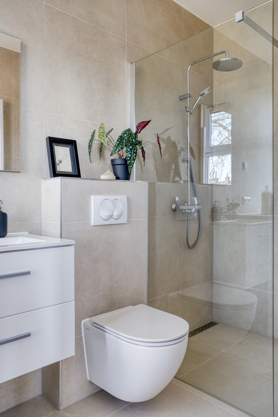 Badkamervoorzieningen Inloopdouche, Toilet, Wasmachineaansluiting, Wastafel, Wastafelmeubel