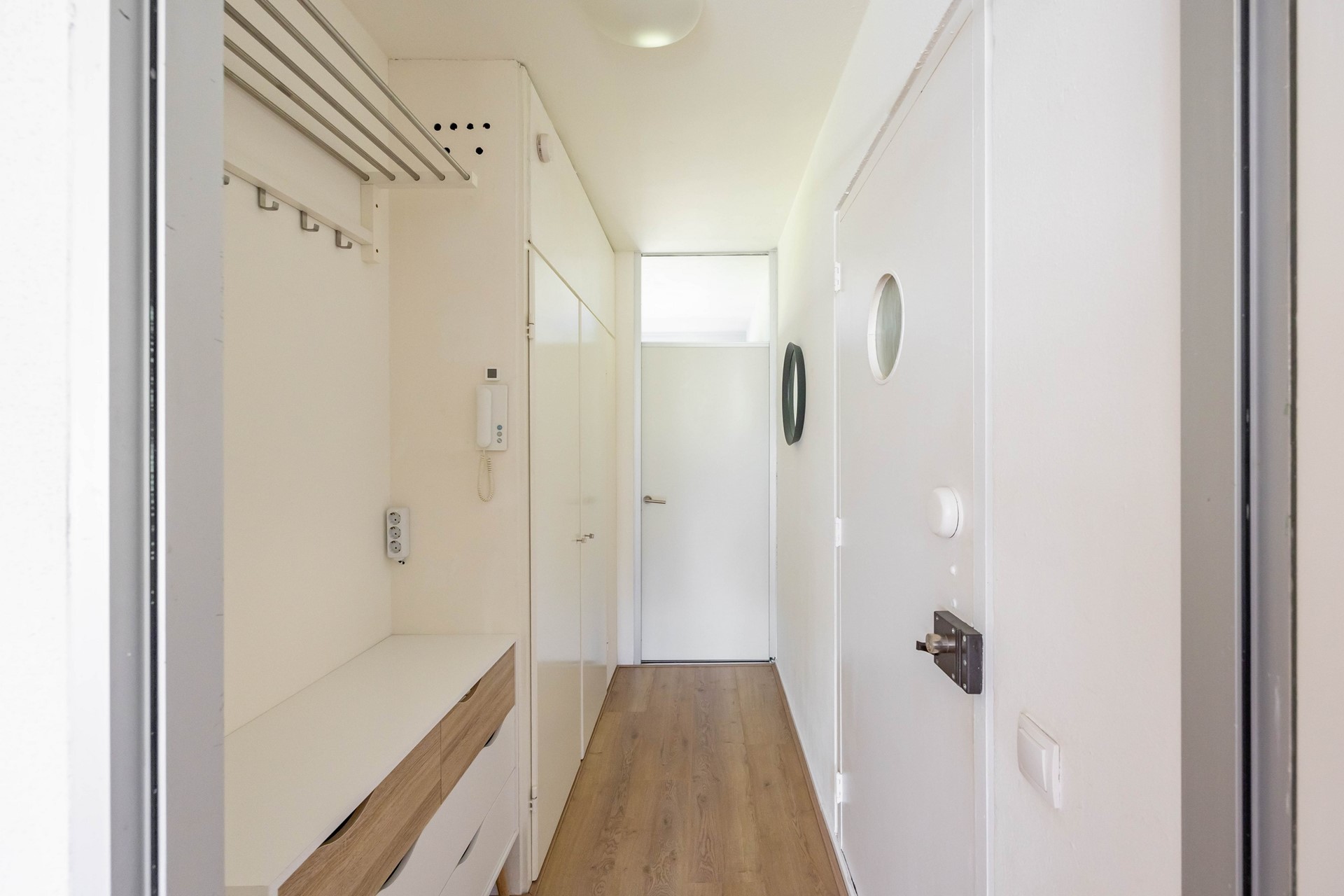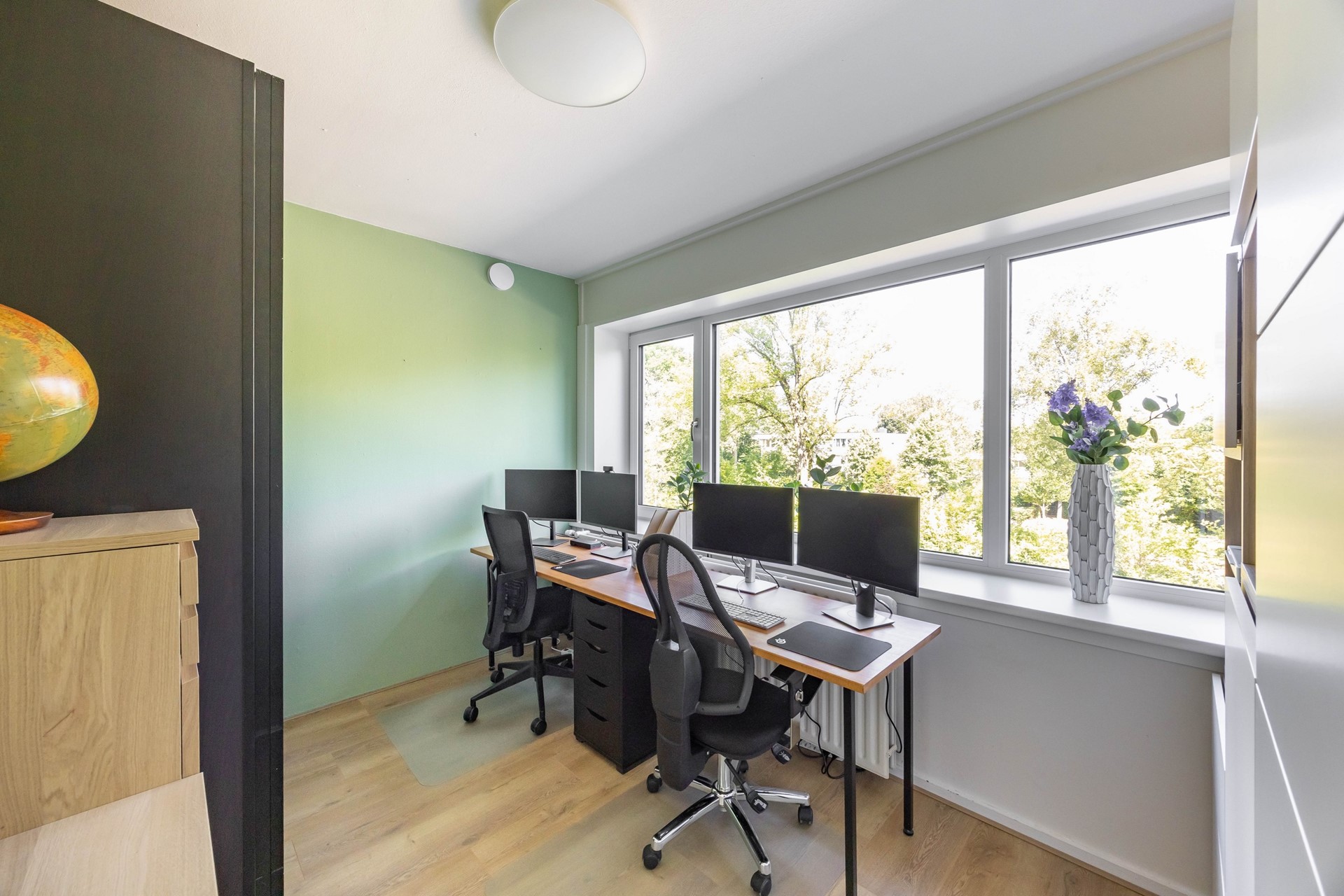 Bij binnenkomst tref je een berg- en meterkast en een kamer die nu als werkkamer is ingericht, ook te gebruiken als extra slaapkamer.