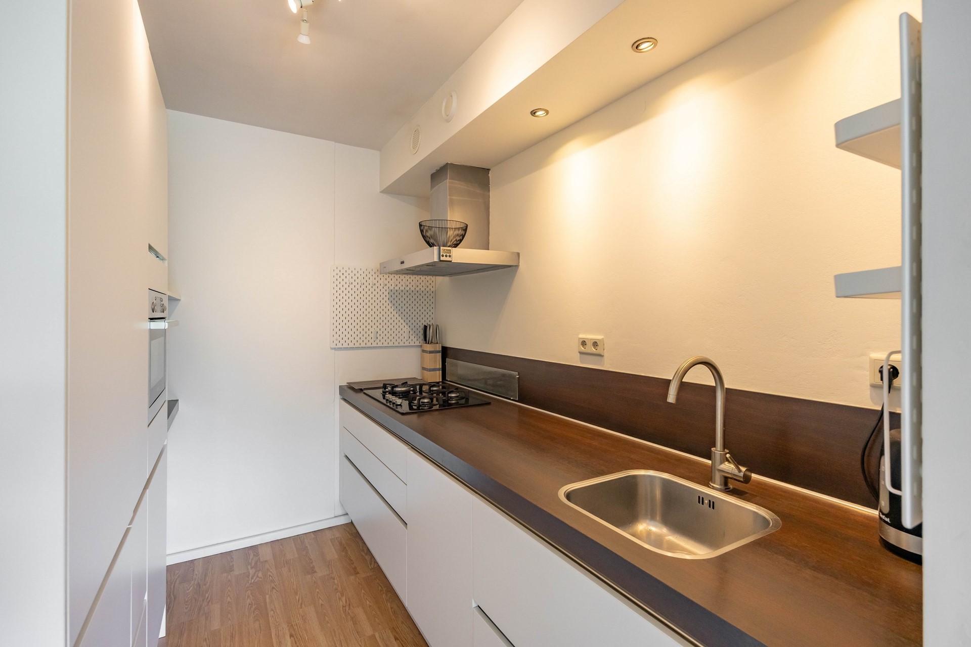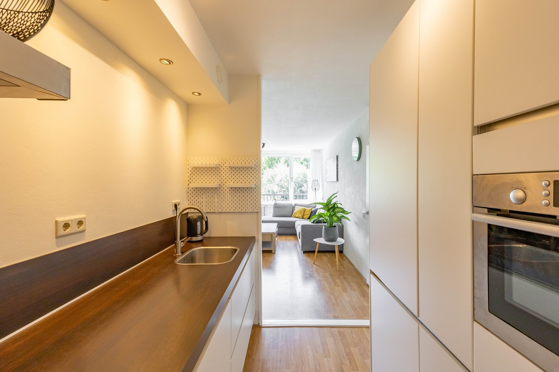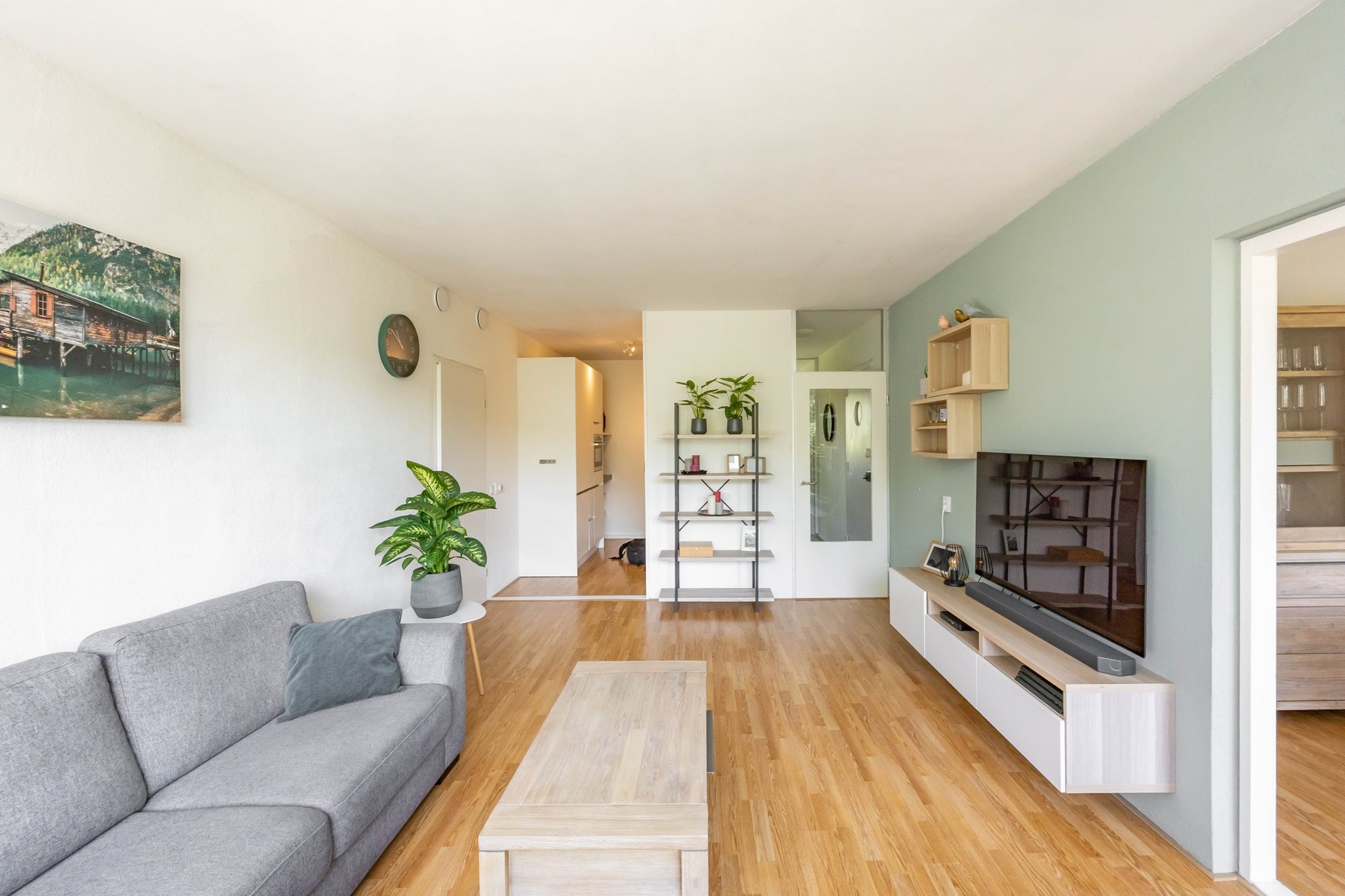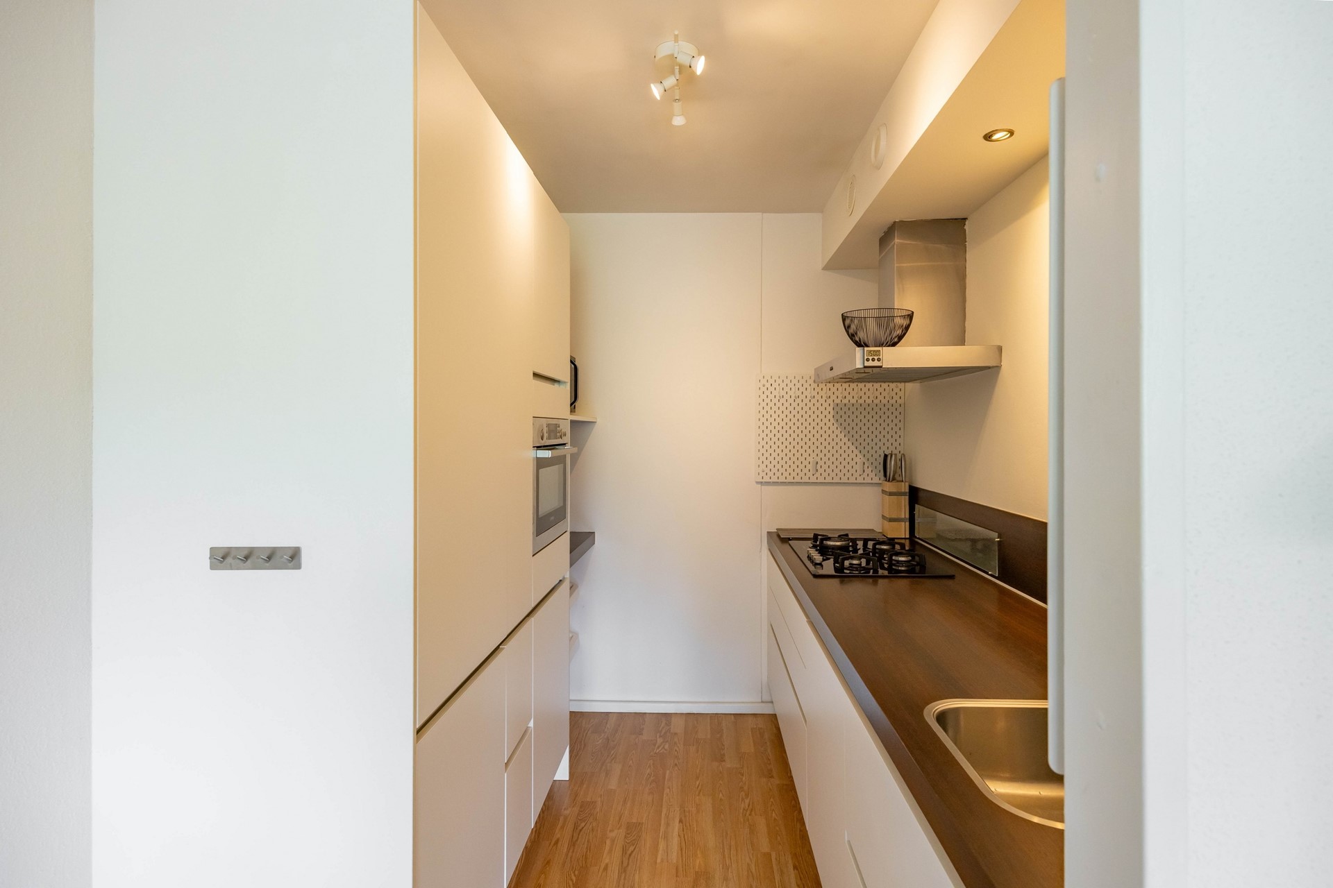 Vanuit de hal kom je in de ruime woonkamer die volop daglicht krijgt door de grote ramen. Aangrenzend bevindt zich een zijkamer met toegang tot het zonnige balkon op het zuiden. Deze kamer wordt momenteel als eetkamer gebruikt en is eenvoudig om te bouwen tot extra slaapkamer. De woonkamer heeft een open verbinding met de moderne keuken is en voorzien van diverse apparatuur.