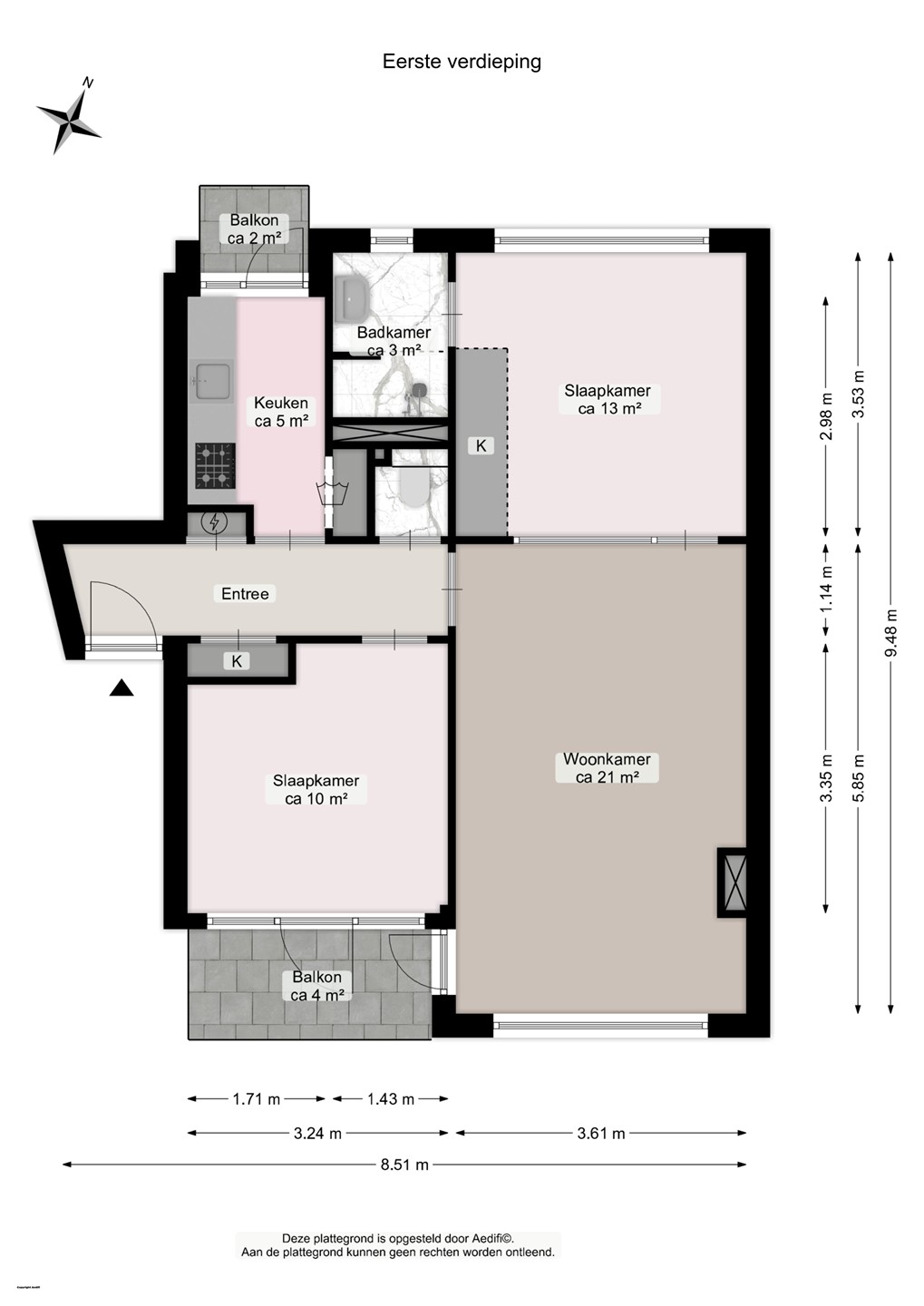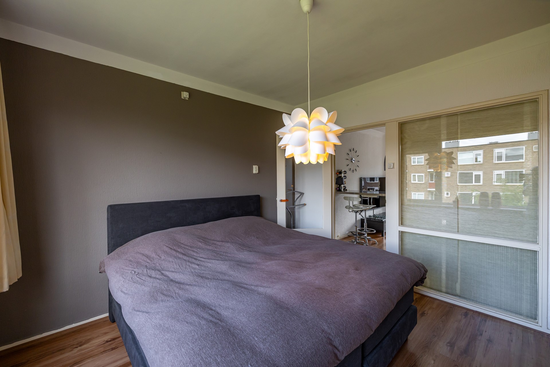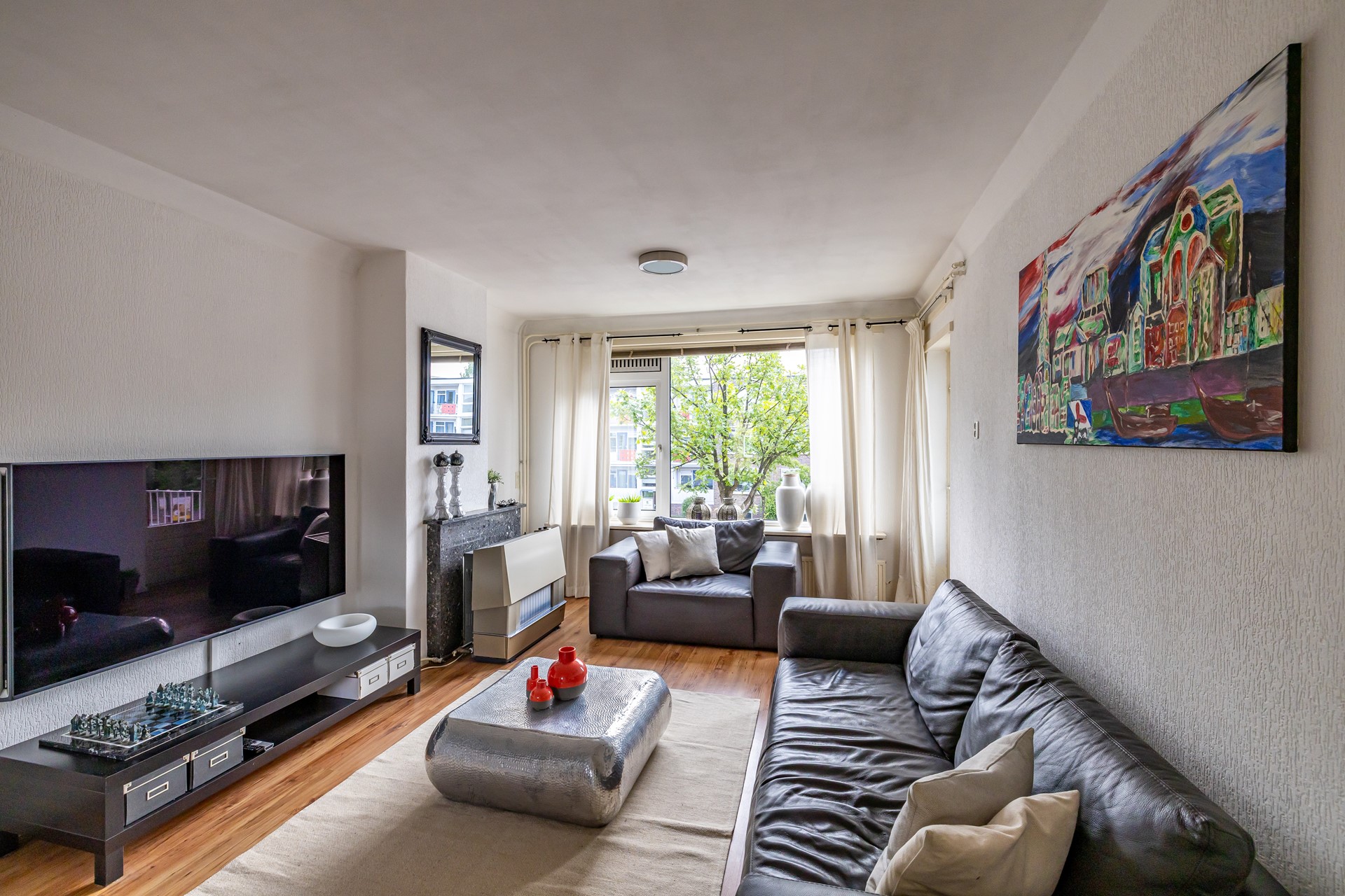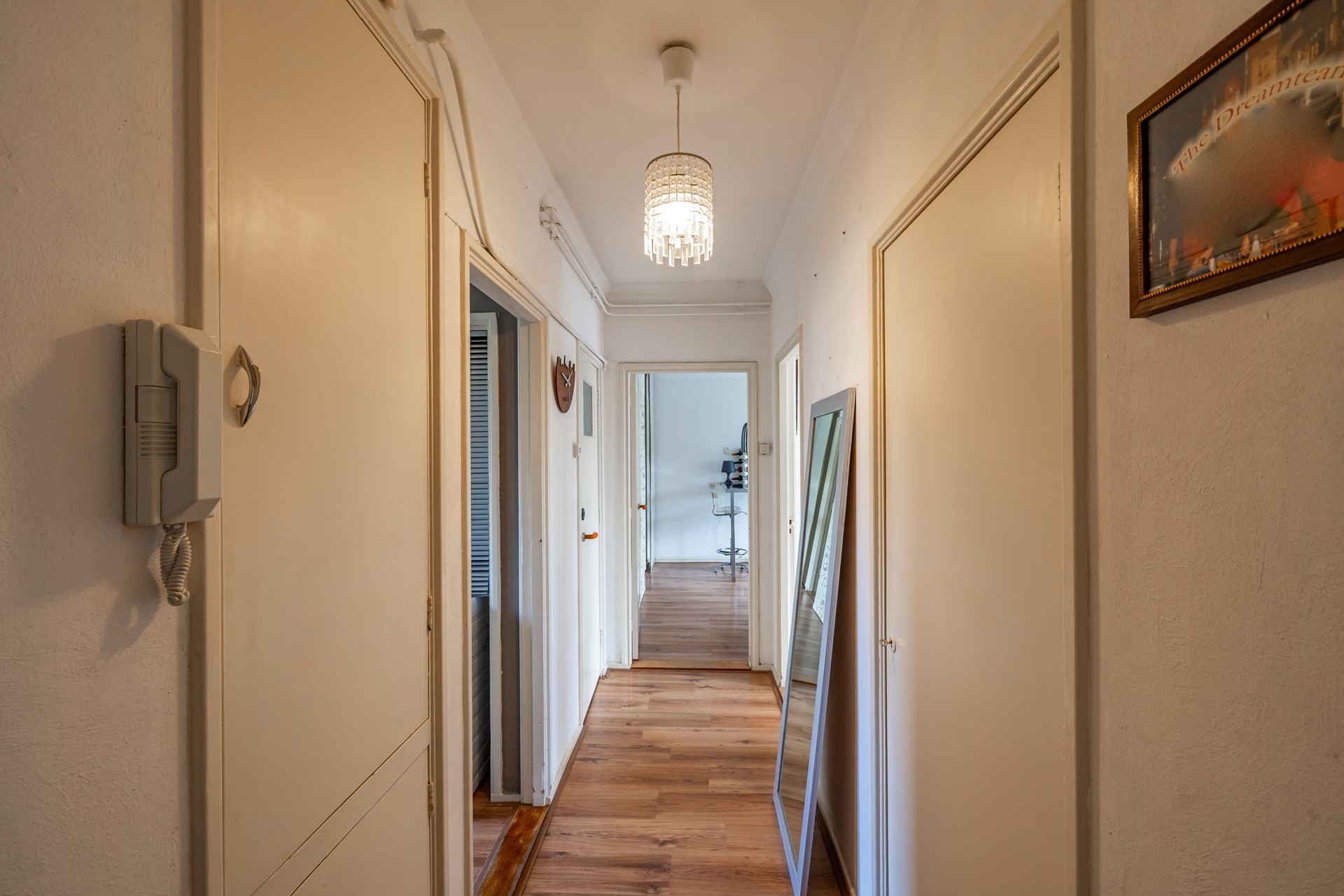 Het appartement heeft een ruime woonkamer die grenst aan de grootste slaapkamer. Dankzij het raamkozijn tussen deze twee vertrekken profiteer je optimaal van de lichtinval. De woonkamer heeft een zijdeur naar het grootste balkon. Via de hal kom je in de tweede slaapkamer, ook deze heeft weer een loopdeur naar het balkon aan de voorzijde. Aan de achterzijde van het appartement vind je de gescheiden keuken en het tweede balkon. De badkamer grenst aan de grote slaapkamer.
