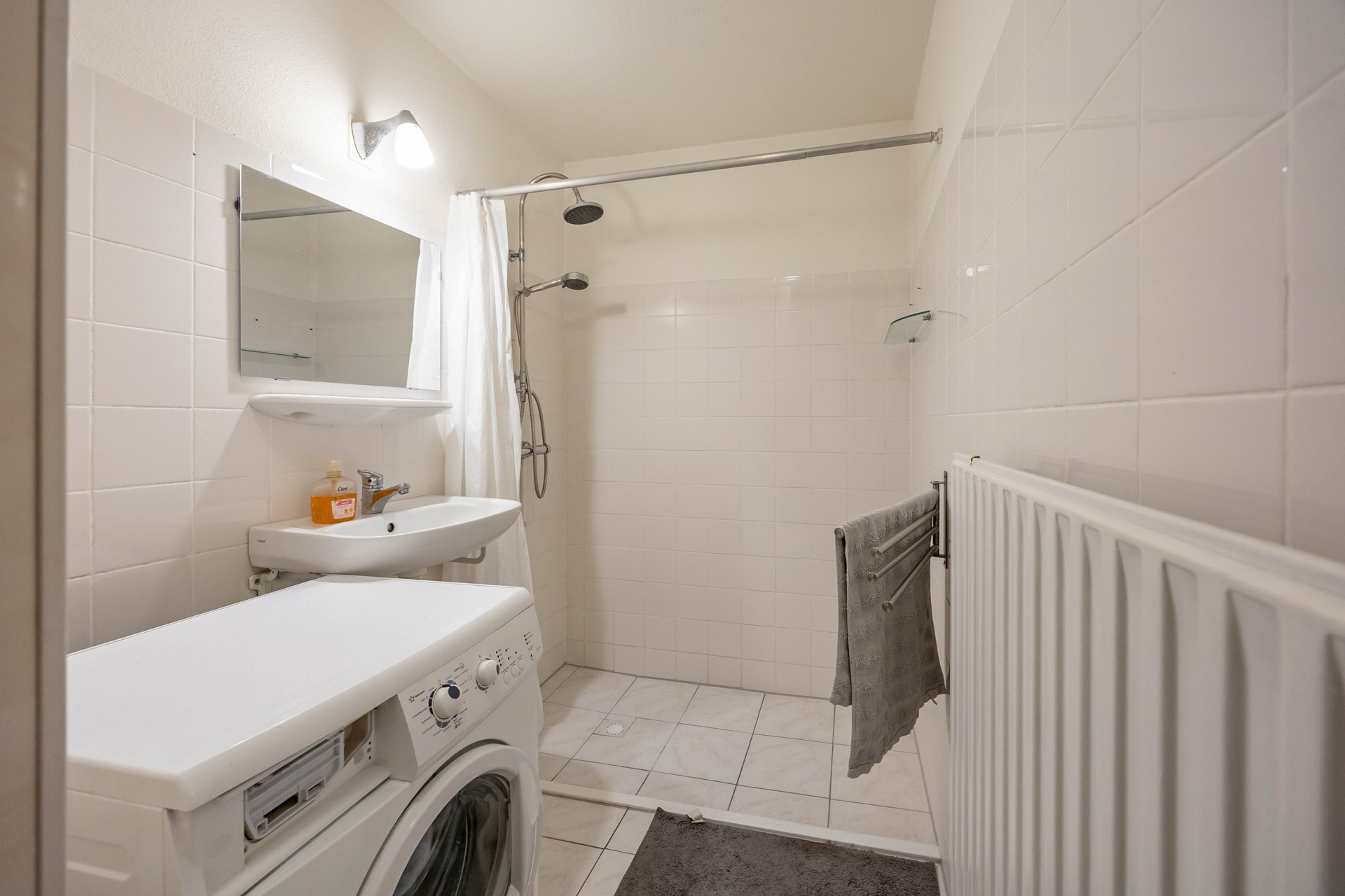 De badkamer is voorzien van een wastafel, douche, toilet en aansluiting voor een wasmachine.
