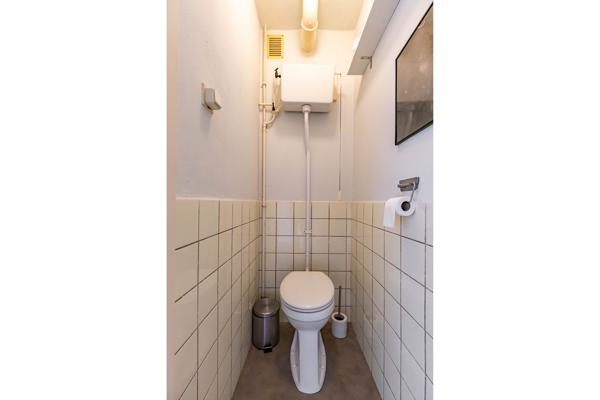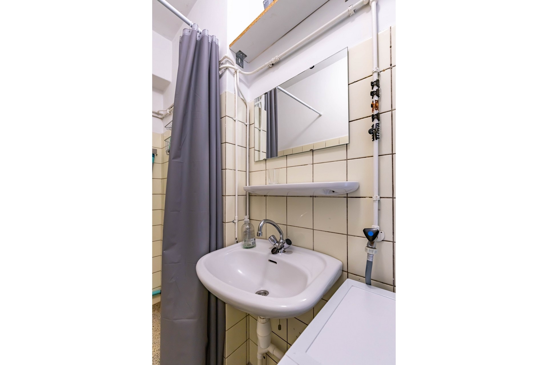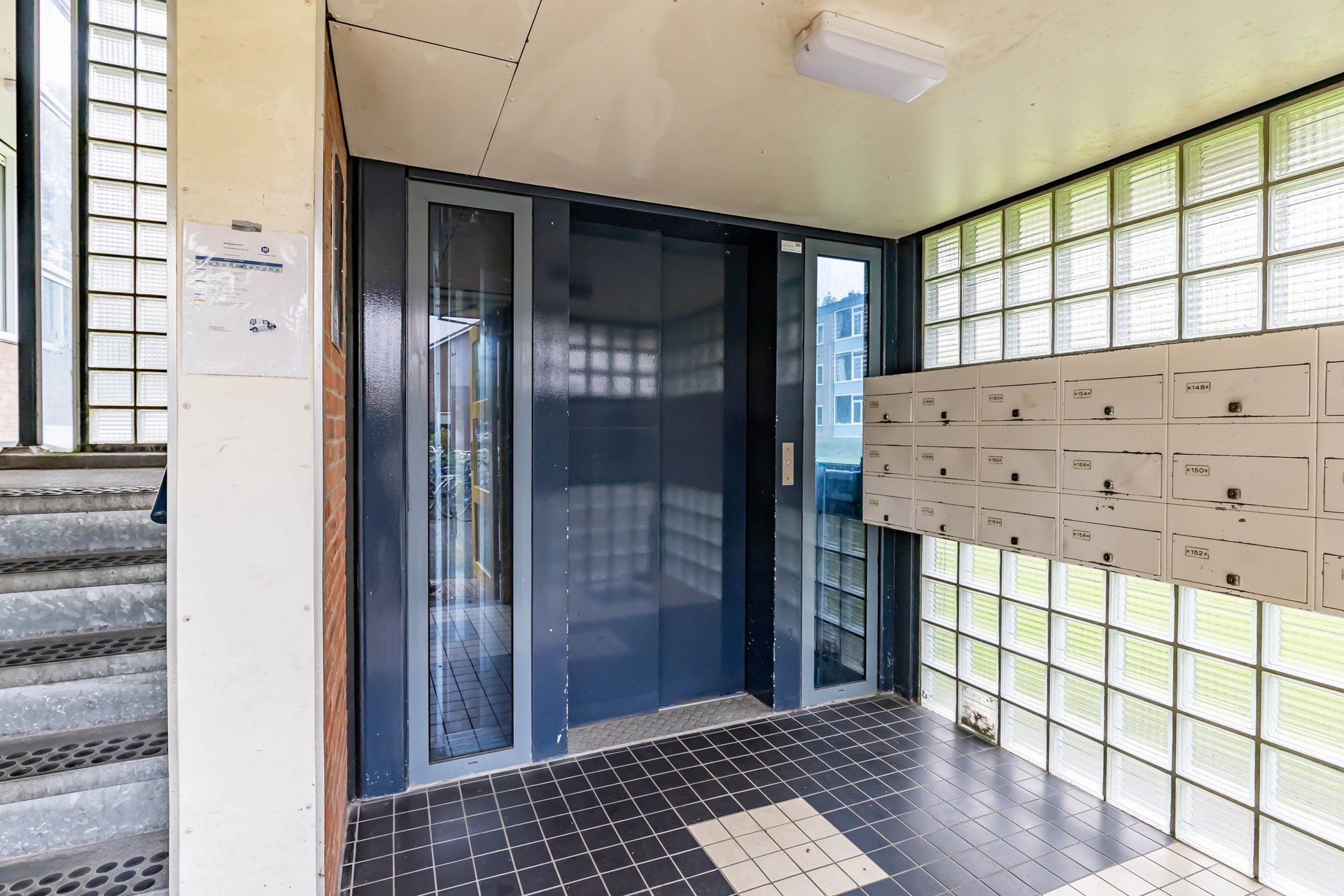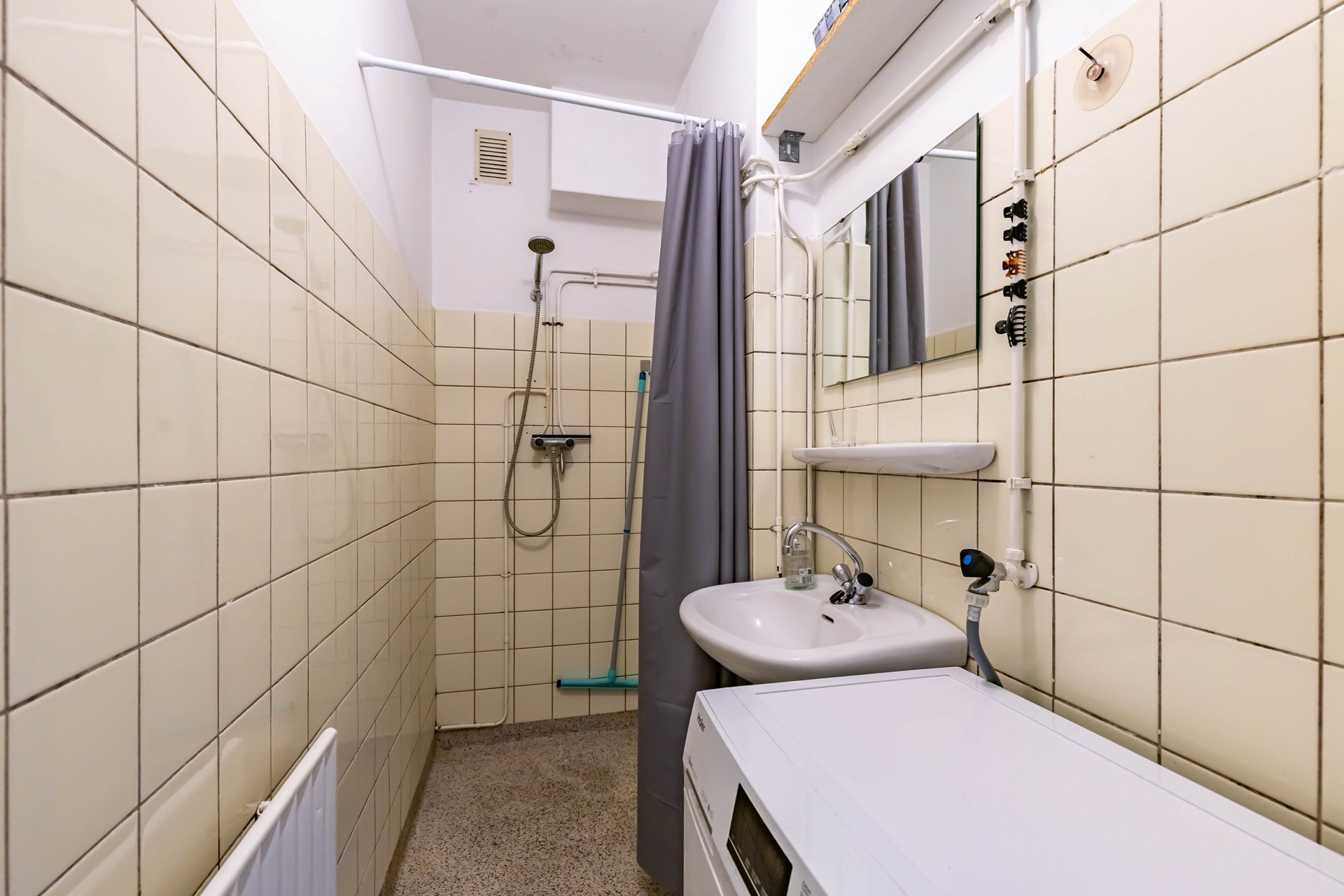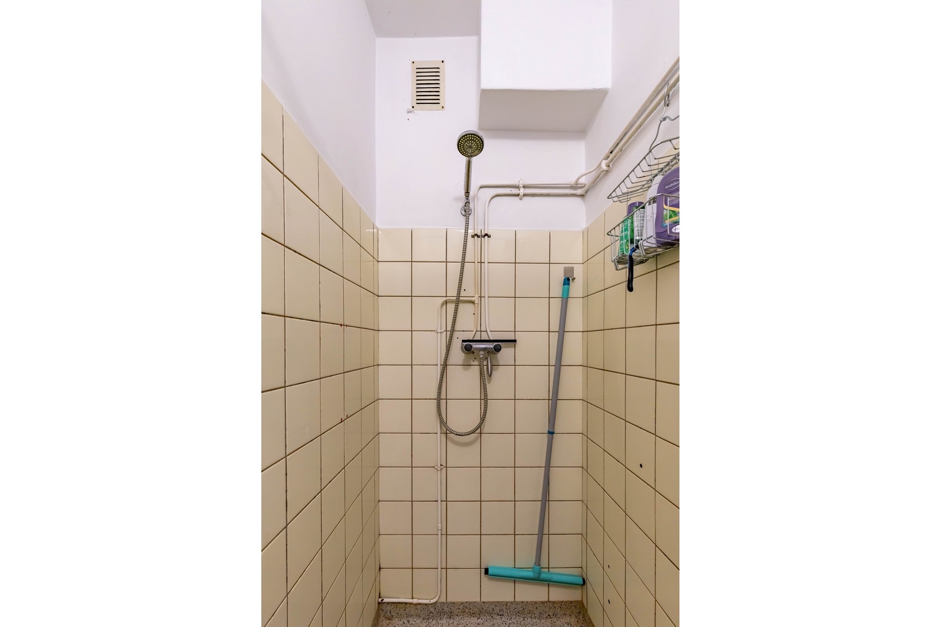 Lift of trap naar verdieping, entree appartement, centrale hal met meterkast, toilet en eenvoudige badkamer, voorzien van wastafel, douche en wasmachine-aansluiting.