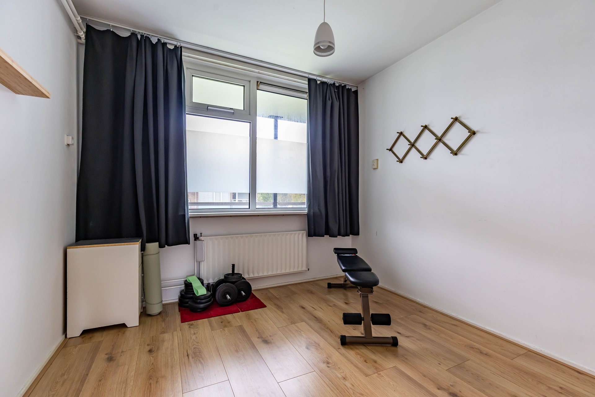 Slaapkamer 1, aan de voorzijde, heeft een inbouwkast en je komt er via een hal met een inbouwkast. Nu in gebruik als sportkamer.