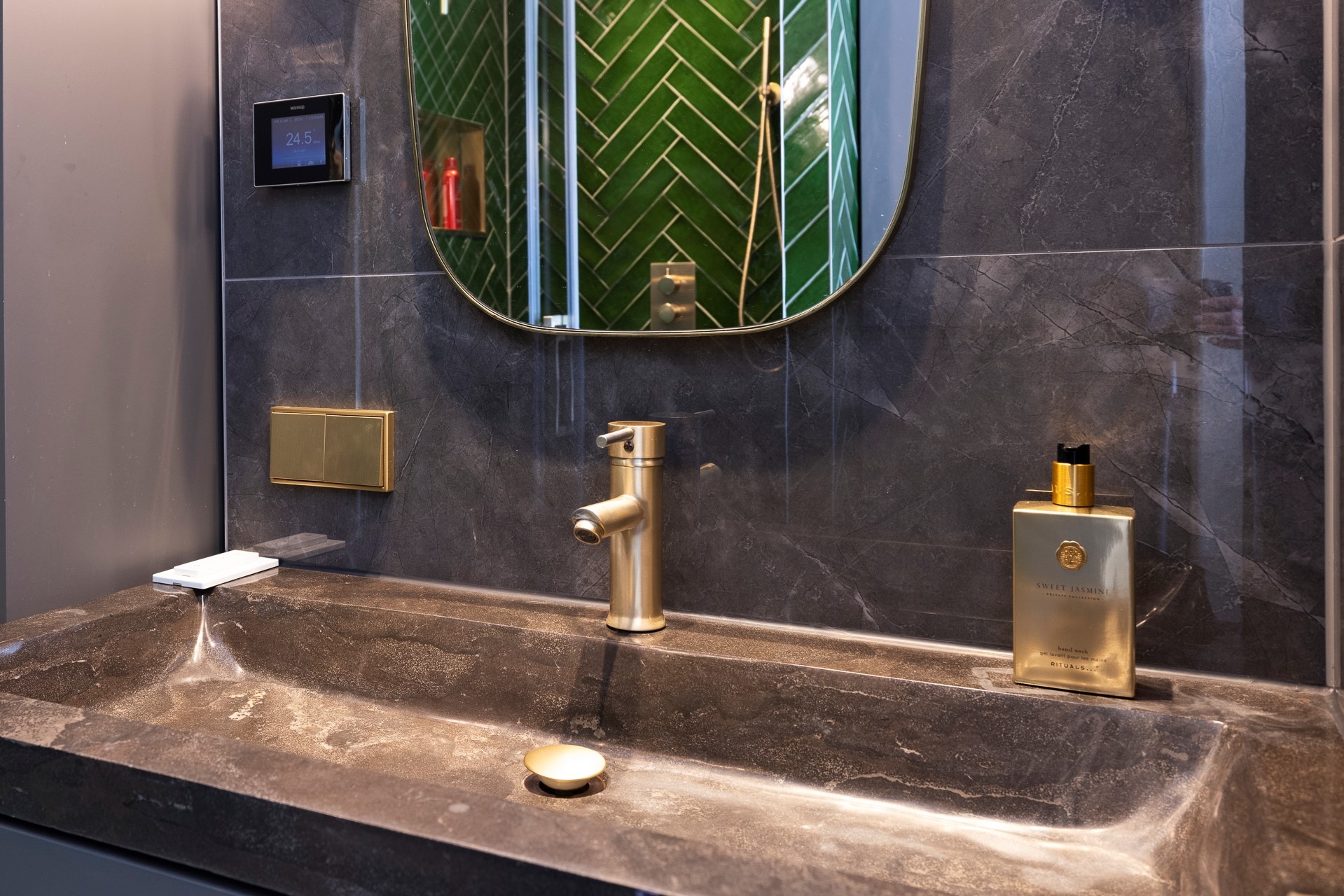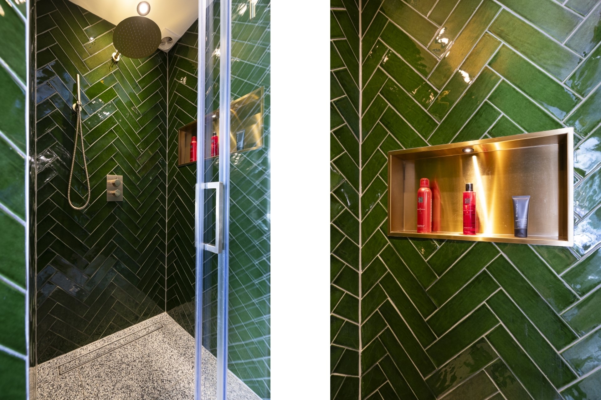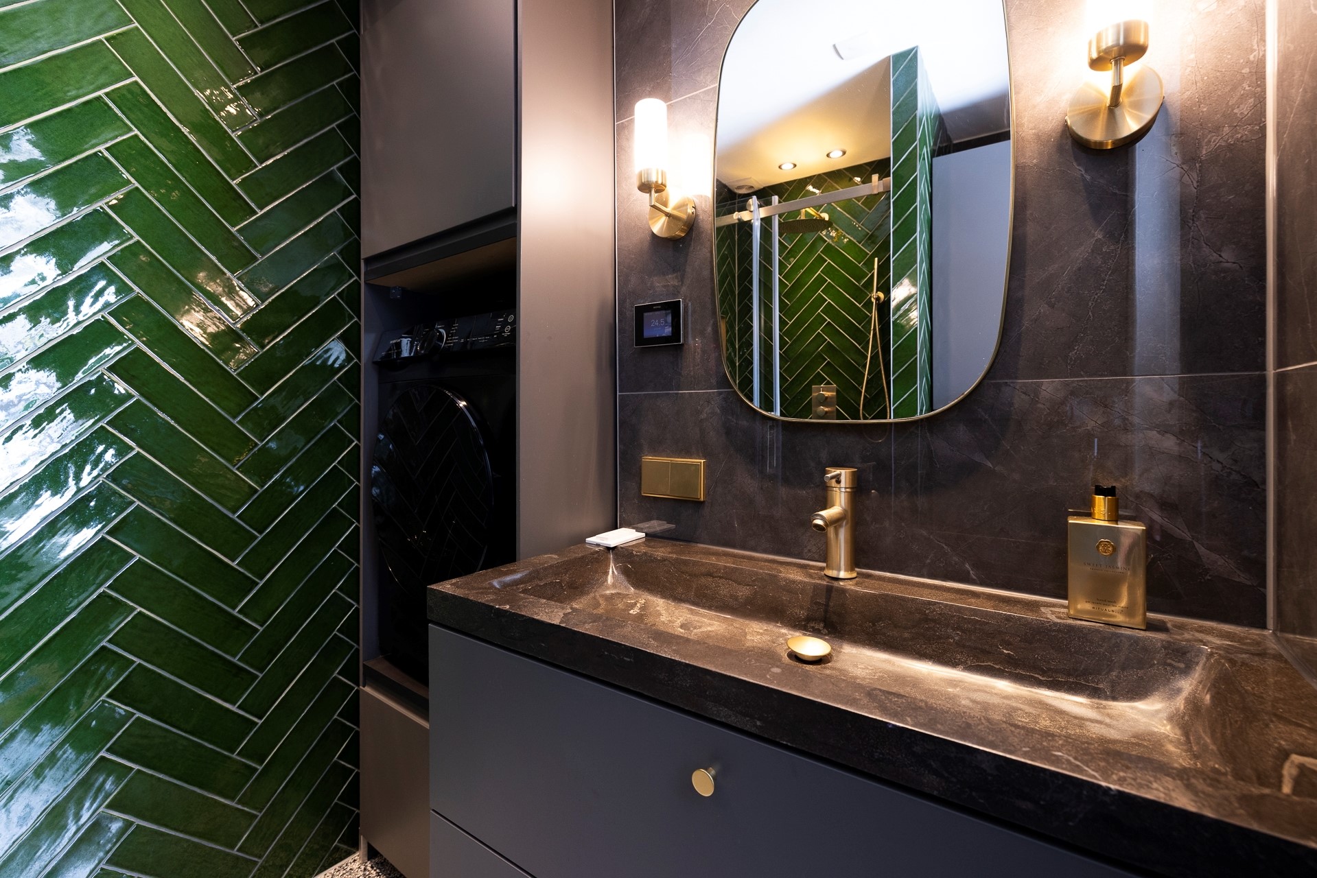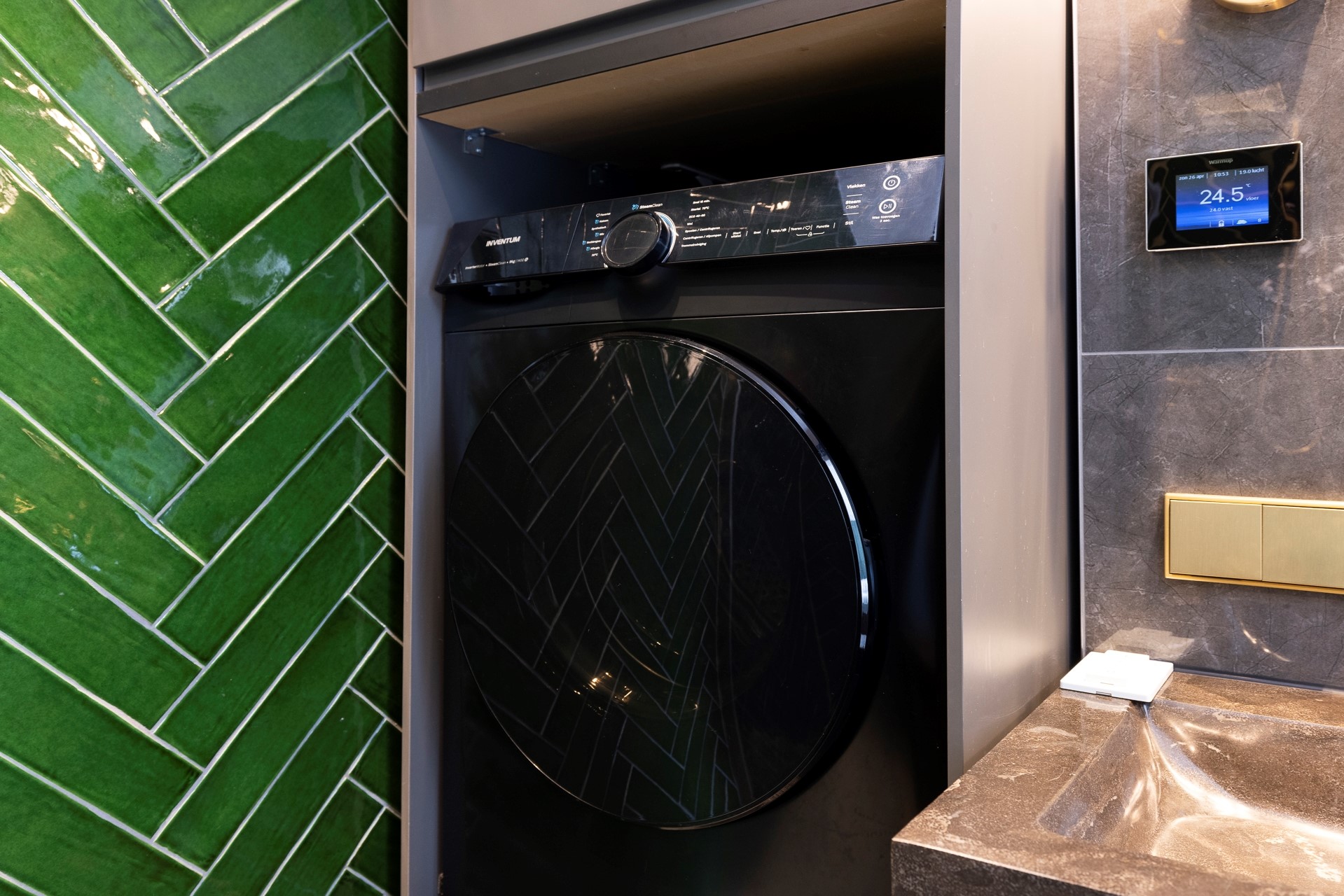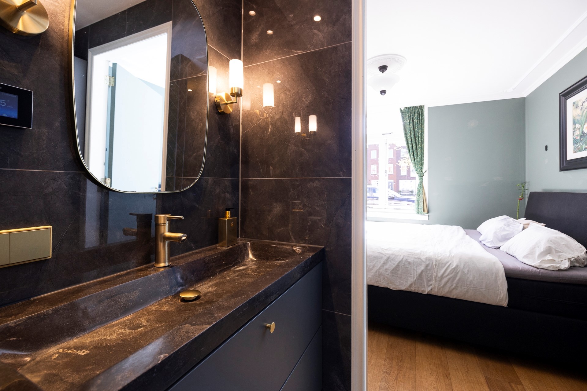 Je komt binnen in de gang met meterkast en toegang tot het separate toilet, de eerste slaapkamer en de opgang naar de eerste etage. Via de slaapkamer kom je in de nieuwe badkamer. De badkamer is prachtig afgewerkt, heeft vloerverwarming, aansluiting voor de wasmachine en droger en een inloopdouche.