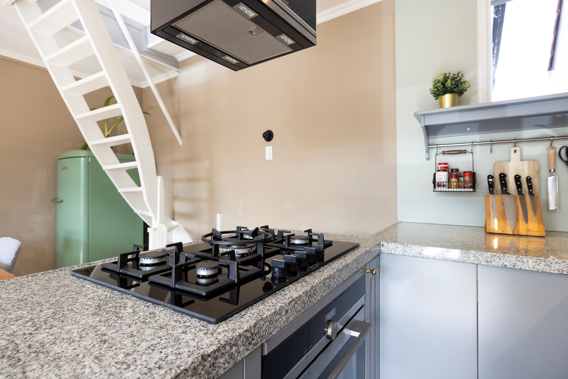 Op de eerste etage vind je de woonkamer met zicht over de gracht en er is een open keuken. De keuken is voorzien van hoogwaardige Siemens apparatuur, een Quooker en een kookeiland. Vanuit de keuken hebt je uitzicht op de Sint Bavo toren.