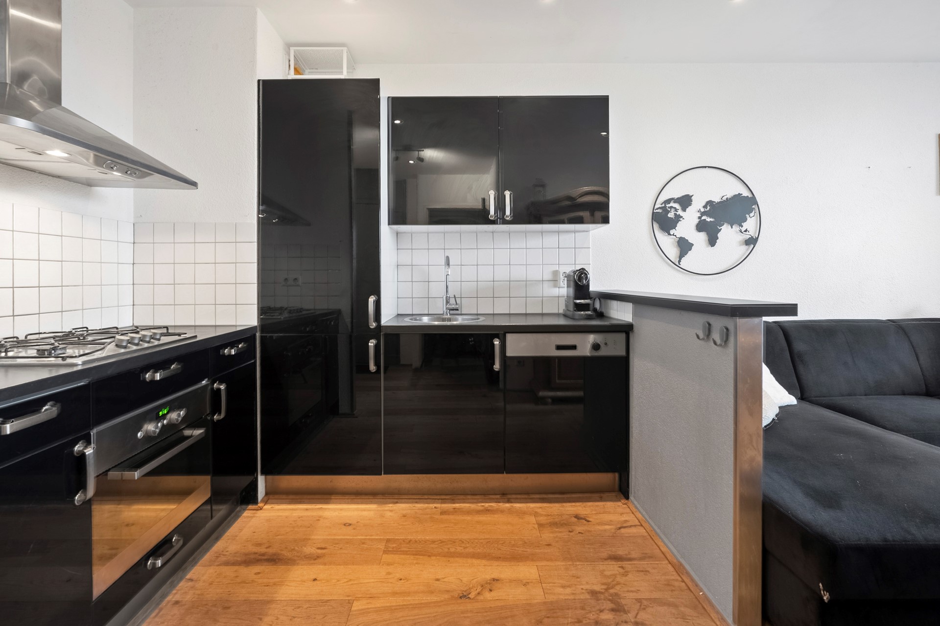 De lichte woonkamer beschikt over een gezellige zithoek en een open keuken. De keuken is compleet uitgerust met een oven, gaskookplaat, koelkast en inbouwvaatwasser.