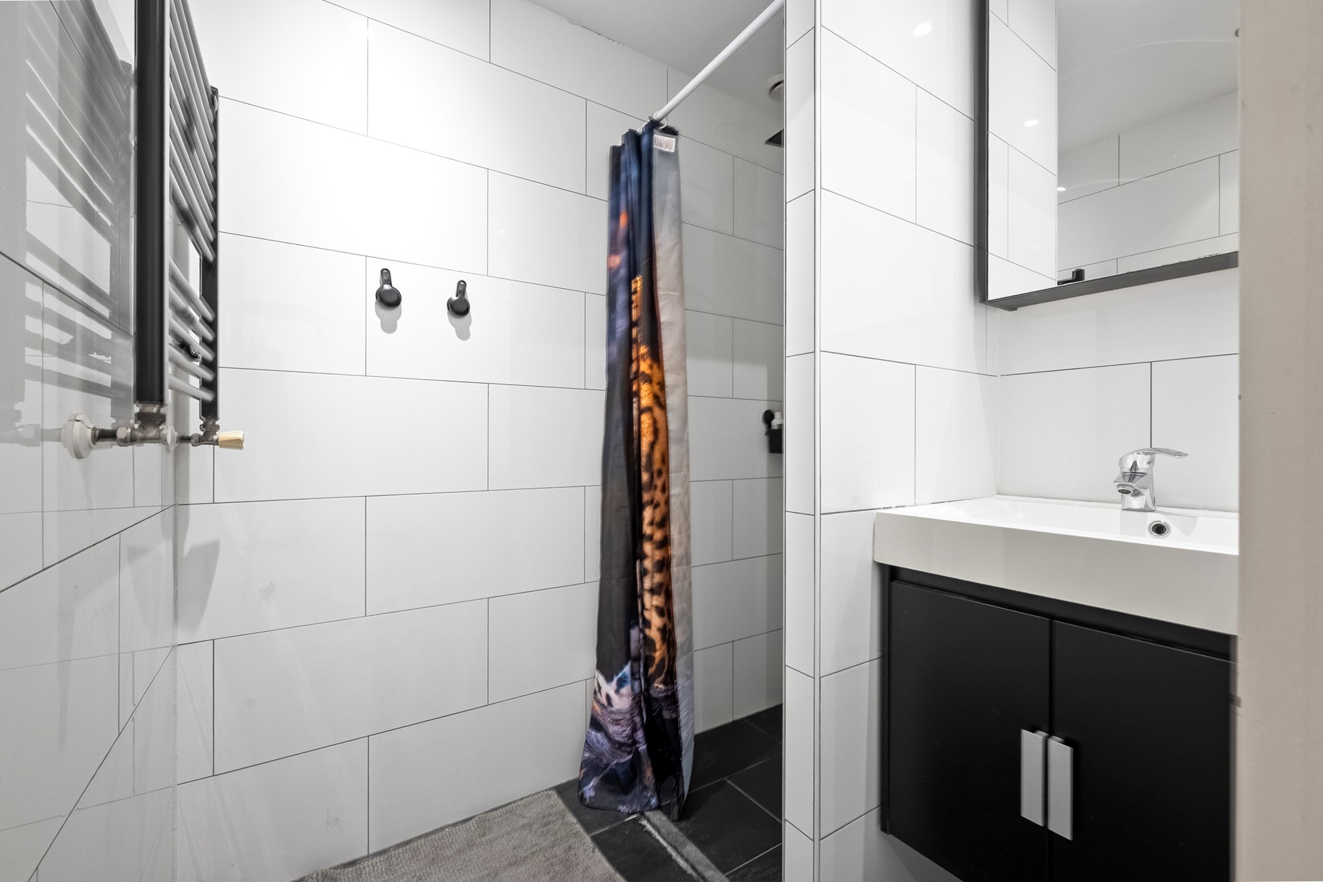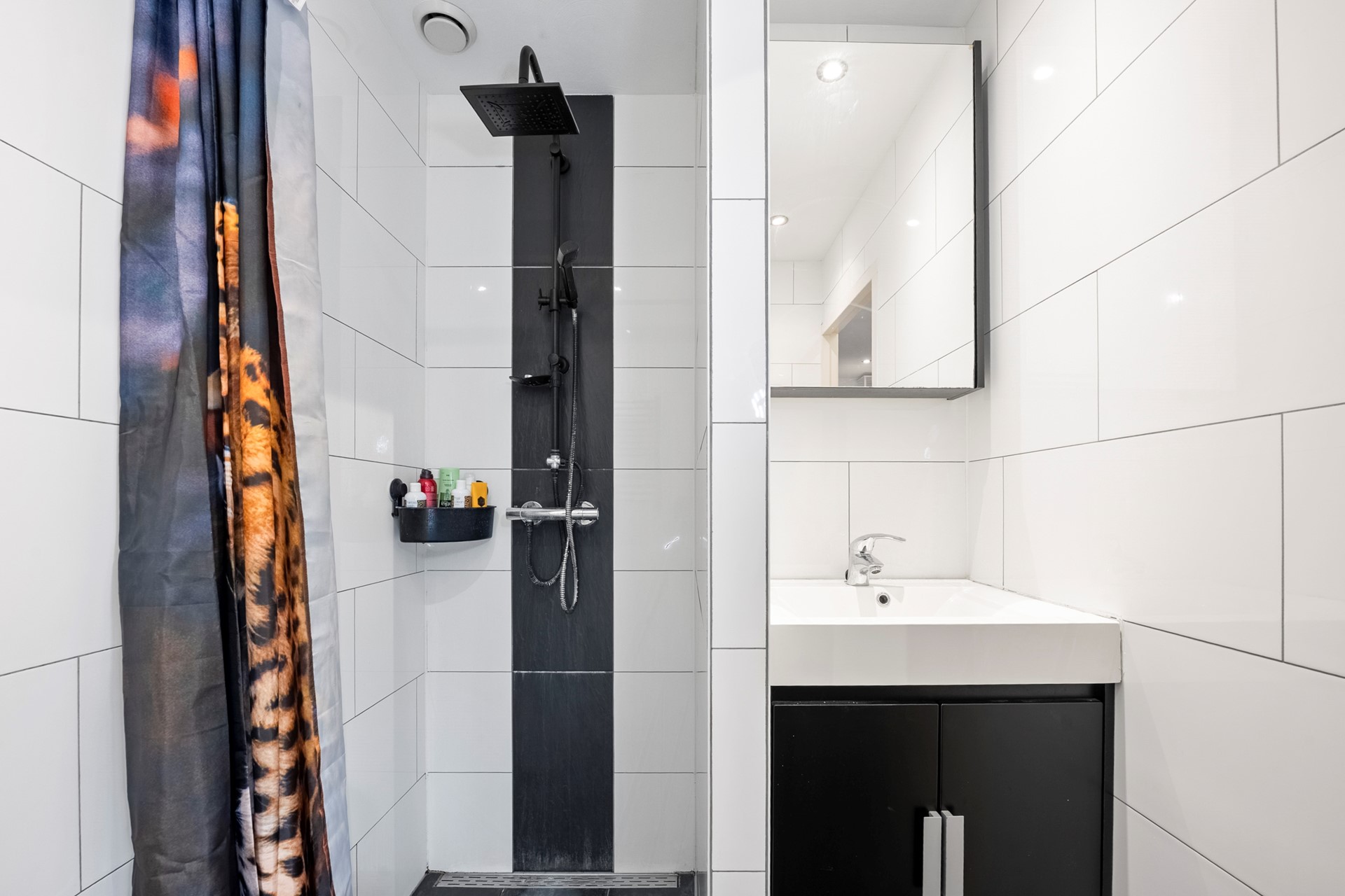 De badkamer is modern ingericht met een inloopdouche, wastafelmeubel en aansluiting voor de wasmachine. Daarnaast is er een separaat toilet.