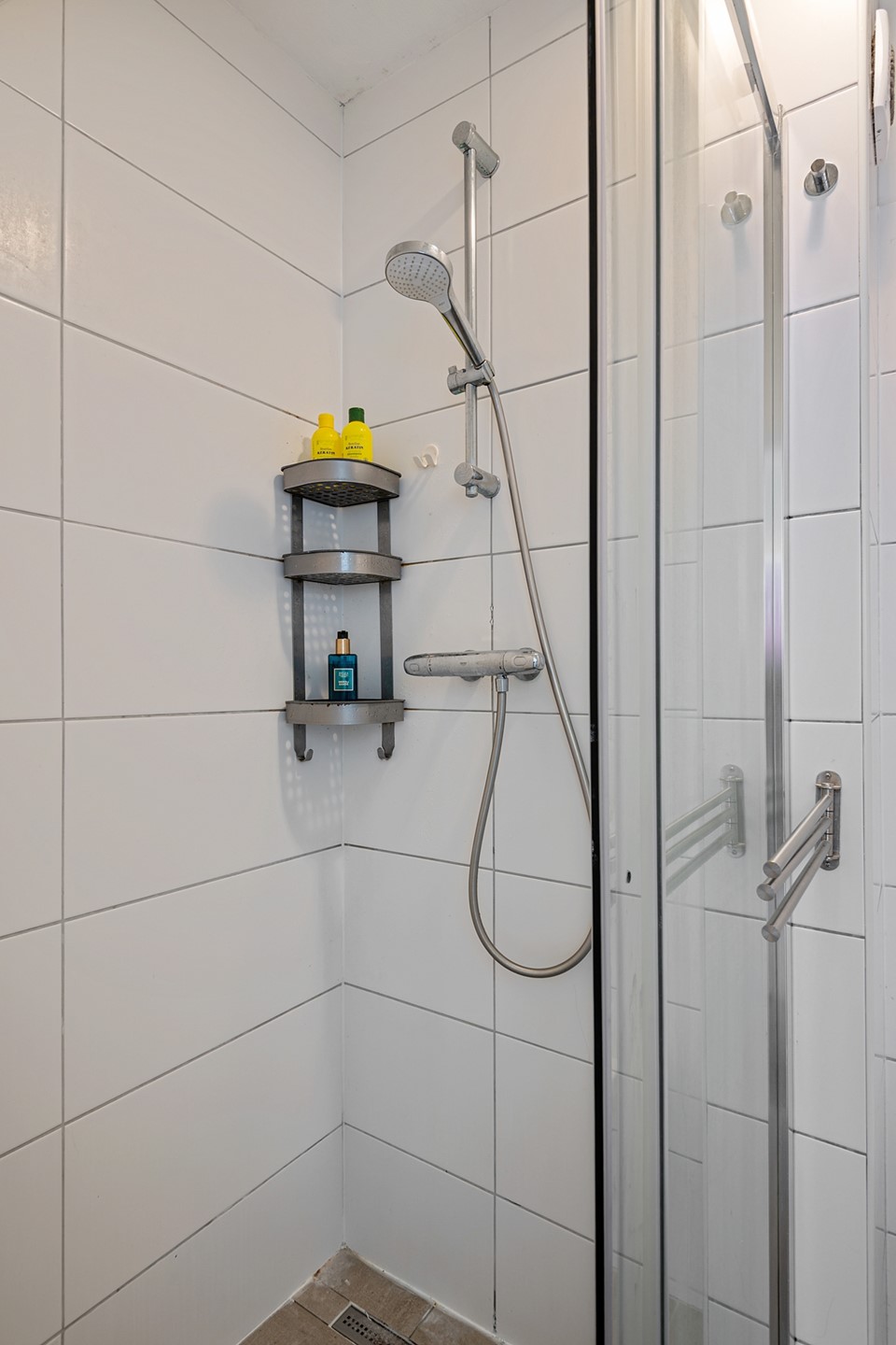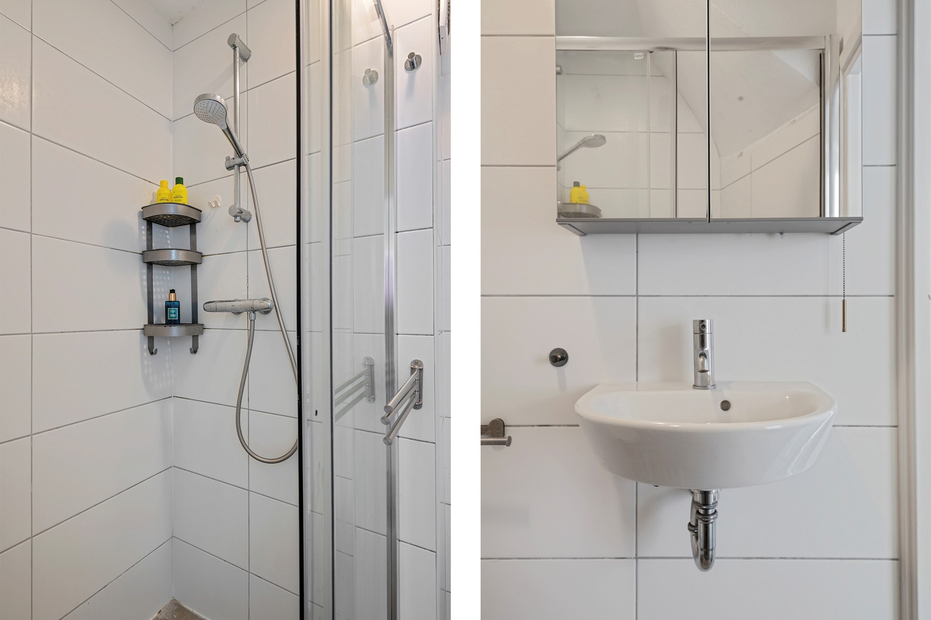 Met de trap ga je naar de eerste verdieping waar aan de rechterkant de voordeur is. Je komt binnen in de entree en loop door naar de hal waar aan de rechterkant een kast zit en aan de linkerkant de ingang naar de lichte sfeervolle L-vormige huiskamer met de grote ramen. Na de kast vind je links de badkamer met douchecabine, toilet, wastafel en medicijnkast. Aan de achterzijde van de woning zijn de twee ruime slaapkamer met in de kleine kamer een kast met de ketel. De keuken ligt tussen de twee slaapkamers in deze beschikt over een gaskookplaat, oven, koel/vries combinatie en afwasmachine.