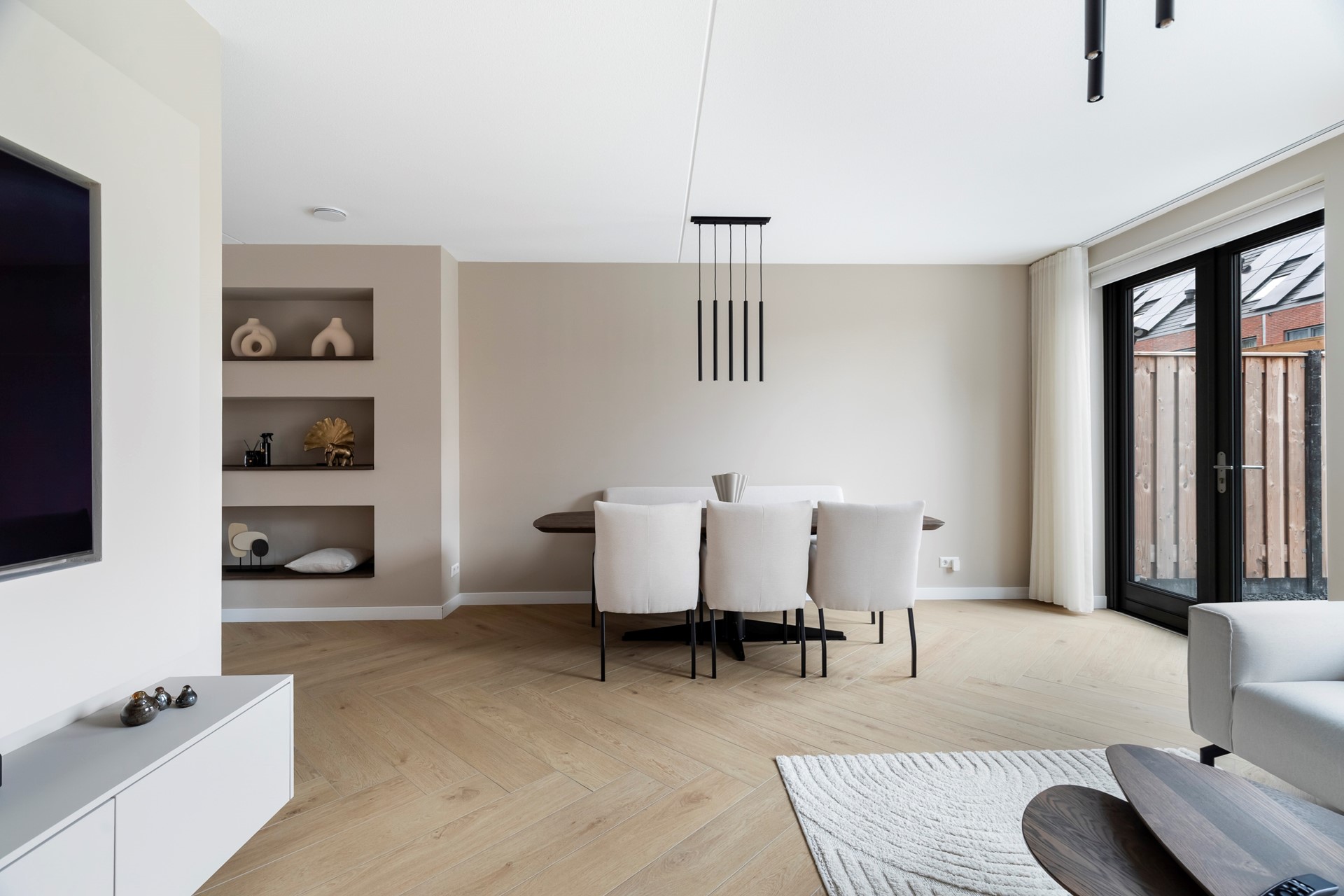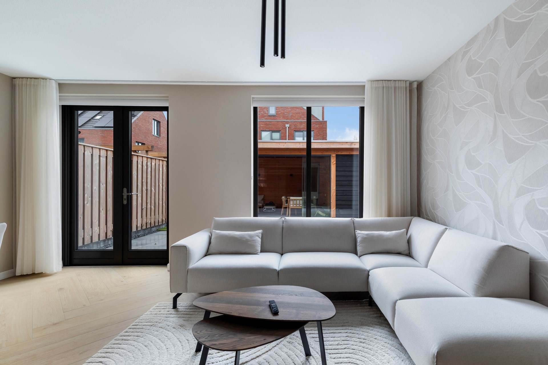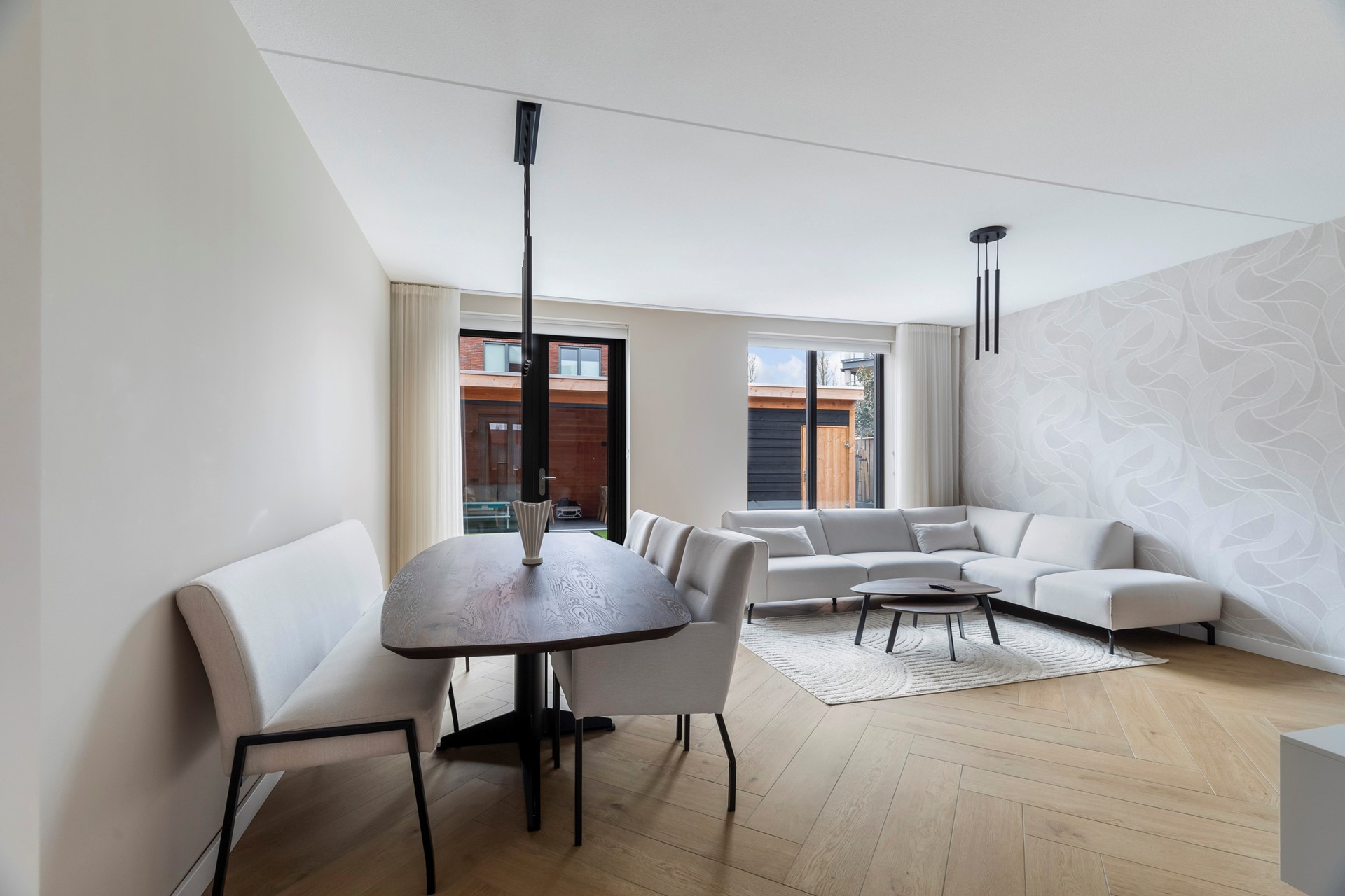 De royale woonkamer is heerlijk licht dankzij de grote raampartijen en vormt het hart van de woning. Openslaande deuren verbinden de leefruimte naadloos met de tuin, waardoor binnen en buiten prachtig in elkaar overlopen.
