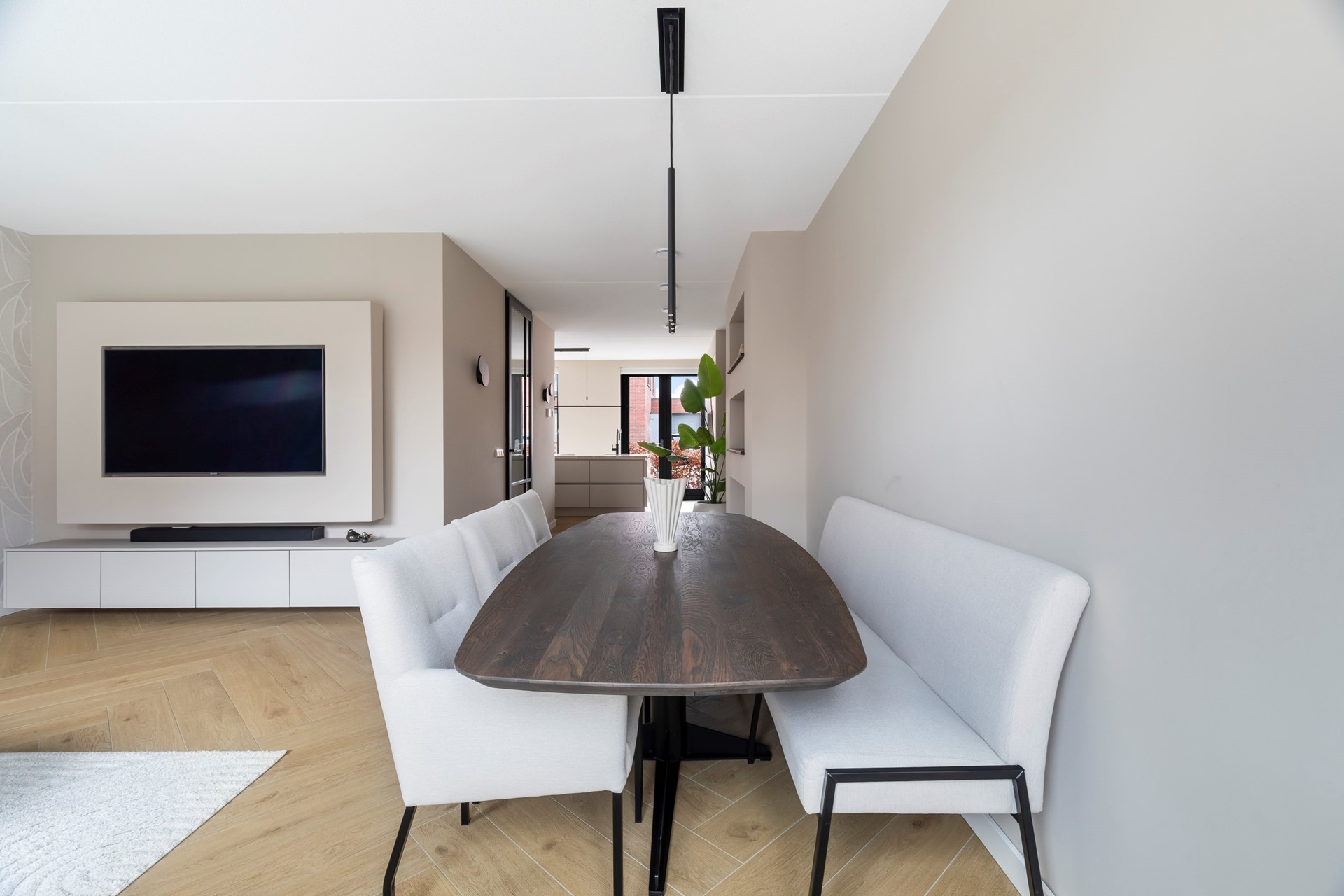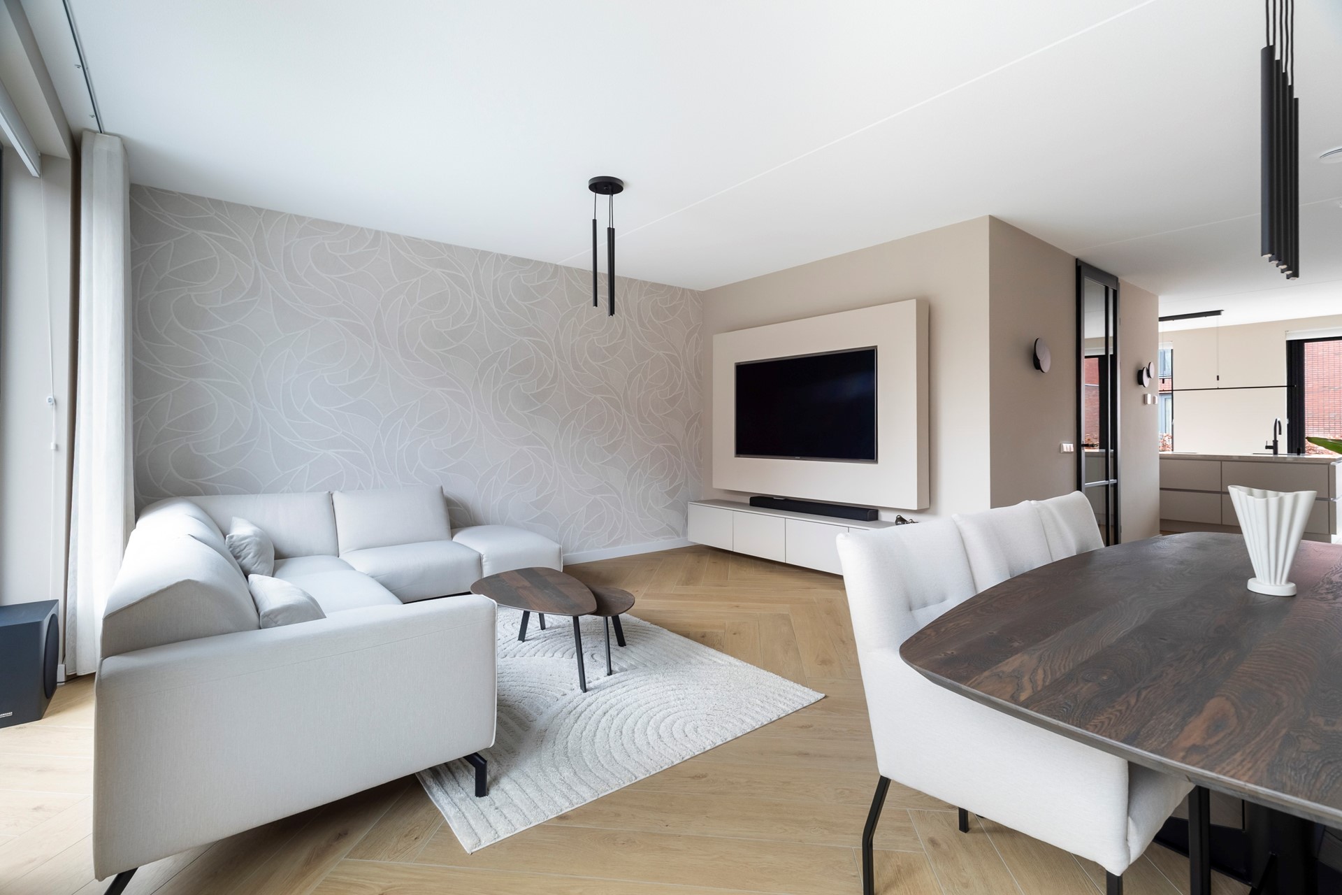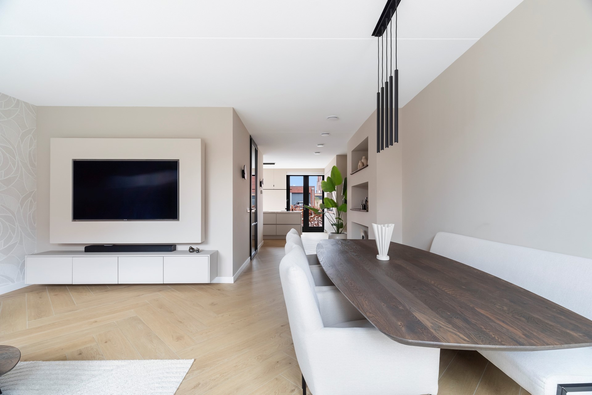 De royale woonkamer is heerlijk licht dankzij de grote raampartijen en vormt het hart van de woning. Openslaande deuren verbinden de leefruimte naadloos met de tuin, waardoor binnen en buiten prachtig in elkaar overlopen.