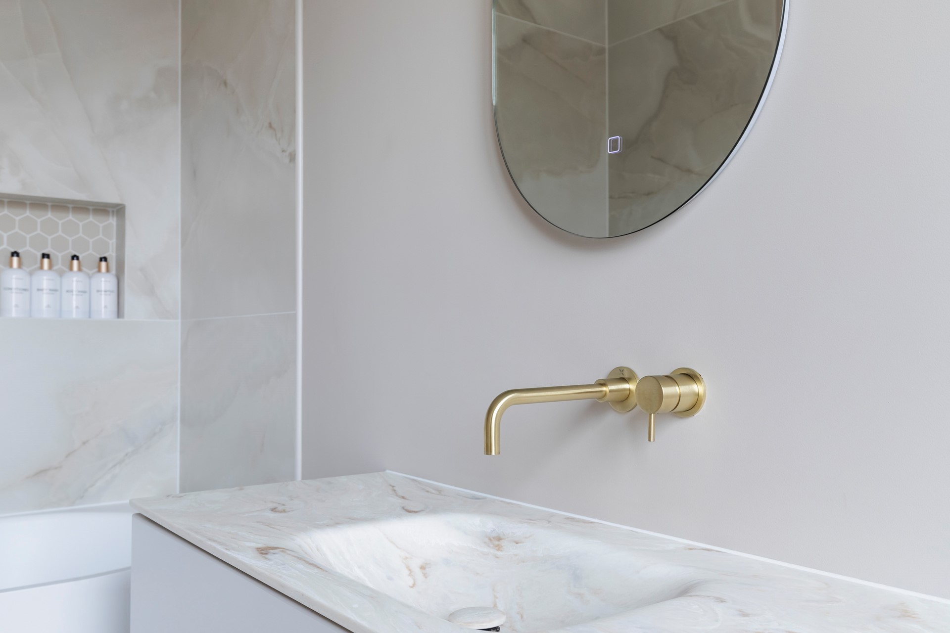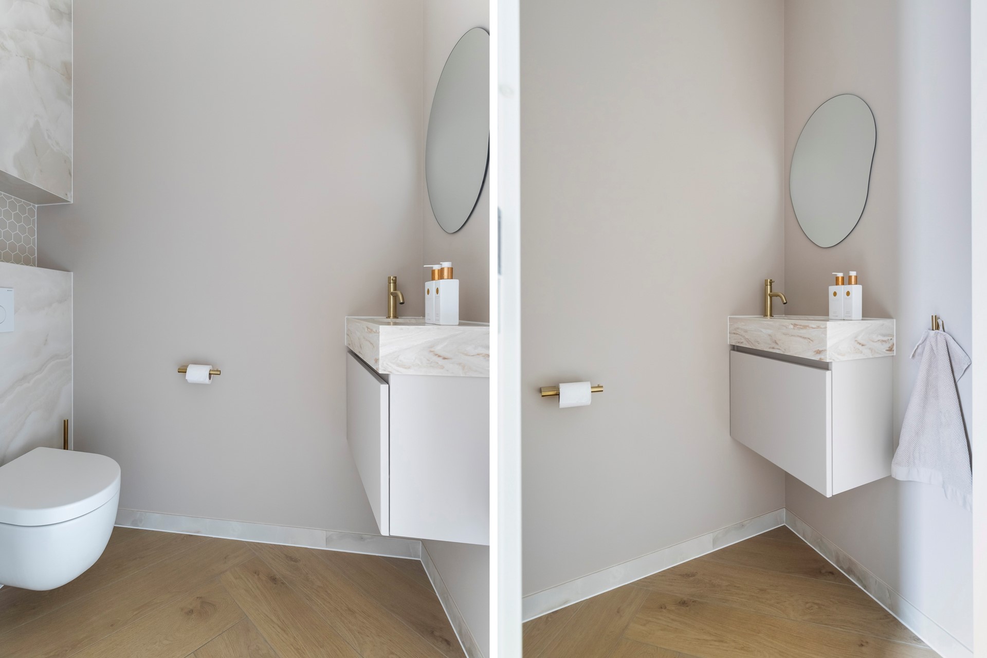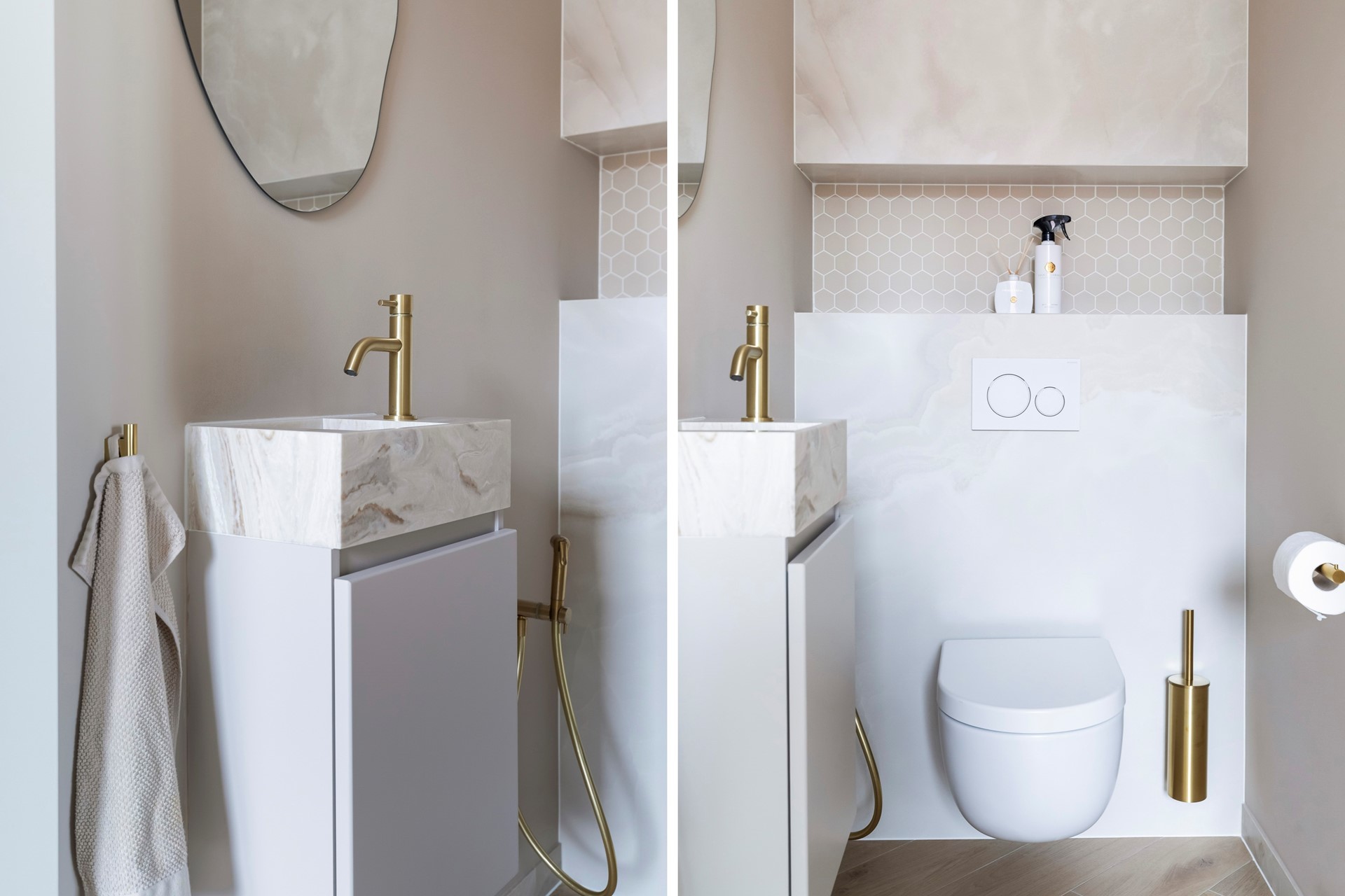 Modern, gedeeltelijk betegeld toilet voorzien van een wandcloset met bidet, wastafelmeubel en een handige nis.