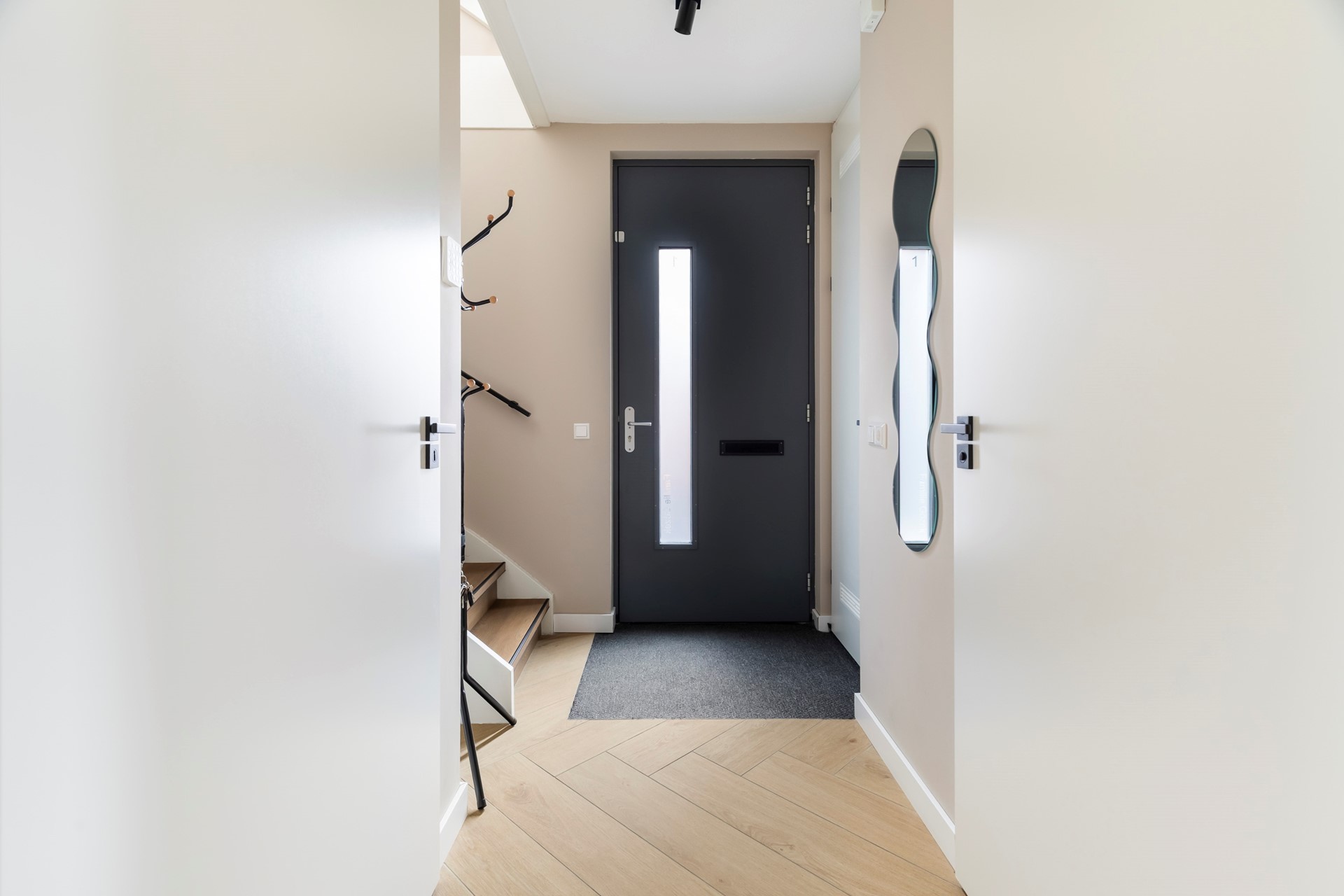 Via de entree betreedt u de hal met meterkast (12 groepen / 3 aardlekschakelaars, aparte groep voor de zonnepanelen en de warmtepomp), aanwezigheid van glasvezelinternet en een waterontharder. Aangrenzend vindt u het moderne toilet en de trapopgang naar de eerste verdieping. De praktische trapkast zorgt voor extra bergruimte. Vanuit de hal heeft u toegang tot de royale woonkamer.