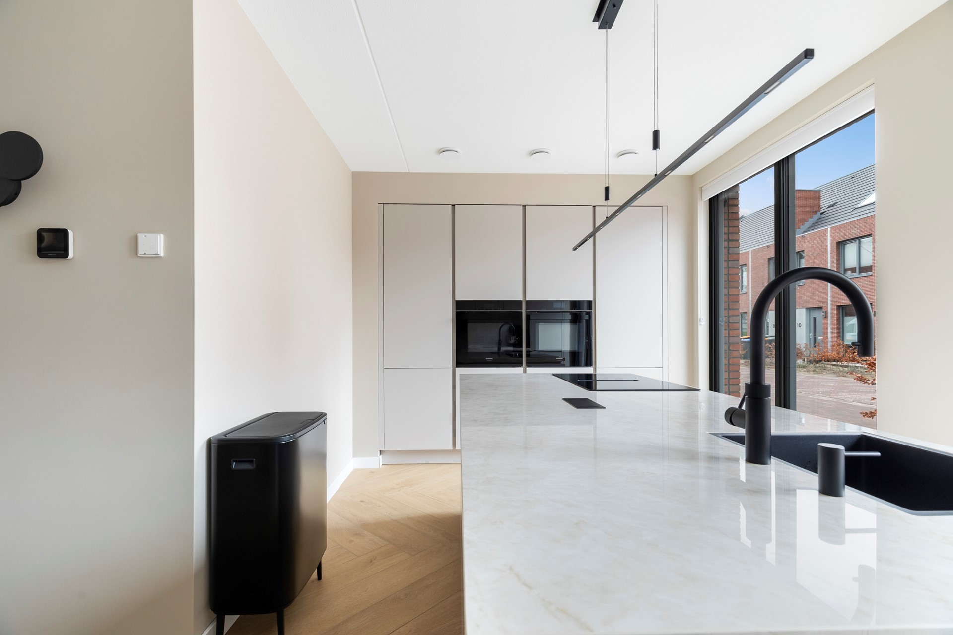 Aan de voorzijde van de woning bevindt zich de moderne leefkeuken met kookeiland. De keuken is ruim opgezet en voorzien van diverse inbouwapparatuur, waaronder een Quooker Cube, oven, combi-magnetron, vaatwasser, inductiekookplaat met geïntegreerde afzuiging, een grote koelkast en vriezer (alles van Siemens). Daarnaast is er veel kastruimte aanwezig, waardoor het een ideale plek is voor zowel dagelijks gebruik als gezellige avonden met familie en vrienden.