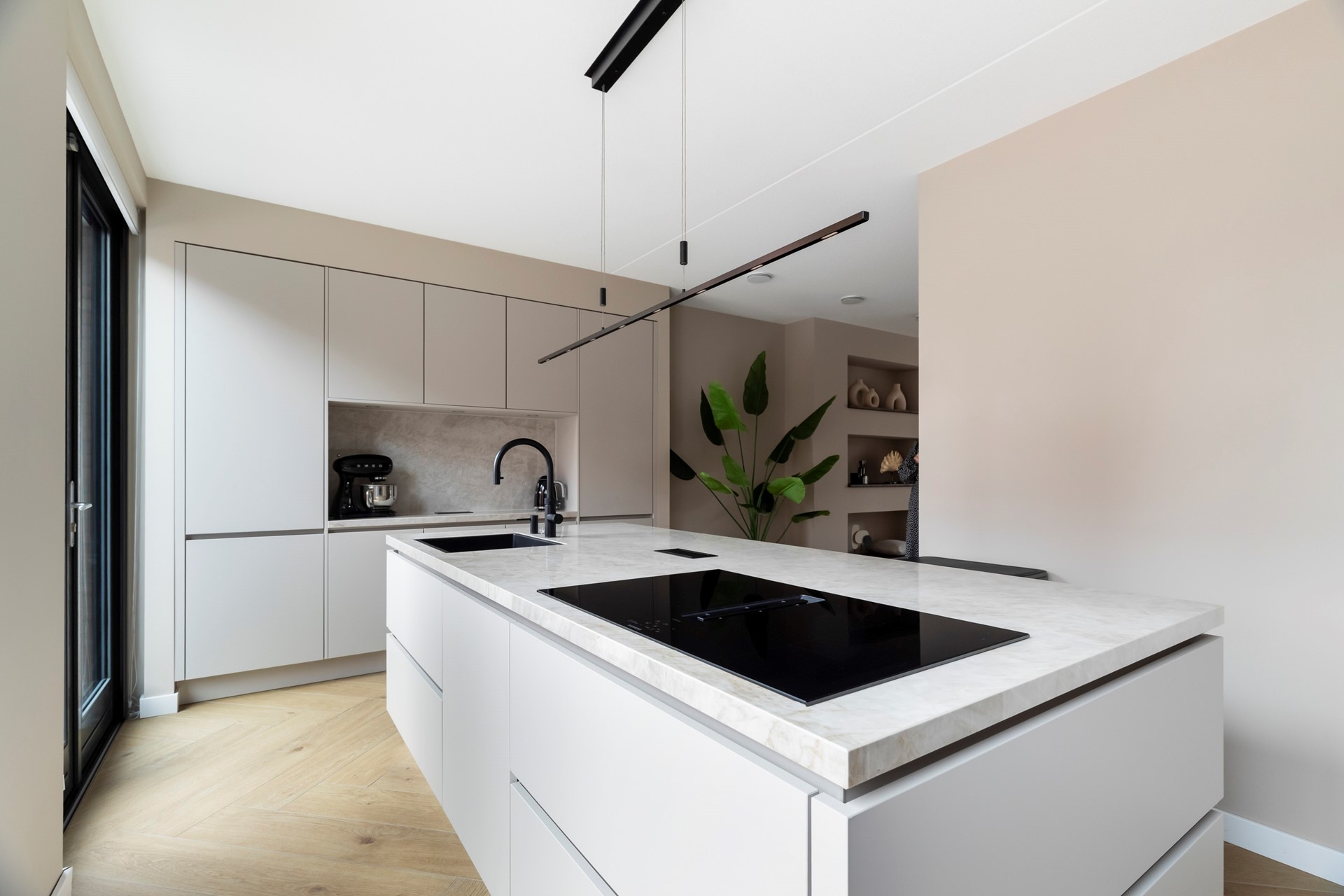 Moderken, uitgevoerd met een fraai kookeiland en hoogwaardige inbouwapparatuur. Dit is dé plek waar koken, tafelen en samenzijn samenkomen. Een keuken die niet alleen praktisch is, maar ook uitnodigt tot lange avonden met familie en vrienden.