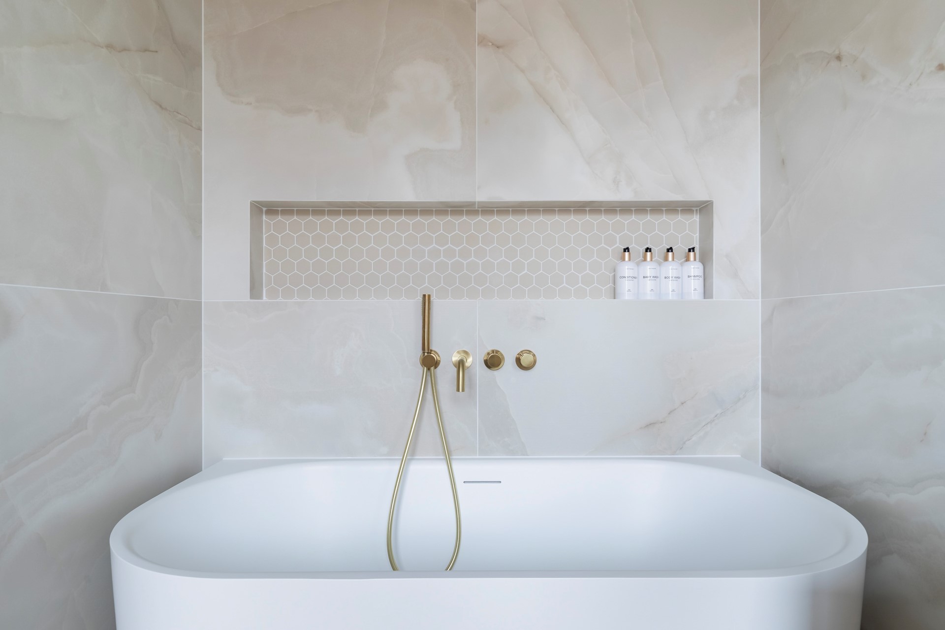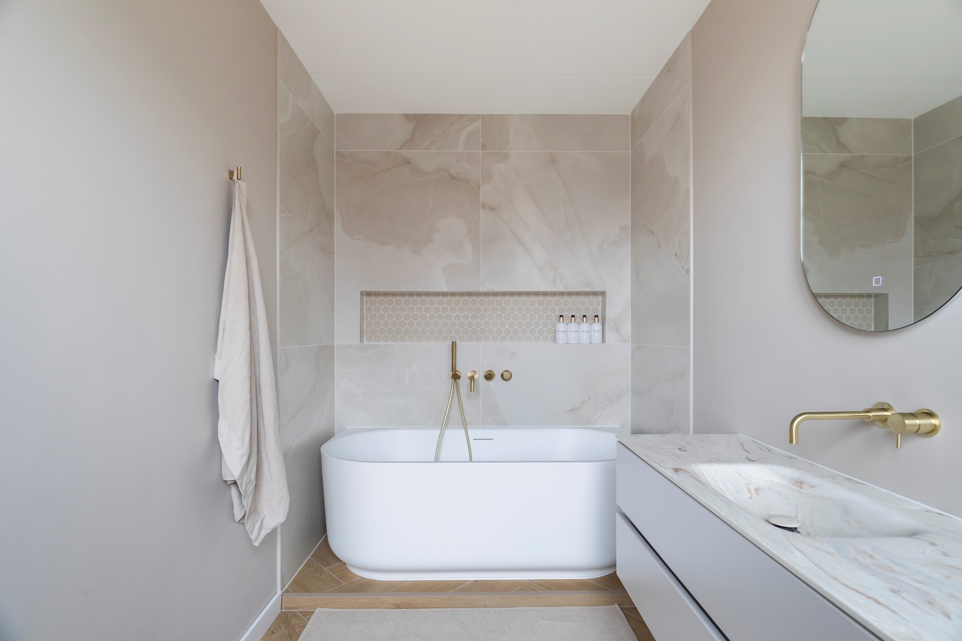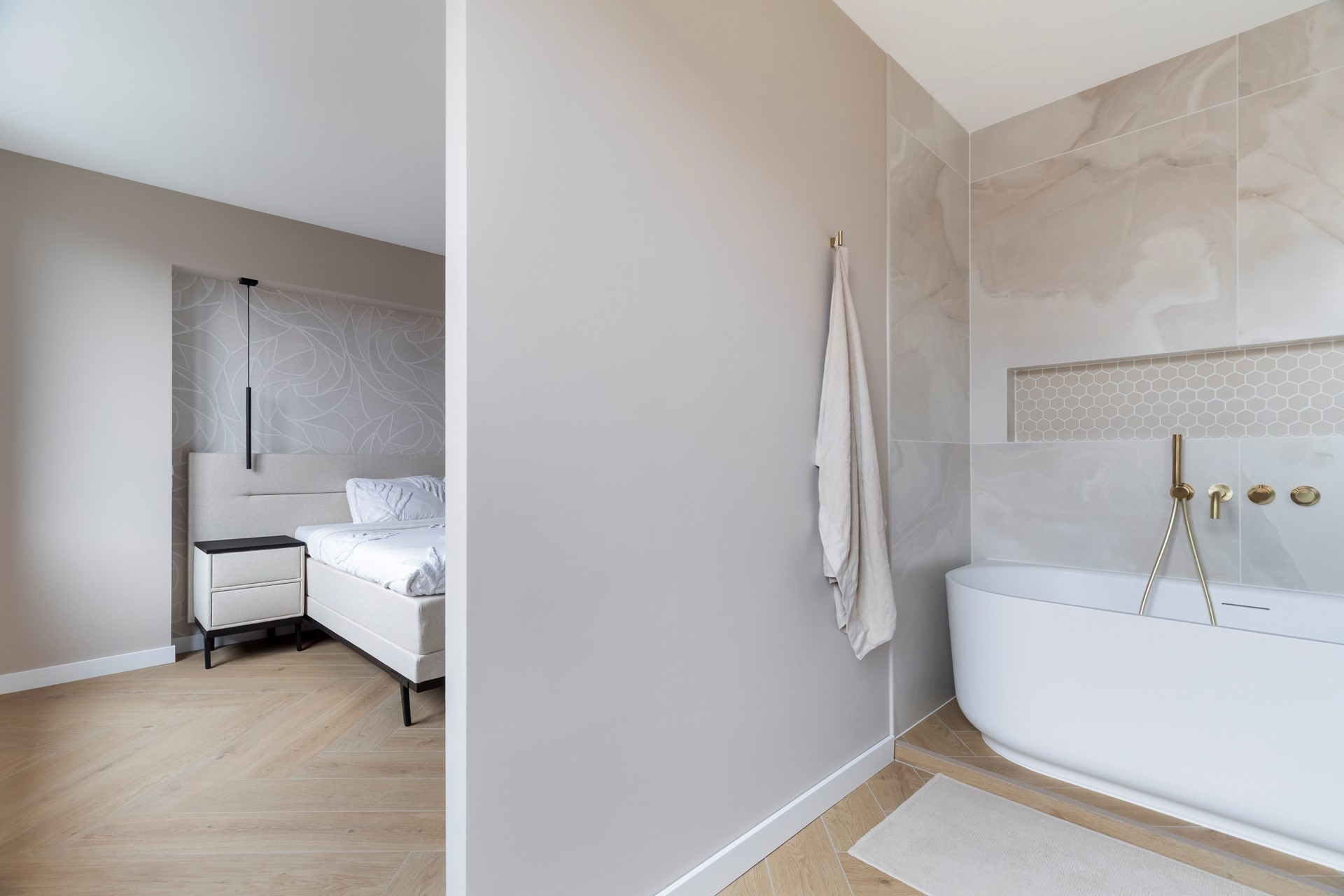 De ruime hoofdslaapkamer bevindt zich aan de achterzijde van de woning en beschikt over een eigen badkamer ensuite, wat zorgt voor extra comfort en privacy. De badkamer is voorzien van een ligbad, wastafelmeubel en een praktische nis.