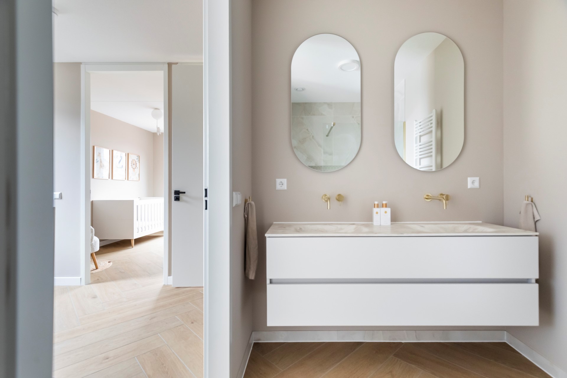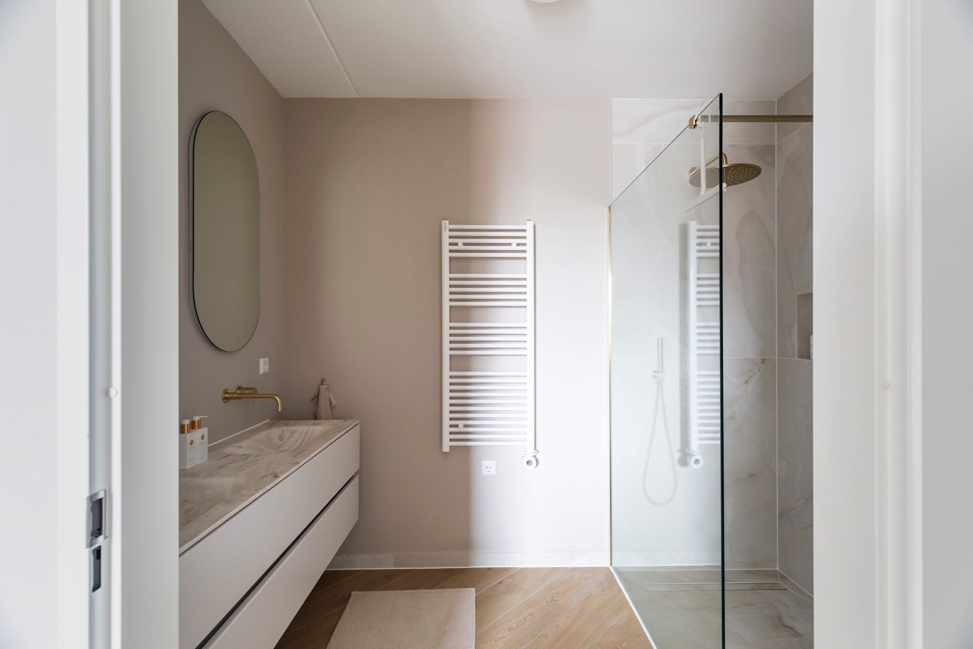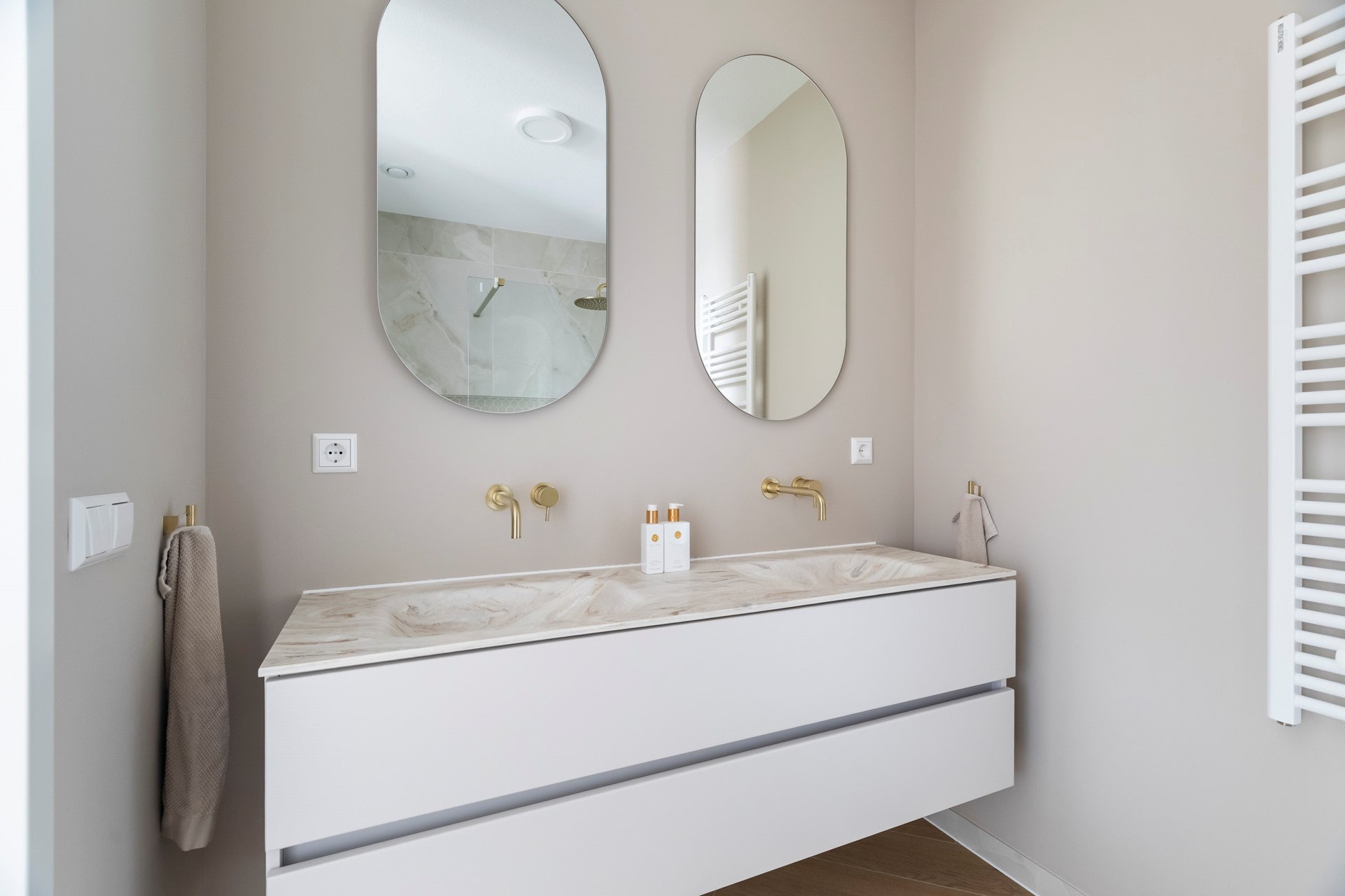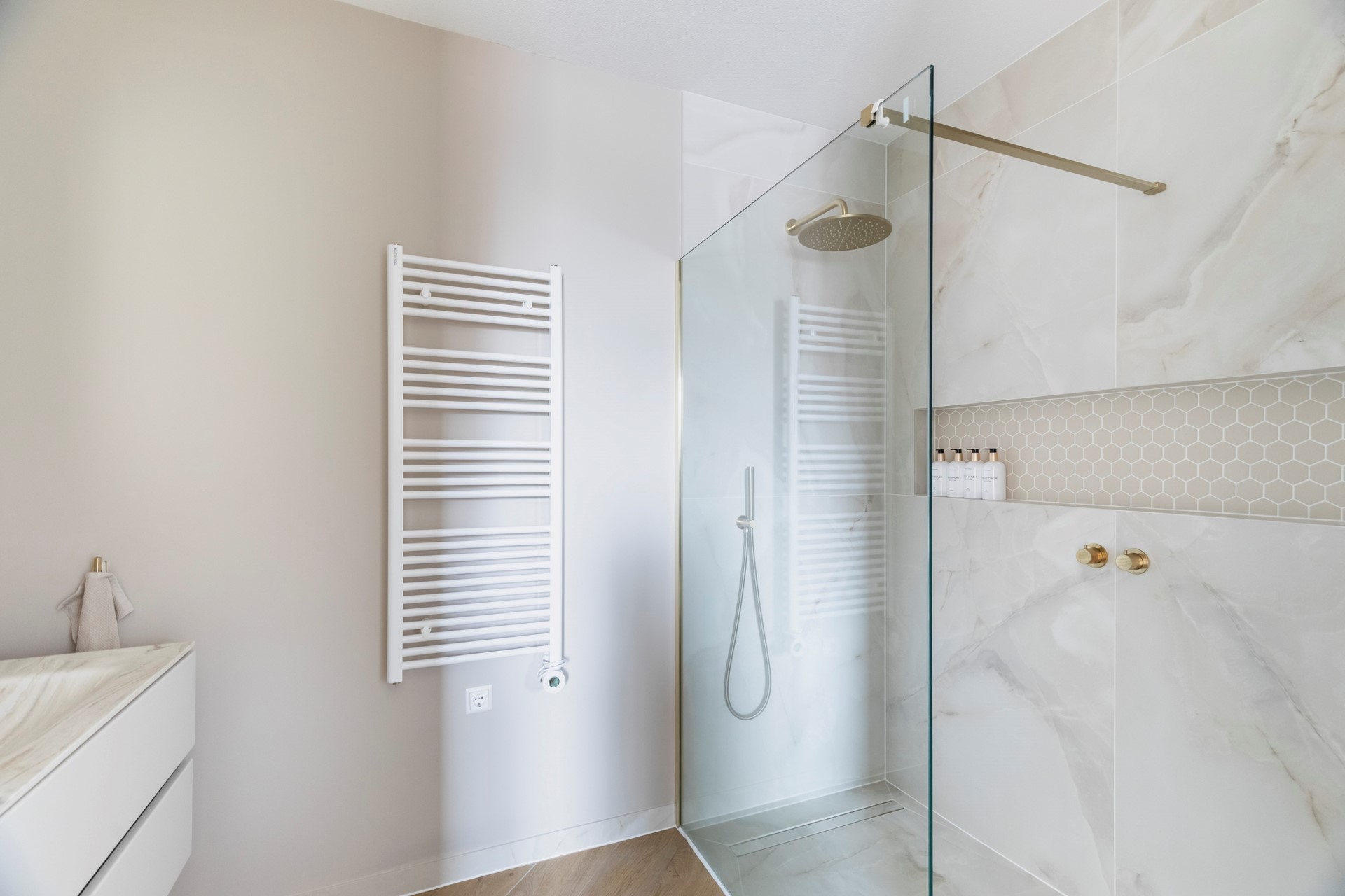 De tweede badkamer is voorzien van een inloopdouche en een dubbele wastafel.