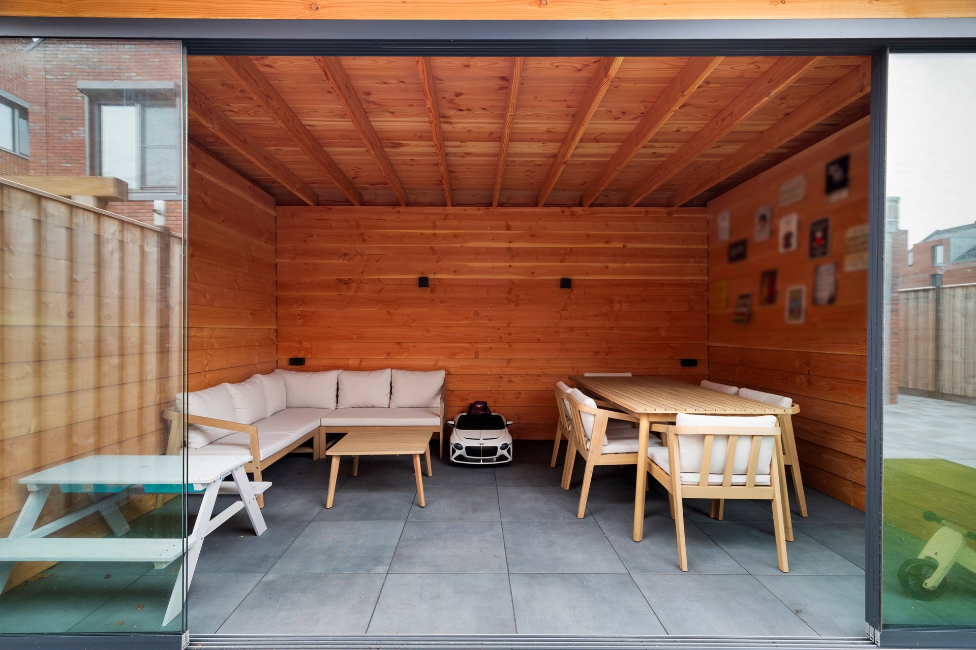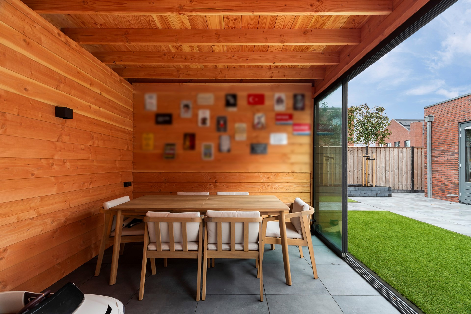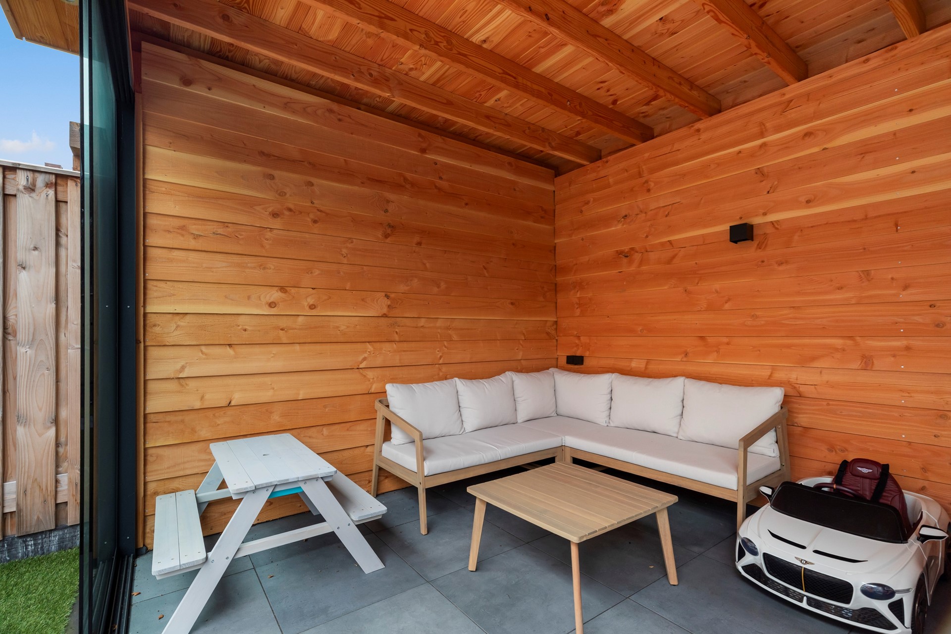 Riante achtertuin gelegen op het zuidwesten, voorzien van keramische tegels en kunstgras. Daarnaast beschikt de tuin over elektrische zonwering en een luxe afsluitbare overkapping met berging. Er is een buitenkraan aanwezig.