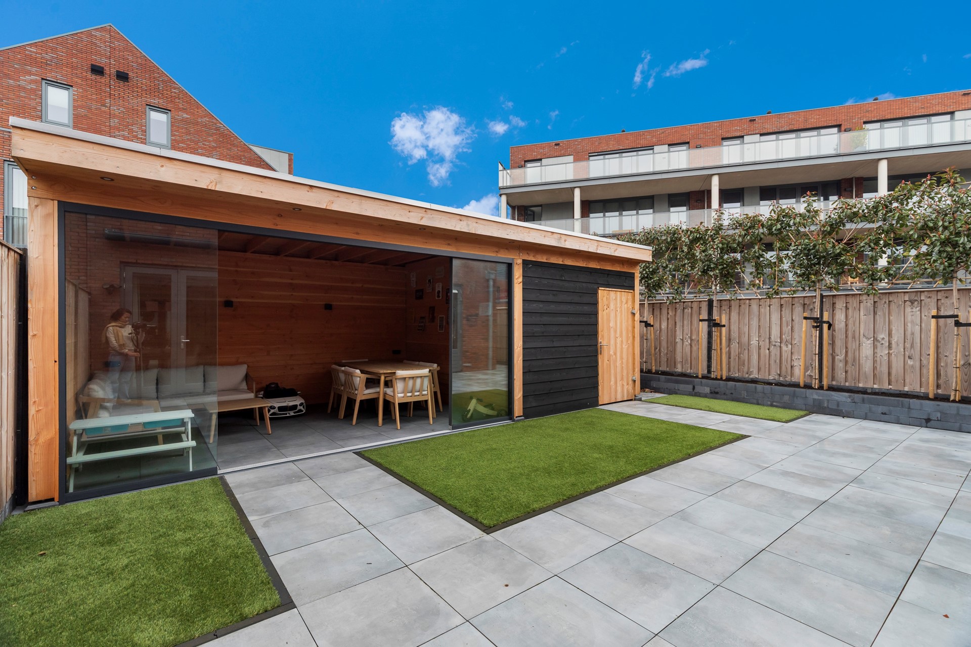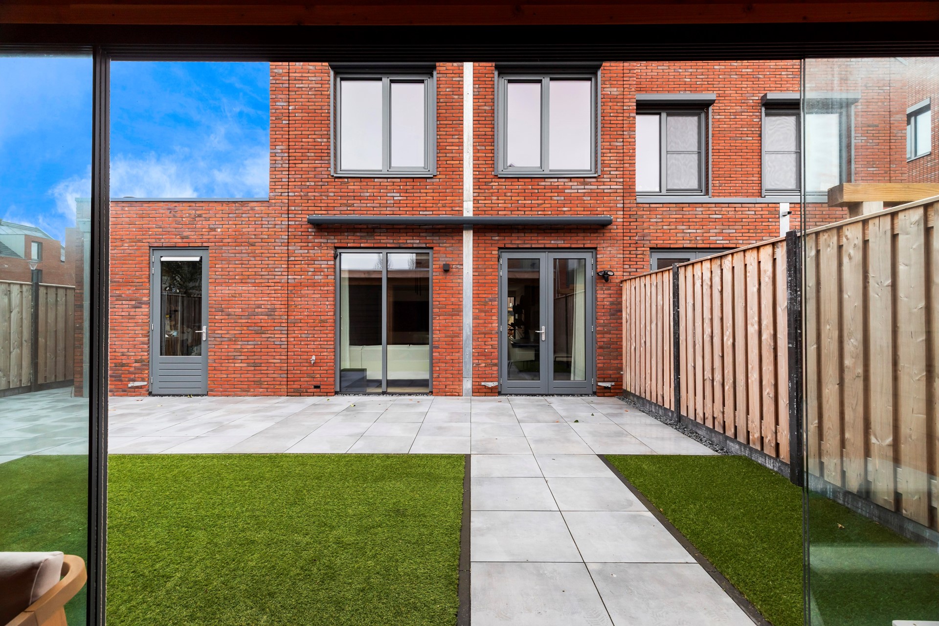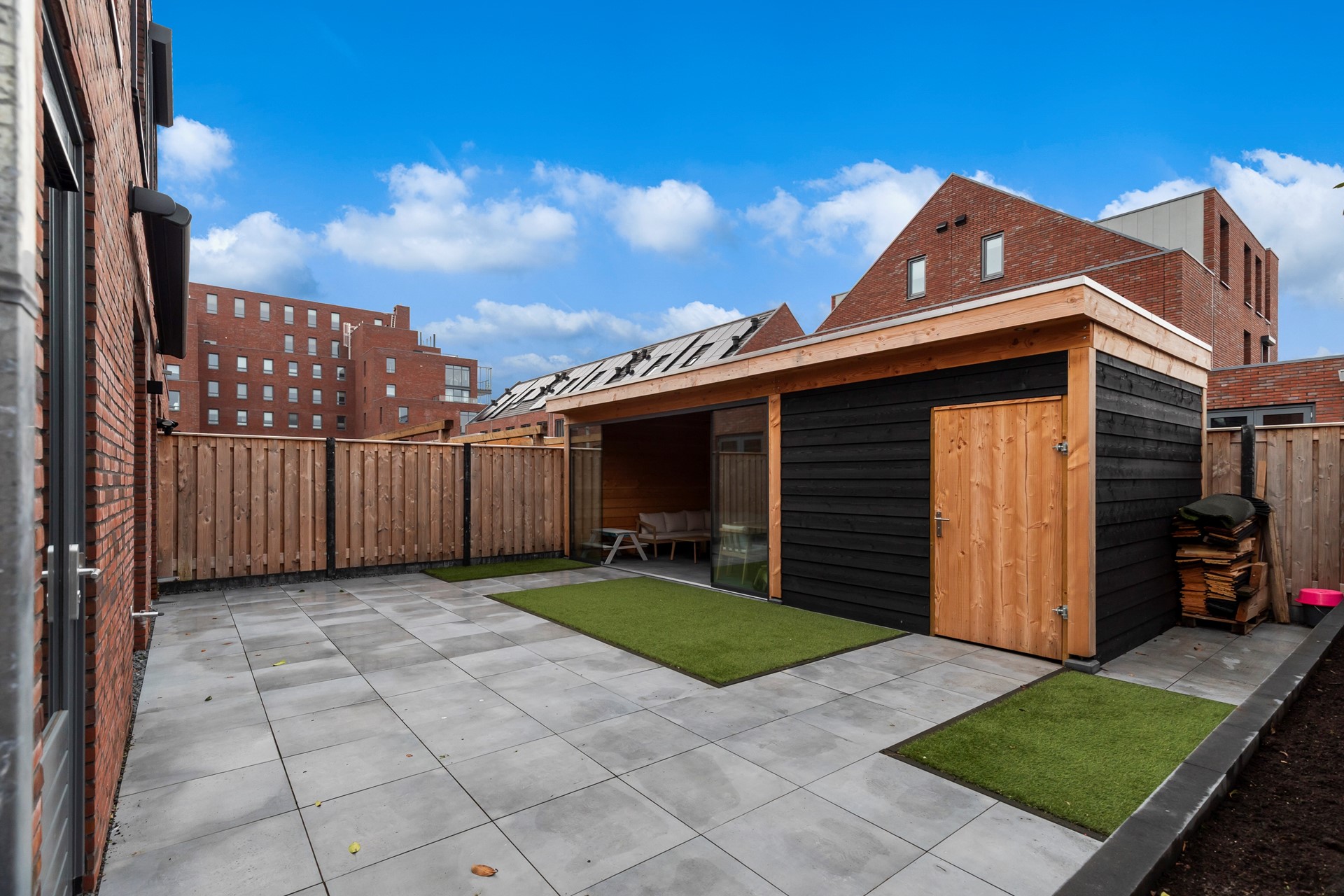 Riante achtertuin gelegen op het zuidwesten, voorzien van keramische tegels en kunstgras. Daarnaast beschikt de tuin over elektrische zonwering en een luxe afsluitbare overkapping met berging. Er is een buitenkraan aanwezig.