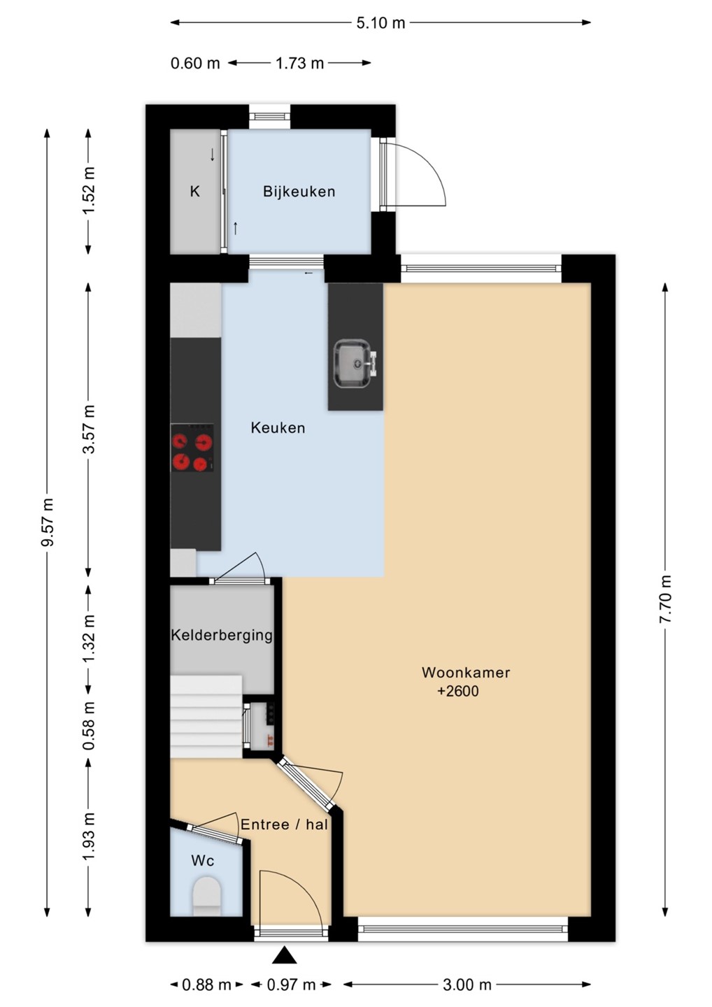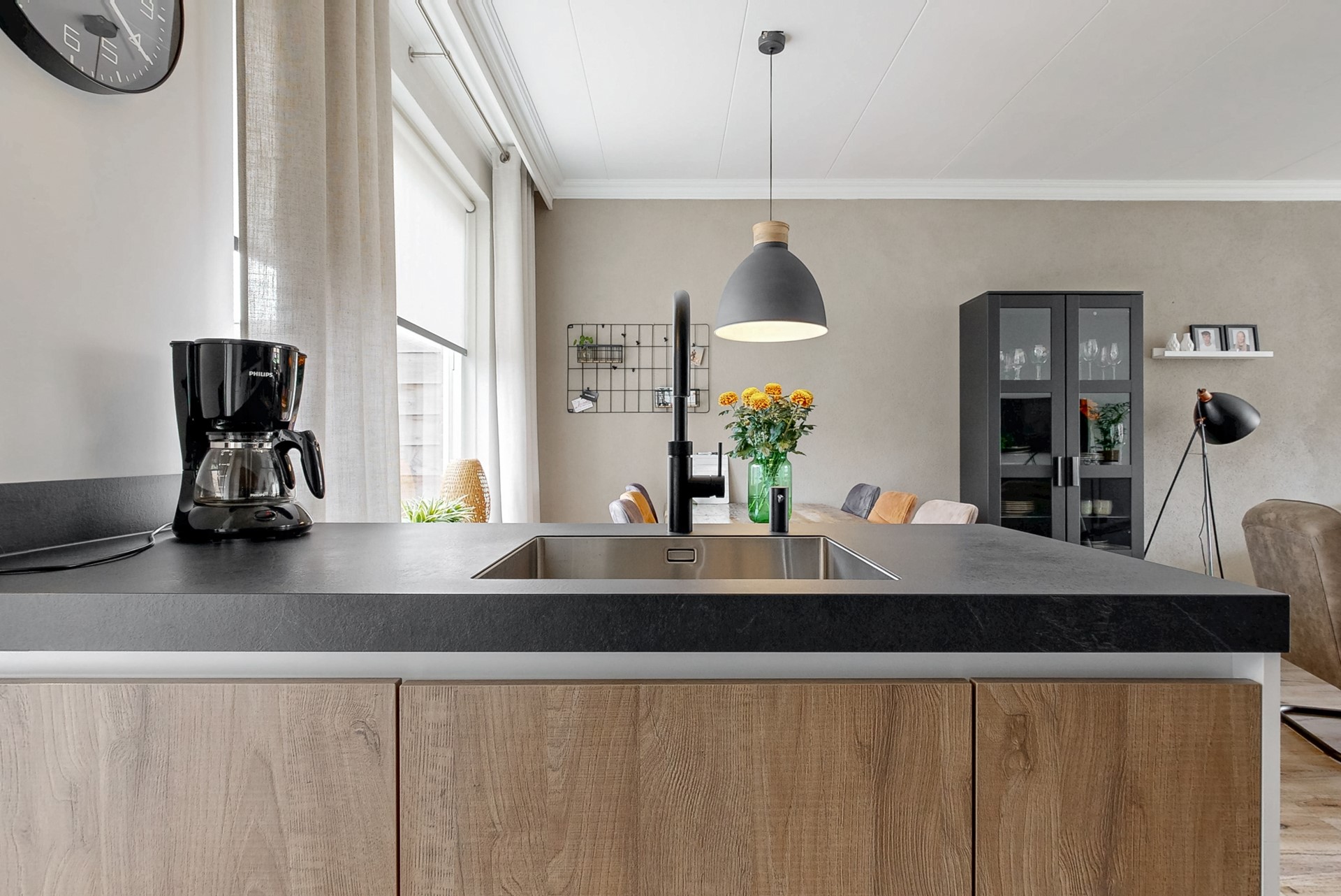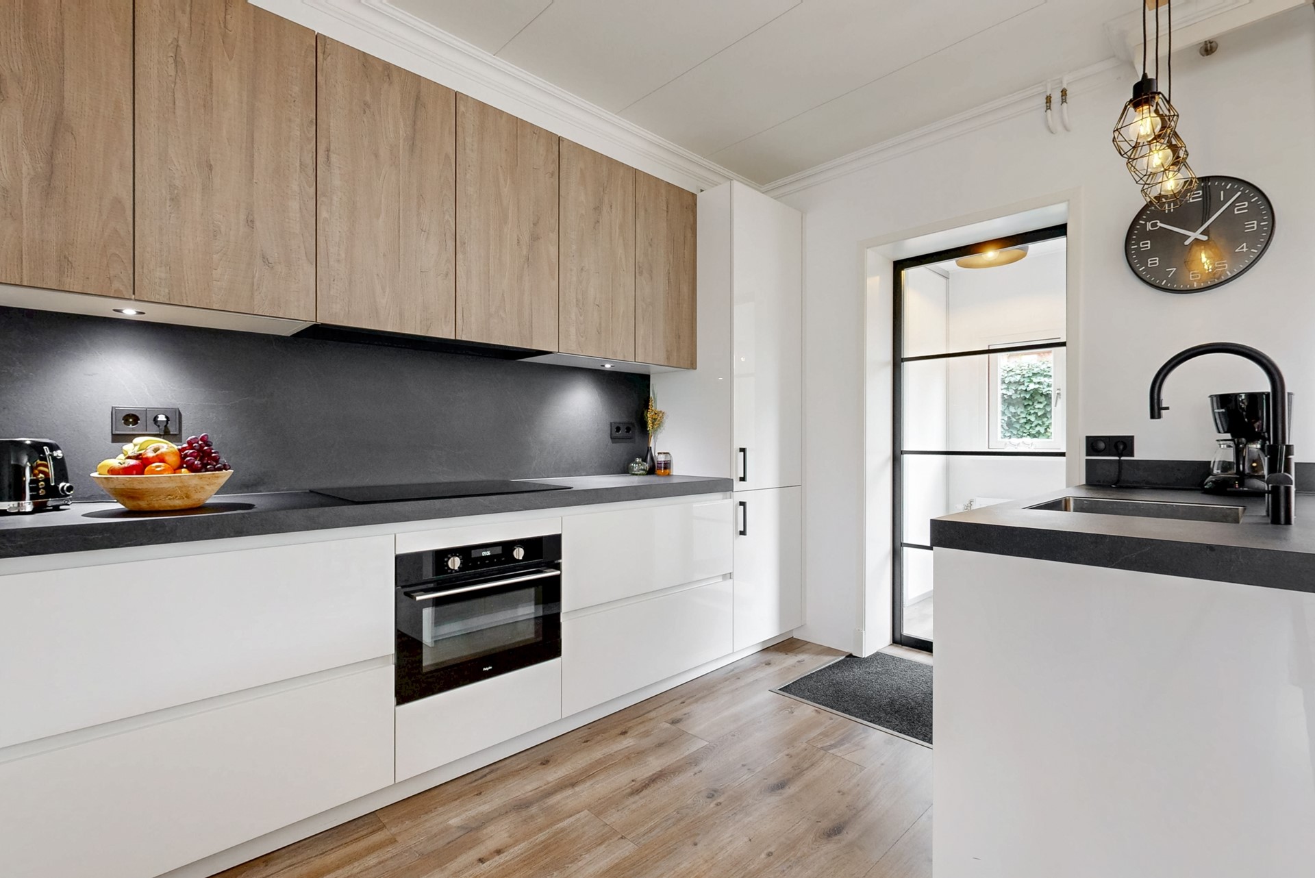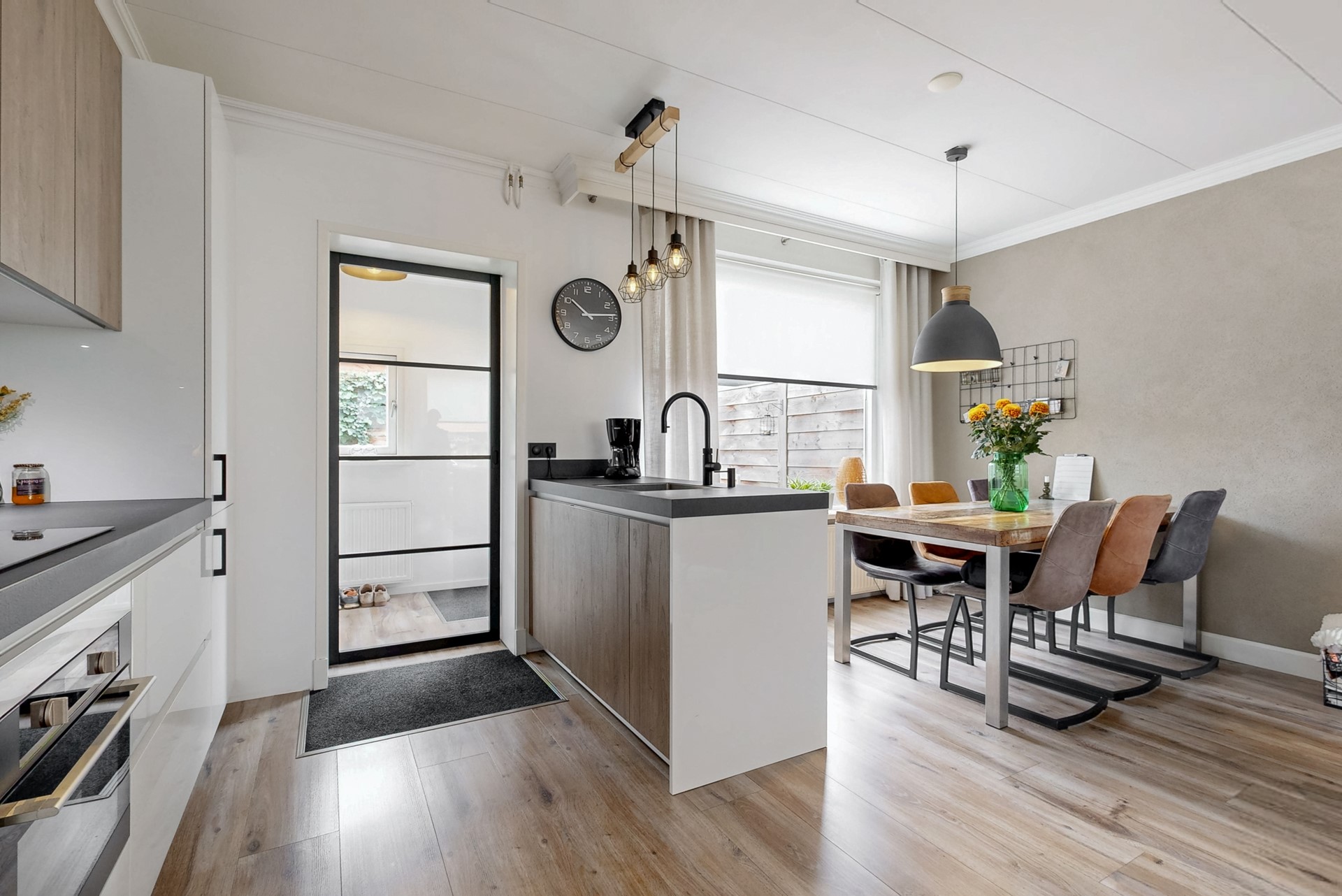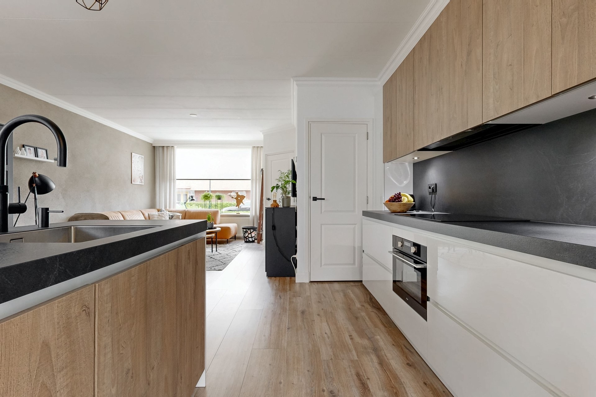 Entree in de hal met de deels betegelde toiletruimte, garderoberuimte, trapopgang en de meterkast. De doorzonwoonkamer is opgedeeld in een zitgedeelte aan de straatzijde en een eetgedeelte nabij de open keuken aan de tuinzijde. De hoge raampartijen zorgen voor een prettig lichtinval. De moderne open keuken met spoeleiland is in 2021 geplaatst en voorzien van alle denkbare gemakken. Zo vind je hier een vaatwasser, inductiekookplaat, combi-oven, Quooker en koelkast. Vanuit hier toegang tot de praktische trap- / kelderkast - ideaal voor proviand en opslag. Ook de bijkeuken is in 2021 aangebouwd en biedt naast de toegang tot de achtertuin een vaste kastenwand.
