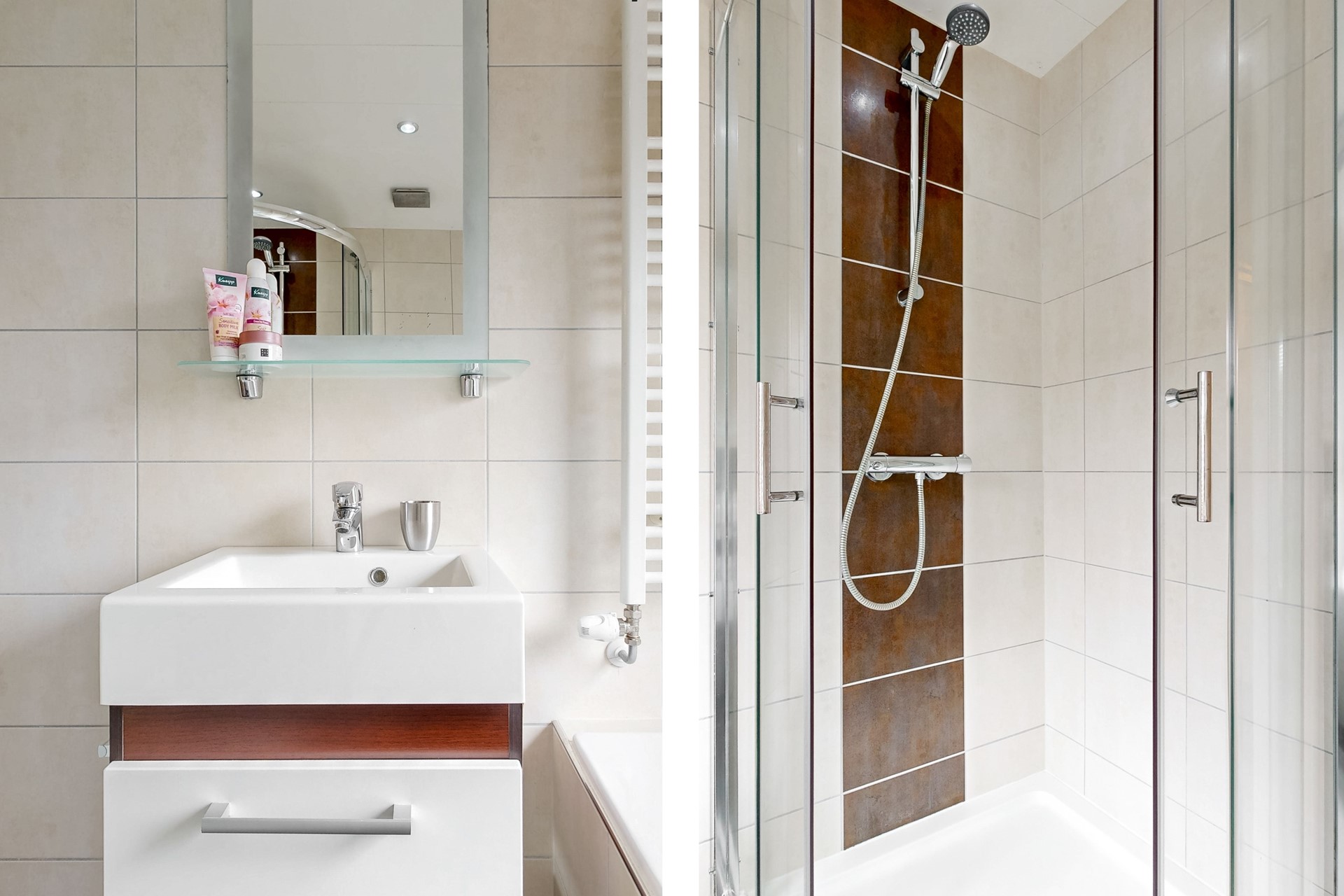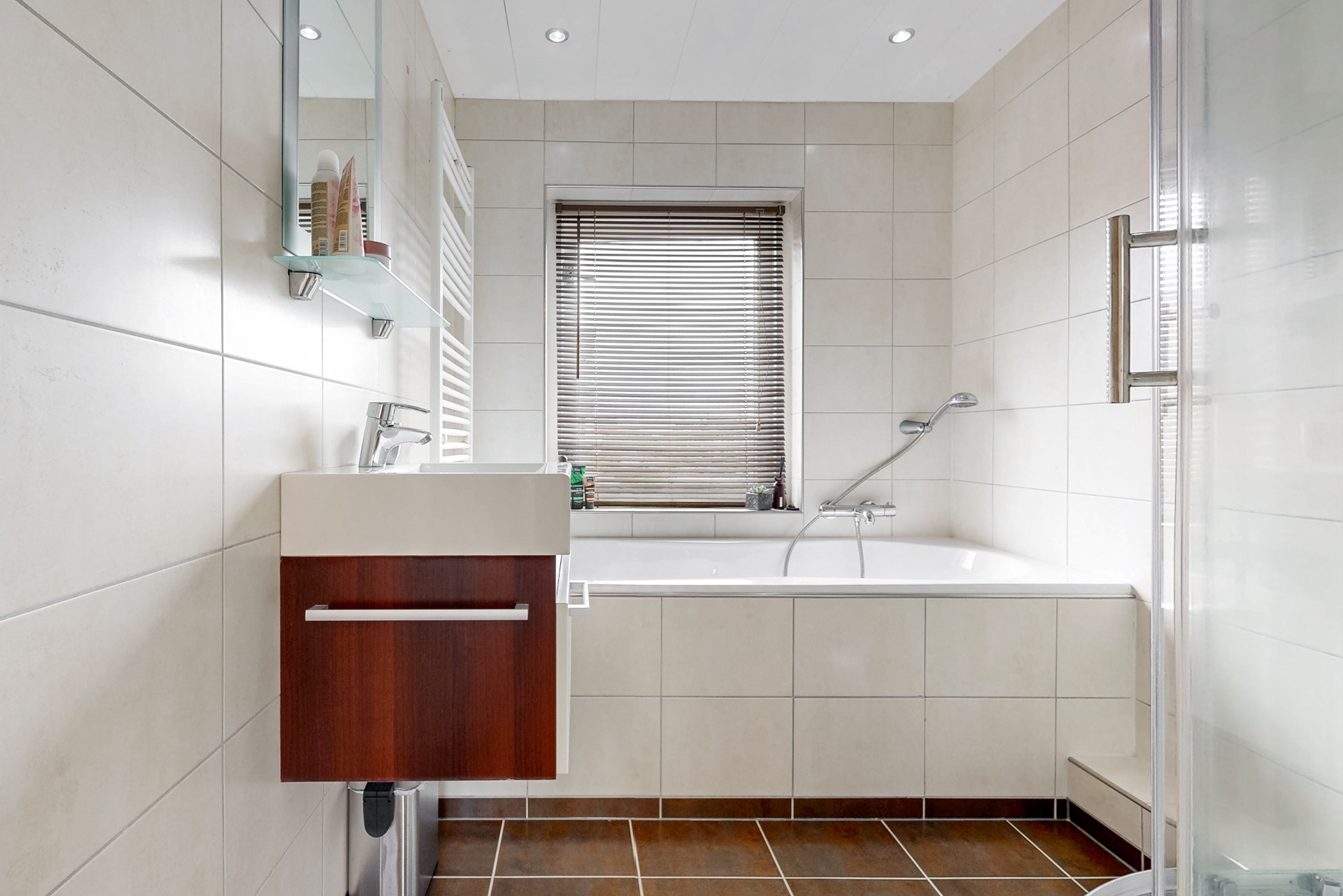 Vanaf de overloop toegang tot drie slaapkamers, de badkamer en de trapopgang naar de zolderetage. De ouderslaapkamer is aan de straatzijde gesitueerd en uitgerust met kastruimte. De tweede slaapkamer bevindt zich aan de tuinzijde en beschikt over een vaste kast. De raampartijen in deze kamer zijn uitgerust met rolluiken. Ook de derde slaapkamer bevindt zich aan de tuinzijde en beschikt eveneens over een rolluik. De keurige badkamer is geheel betegeld en biedt een ligbad, douchecabine, wasmeubel en een designradiator.