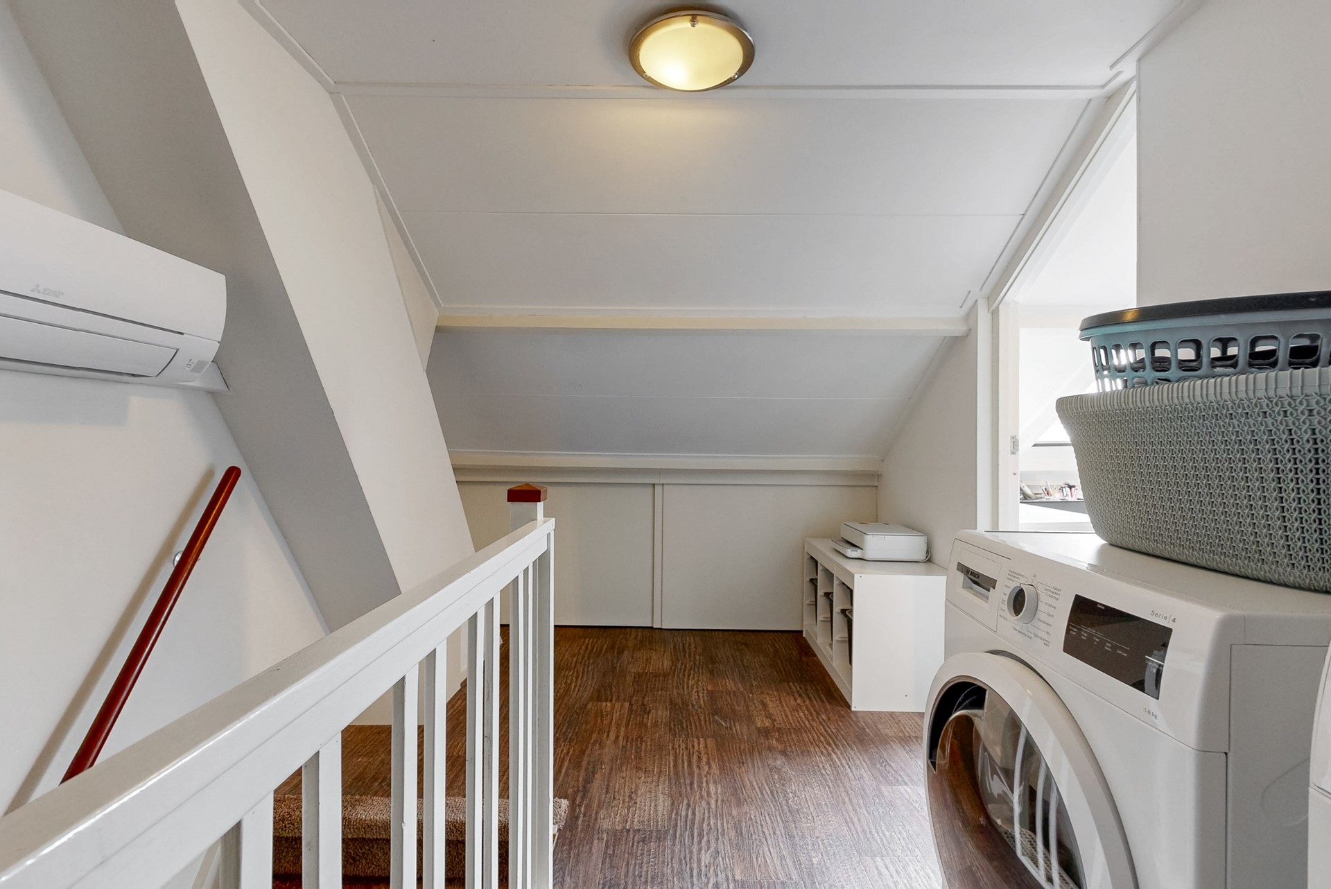 Voorzolder met de witgoedaansluitingen, de CV-installatie (2021), een airconditioning-unit en bergruimte achter de knieschotten. Op deze etage vind je de vierde slaapkamer met Velux-dakraam.