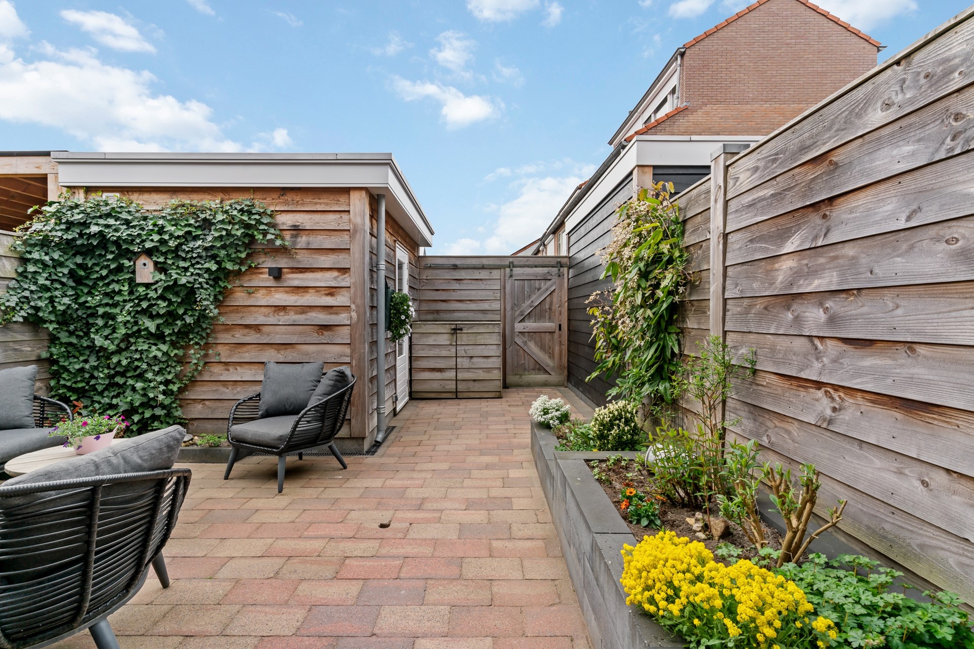 Door de zuidelijke ligging geniet de keurige en in 2021 aangelegde achtertuin de hele dag van optimale zon waar door het elektrische zonnescherm ook een schaduwrijke plek eenvoudig te creëren is. De tuin is grotendeels voorzien van sierbestrating en biedt meerdere plantenborders. Zowel de aanbouw als de schuur, welke ook in 2021 is geplaatst, zijn deels bekleed met luxe en weerbestendig red ceder. Via een barndeur toegang tot de achtergelegen brandgang.