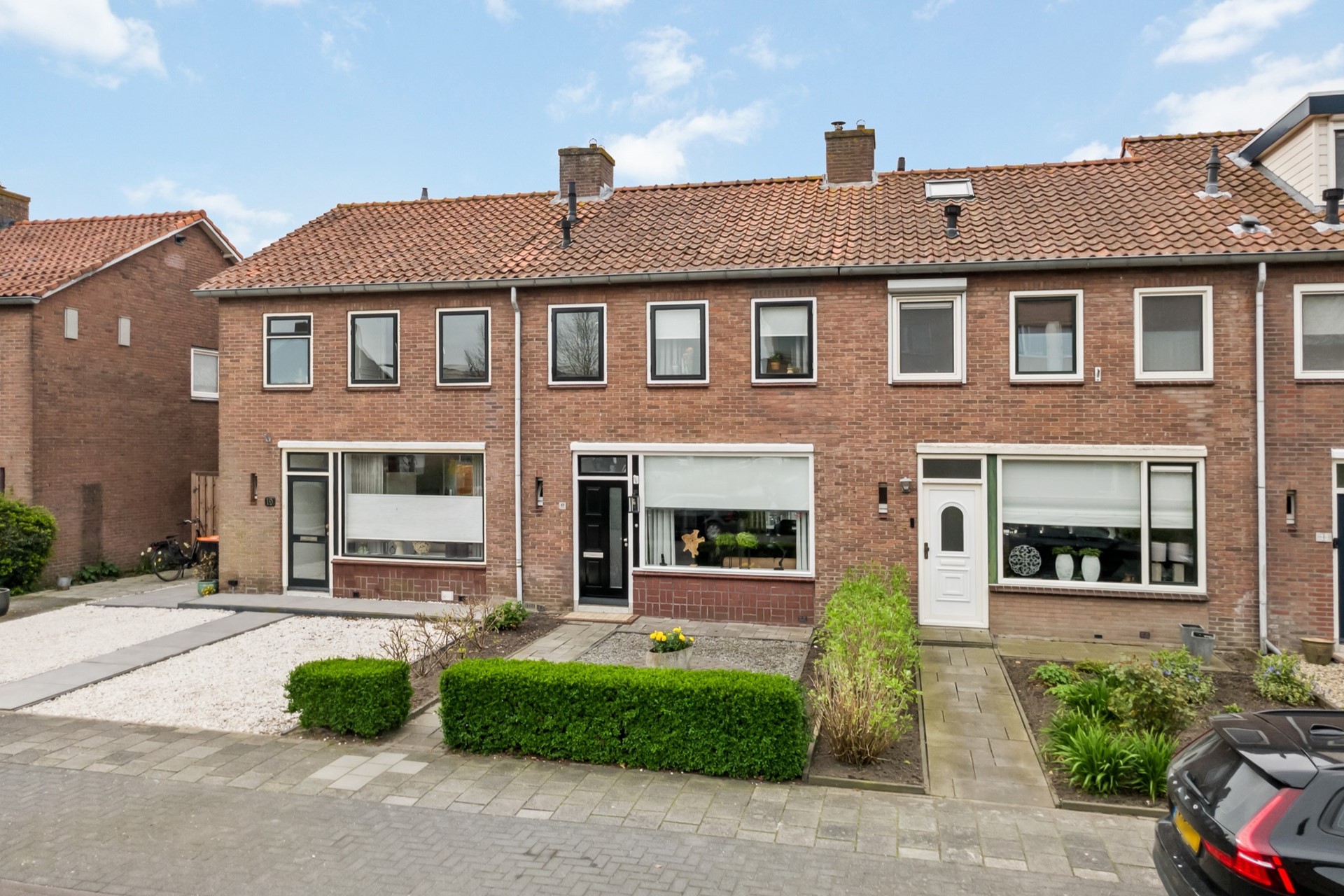De ca. 6 meter diepe voortuin is aangelegd met plantenborders, een heg en grind. Via een bestraat pad toegang tot de woning.