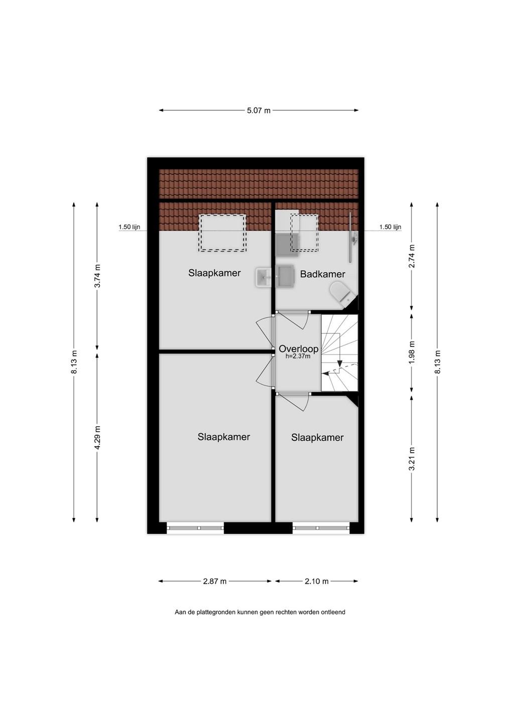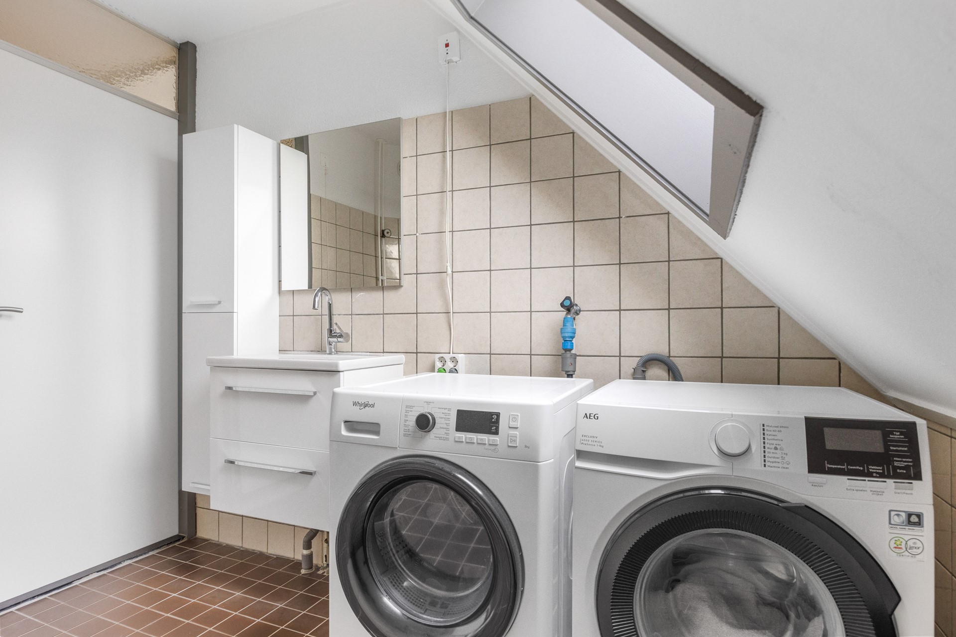 Eerste verdieping: Overloop, drie slaapkamers waarvan één met airco, badkamer met douchehoek, wastafel met meubel, toilet en witgoedopstelling.