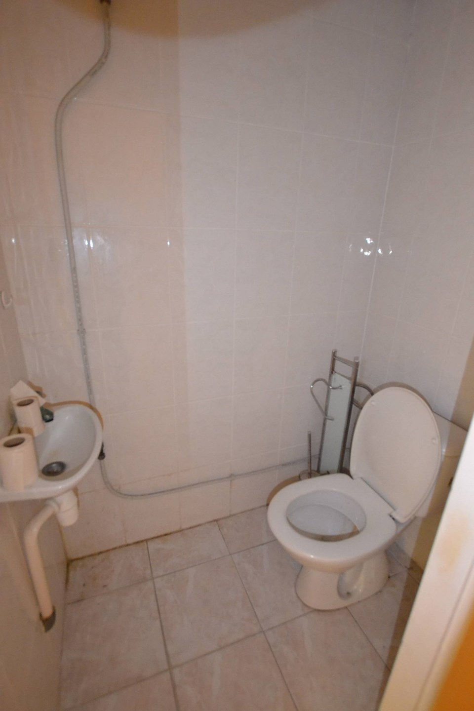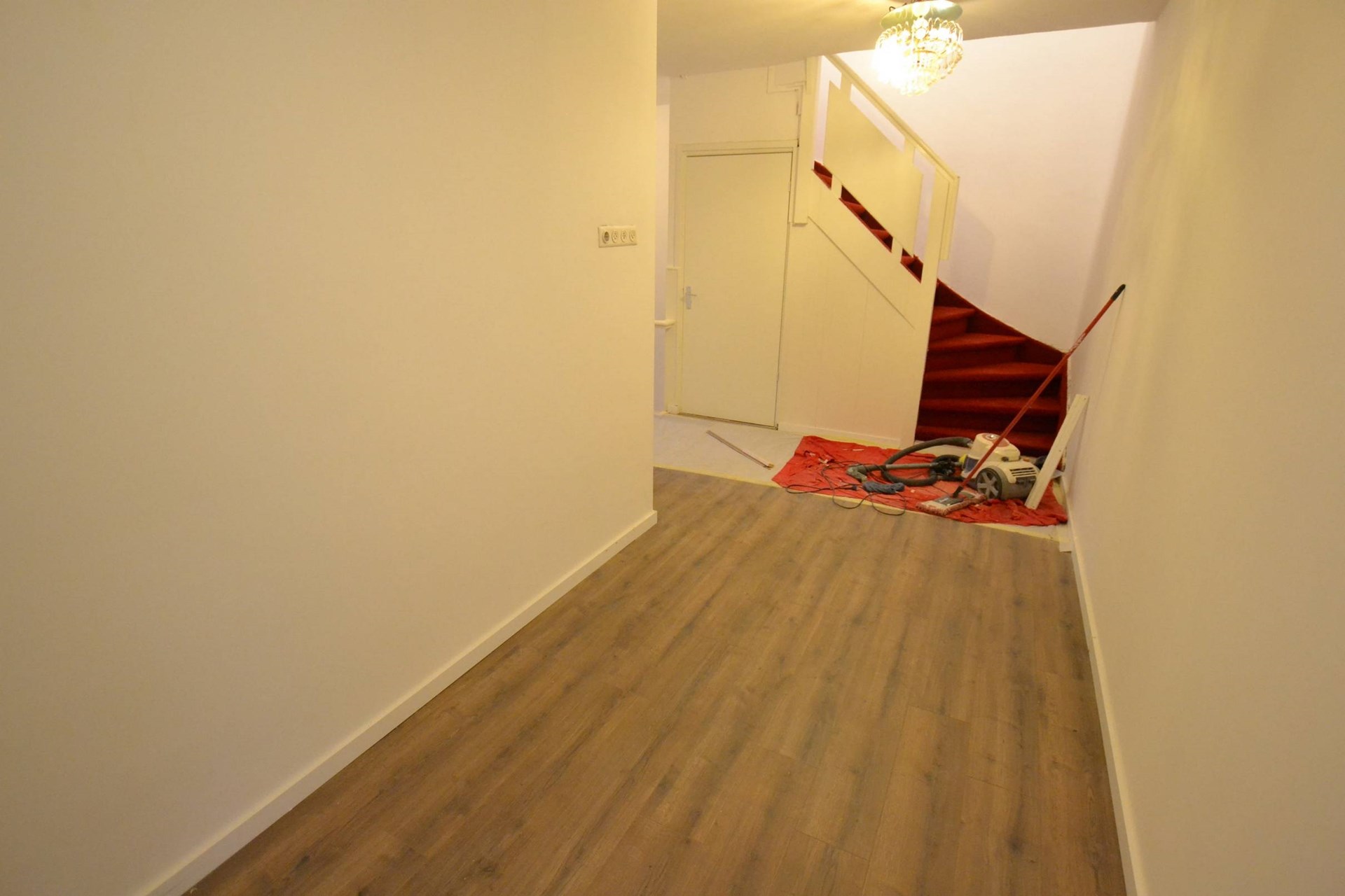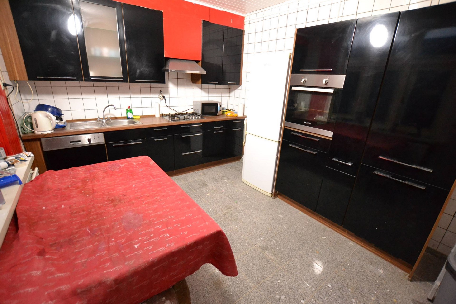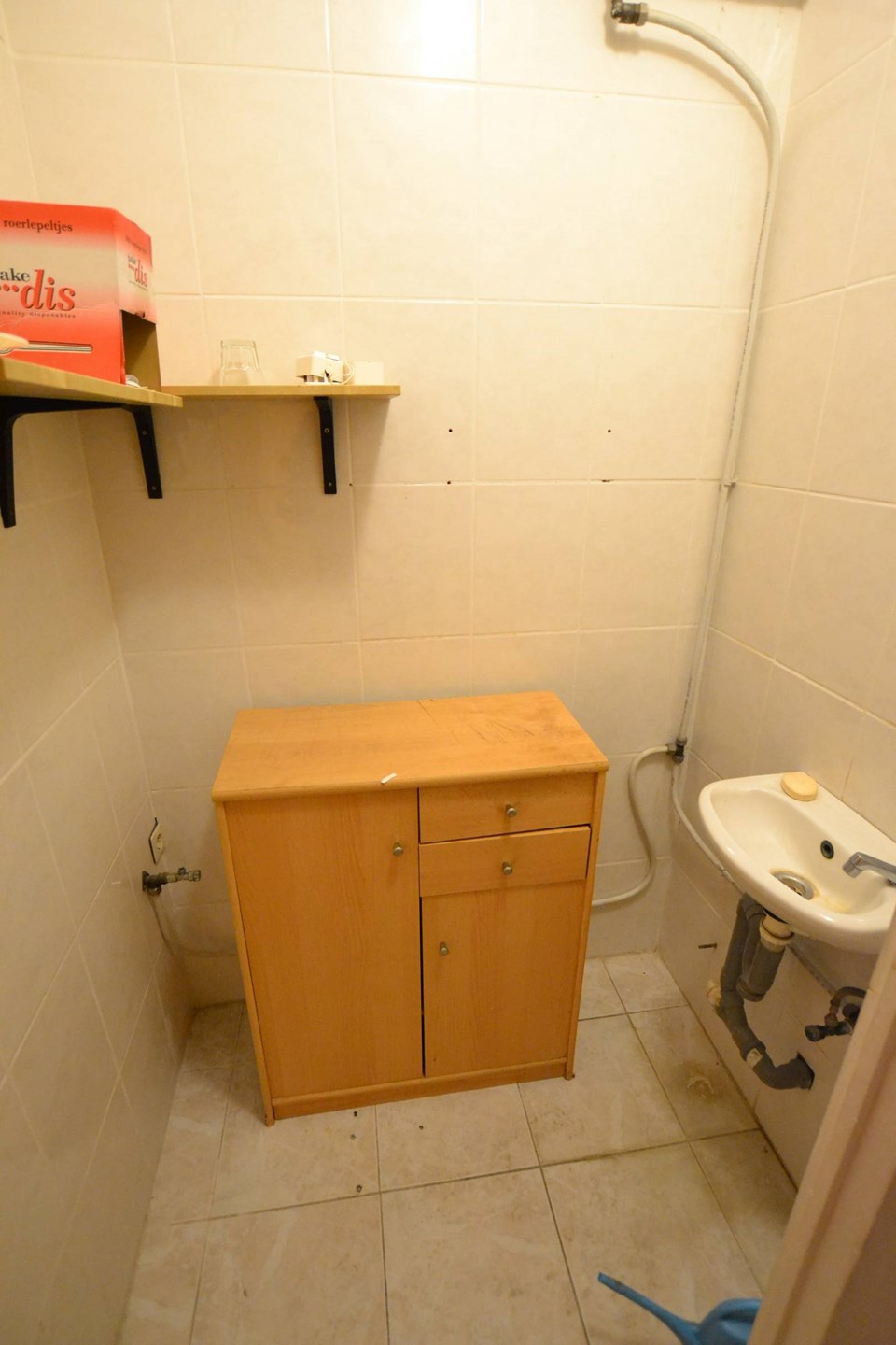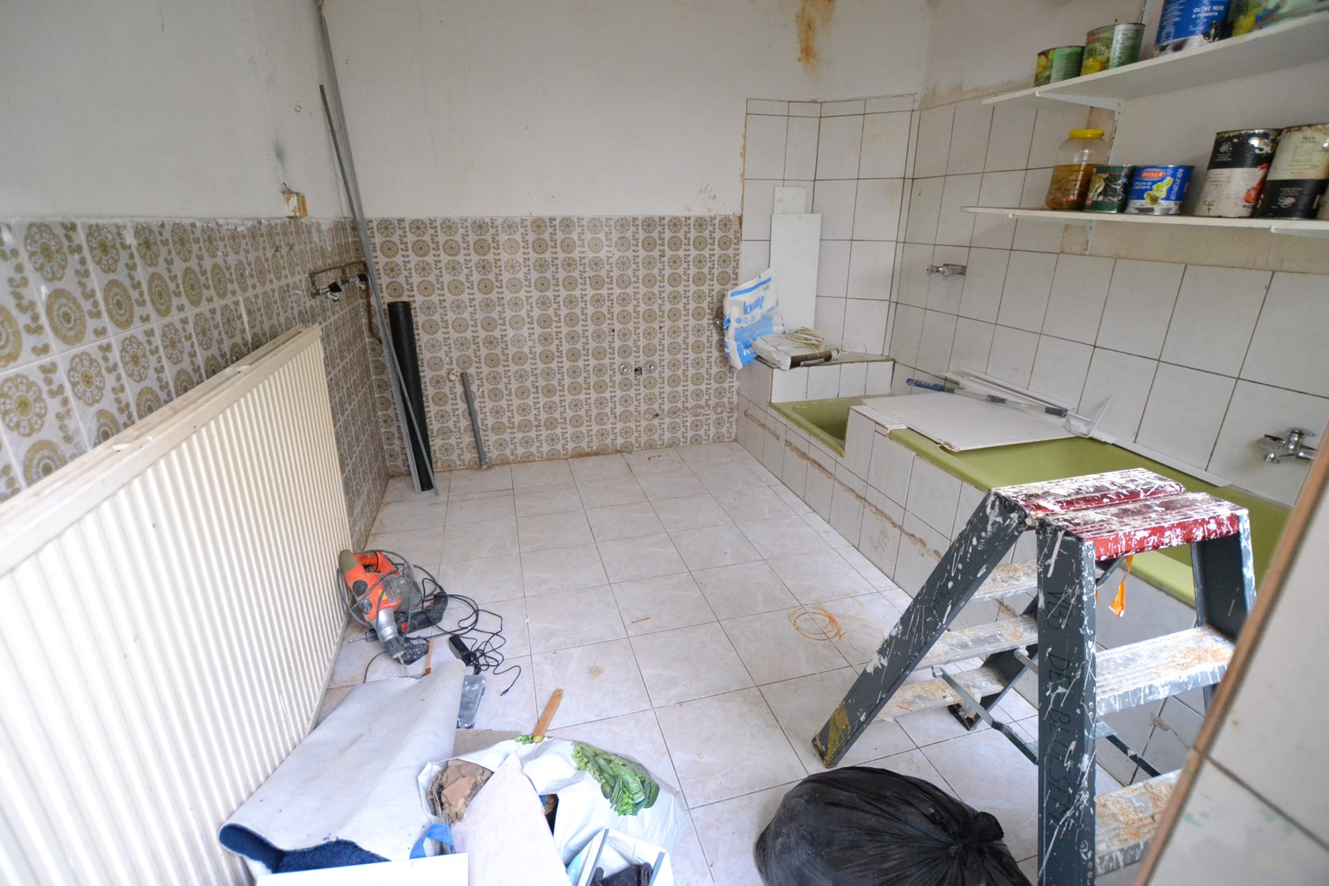 Grote opslagruimte, keuken met aanbouwkeuken, badkamer, toiletruimte, wasruimte, deur naar kelder en achtertuin.