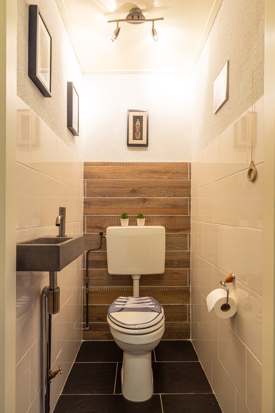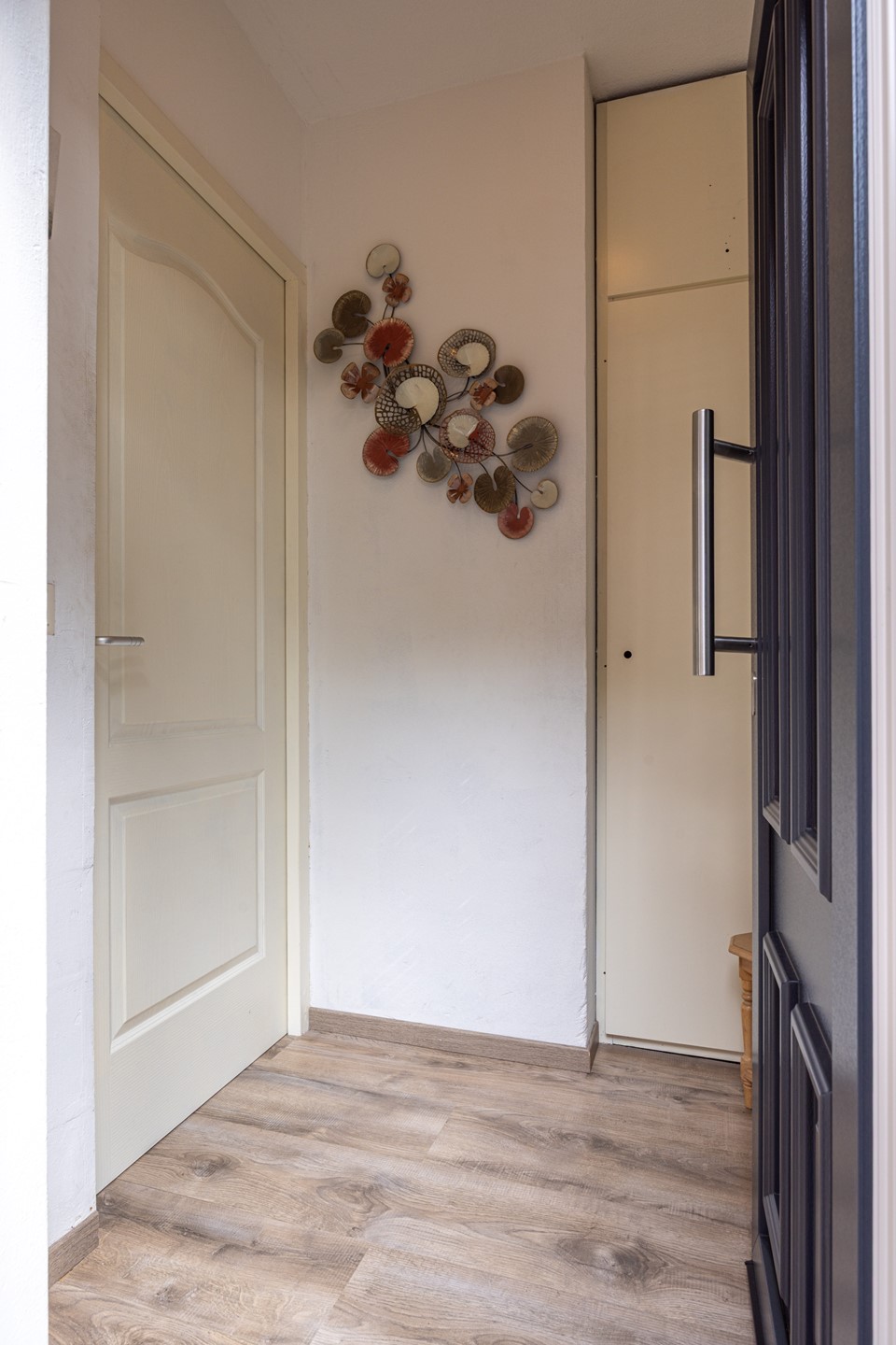 Bij binnenkomst valt direct de onderhoudsvriendelijke voortuin op, gevolgd door een nette ontvangsthal met laminaatvloer, garderobe, meterkast en een toilet met fonteintje.