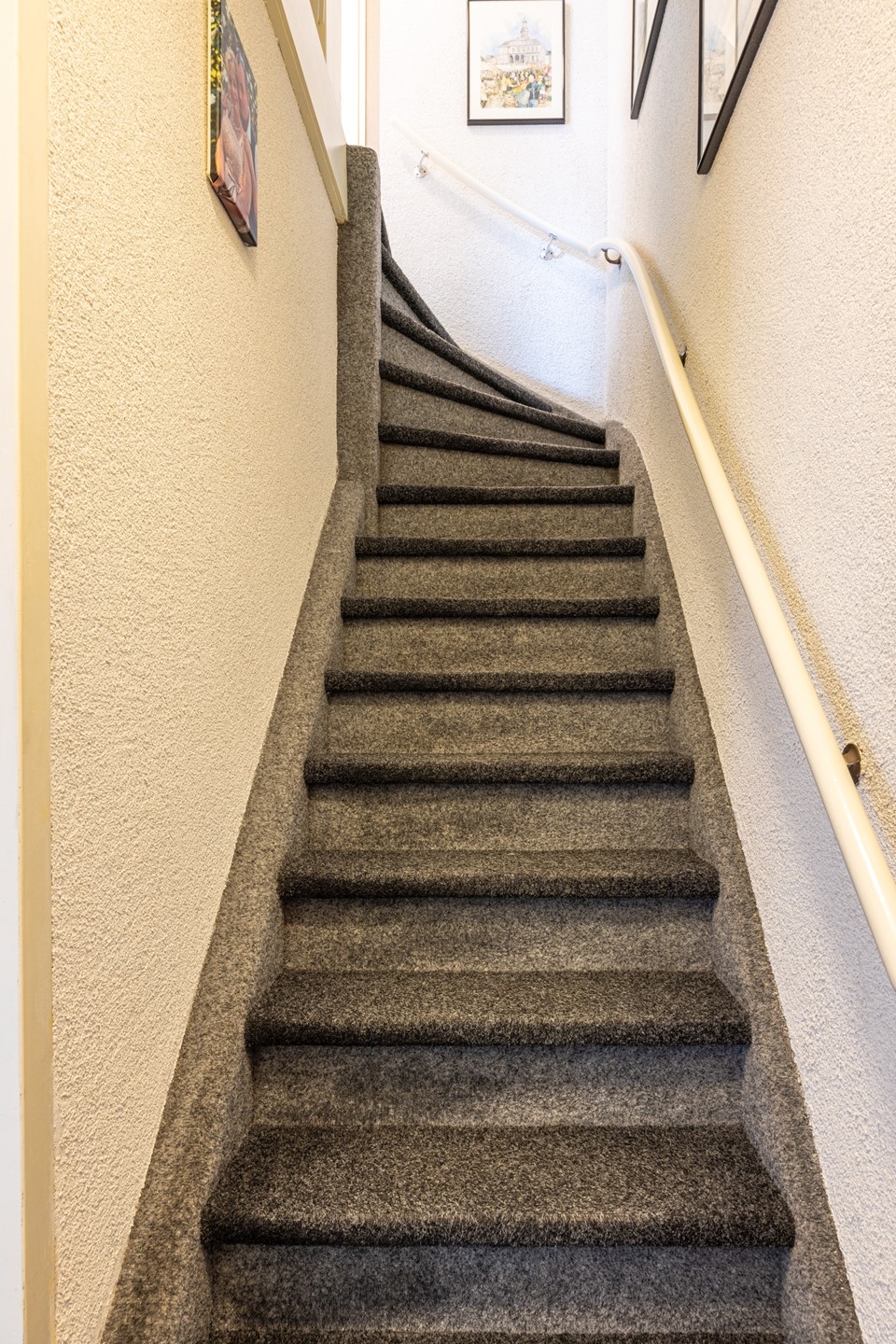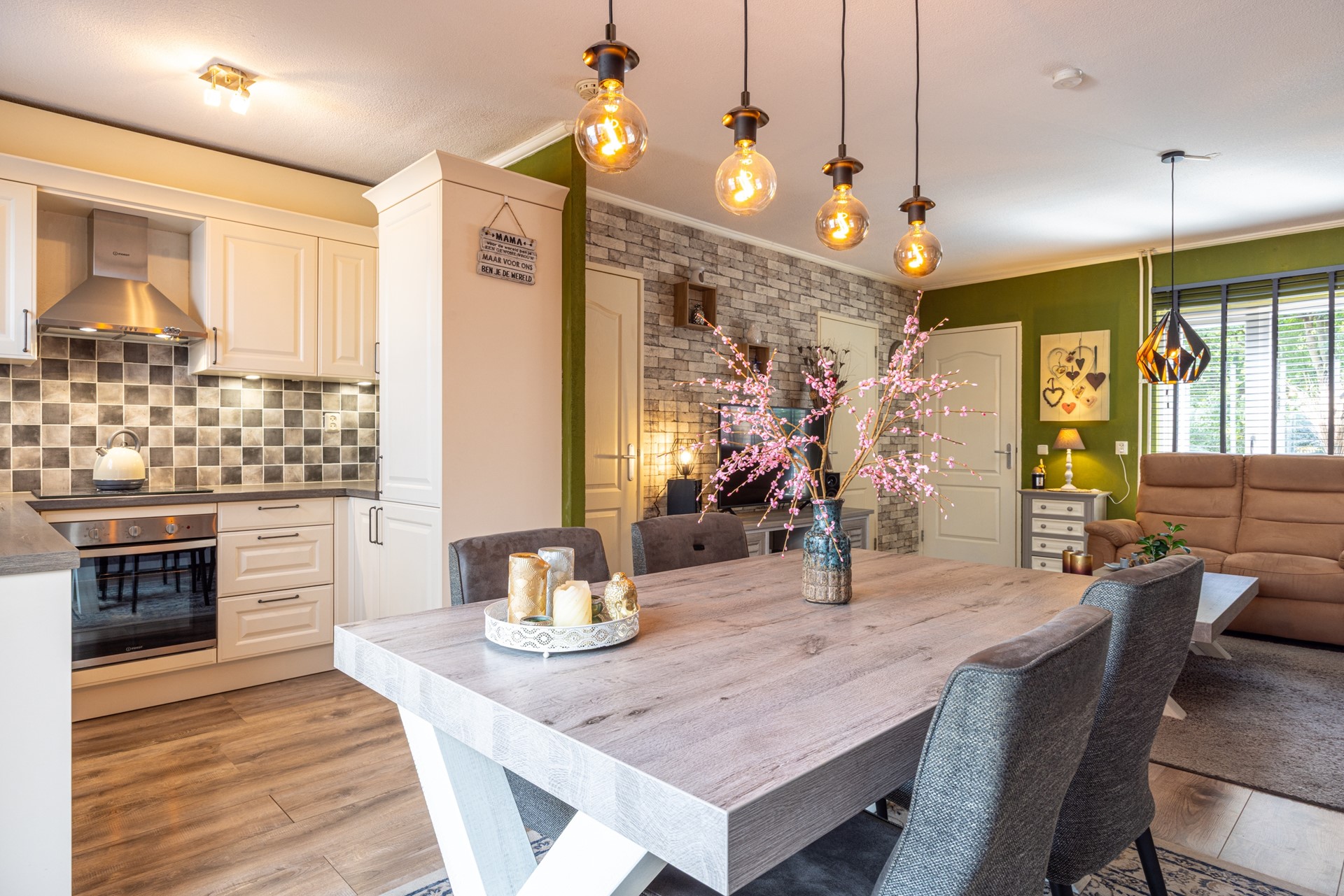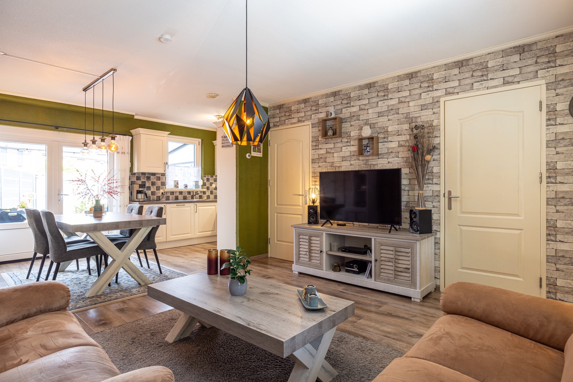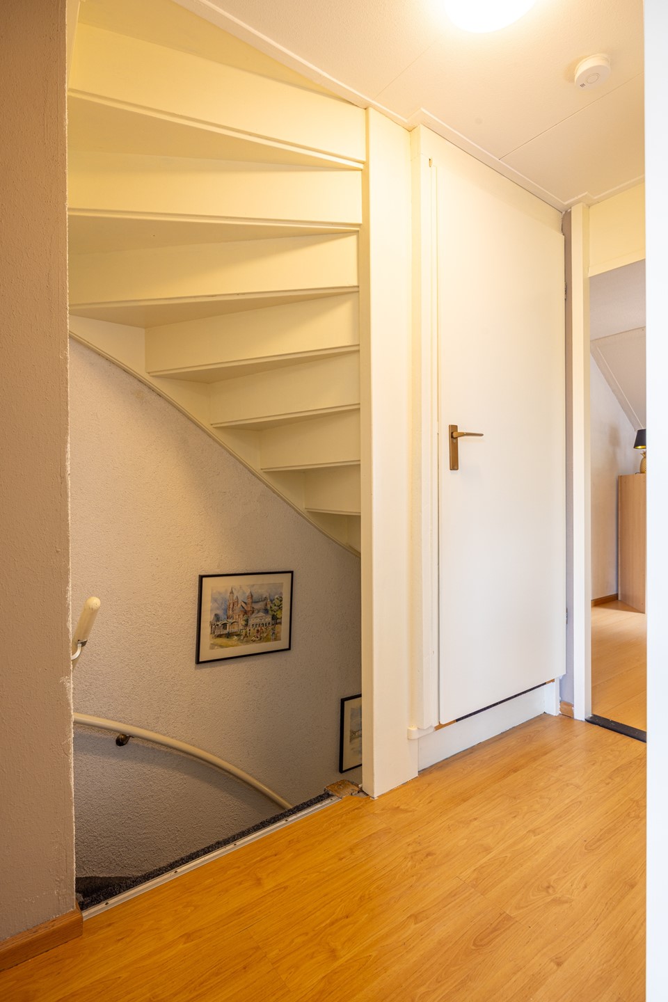 De doorzonwoonkamer is sfeervol afgewerkt, voorzien van een laminaatvloer en geniet van veel daglichtinval. Via de openslaande deuren bereikt u het overdekte terras in de achtertuin. De gesloten trapopgang naar de eerste verdieping zorgt voor extra rust in de woonkamer.