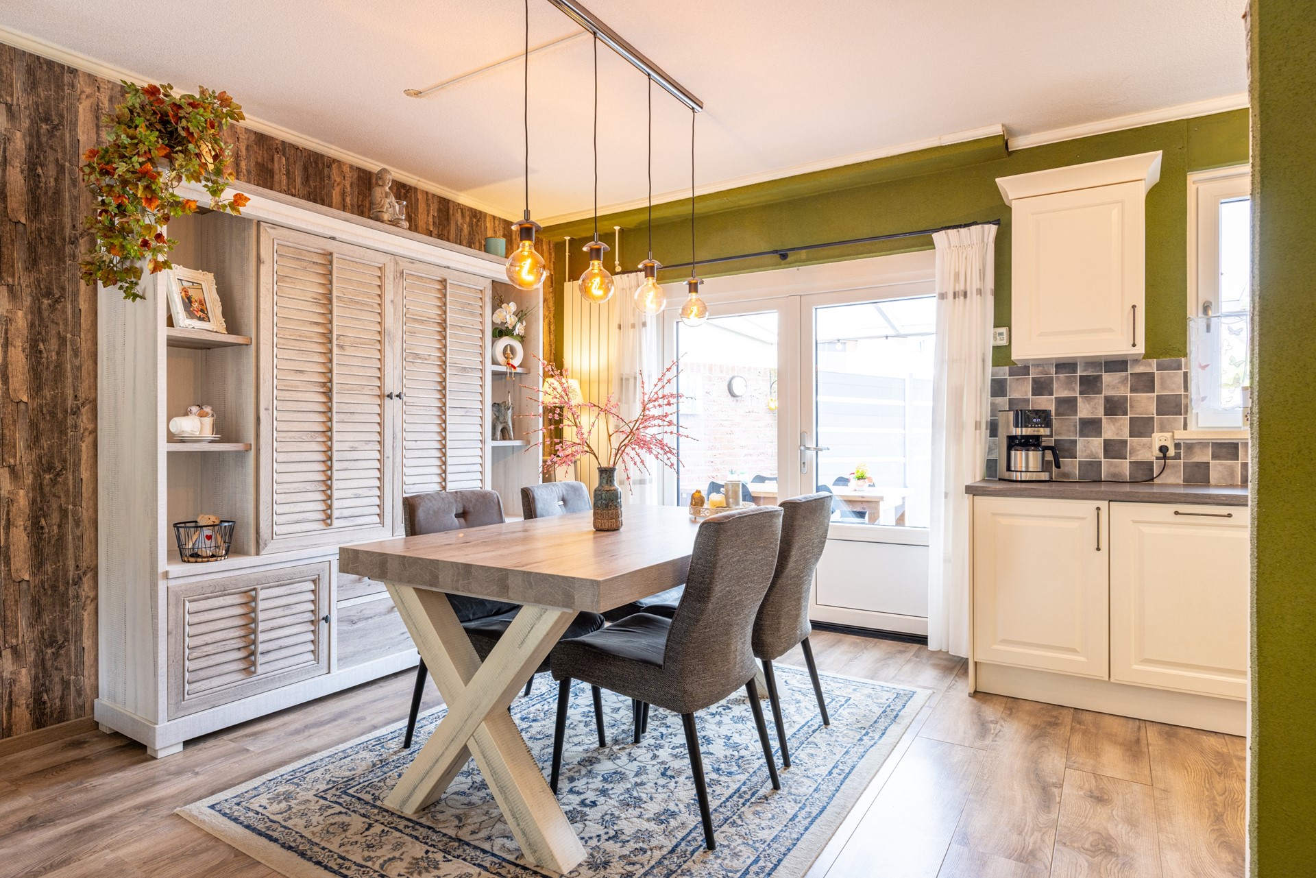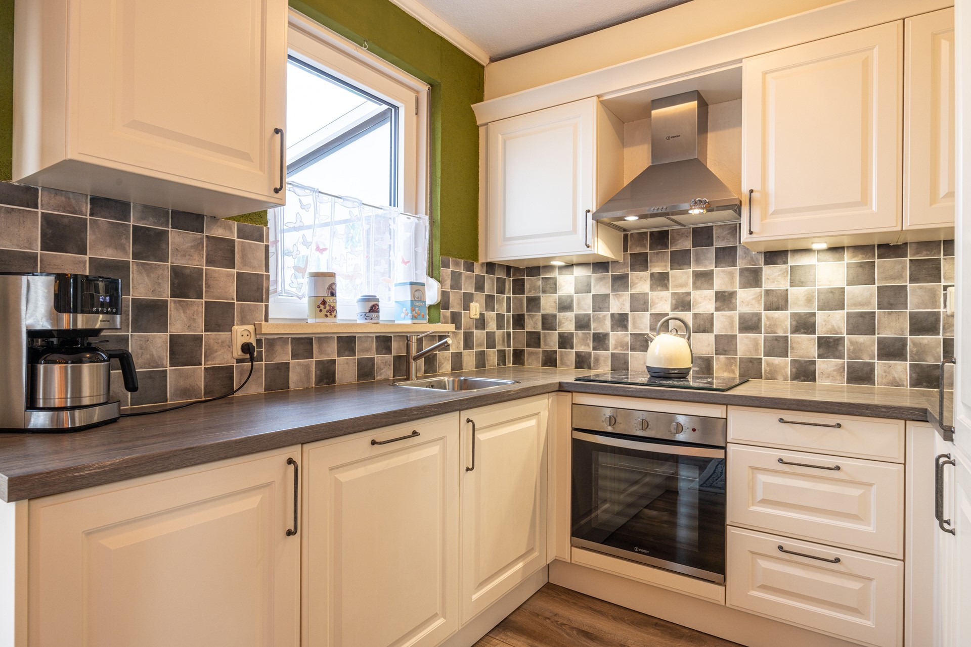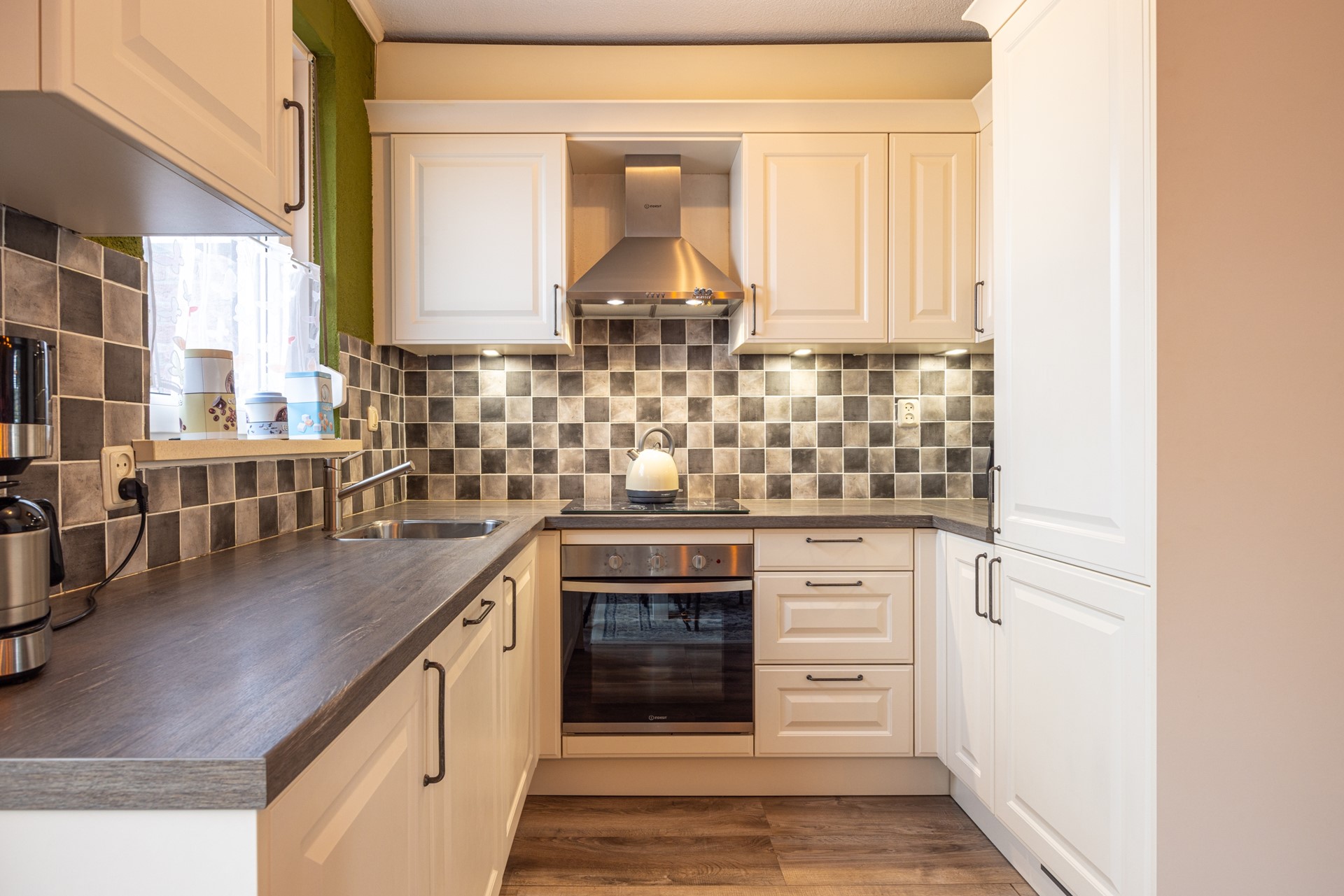 De open keuken in U-opstelling sluit mooi aan op de woonkamer en is eveneens voorzien van een laminaatvloer. De keuken is praktisch ingedeeld met voldoende werk- en kastruimte en uitgerust met alle benodigde inbouwapparatuur, waaronder een inductiekookplaat, heteluchtoven, afzuigkap, koelkast, vriezer en vaatwasser. Vanuit de keuken heeft u een prettig uitzicht op de achtertuin.
