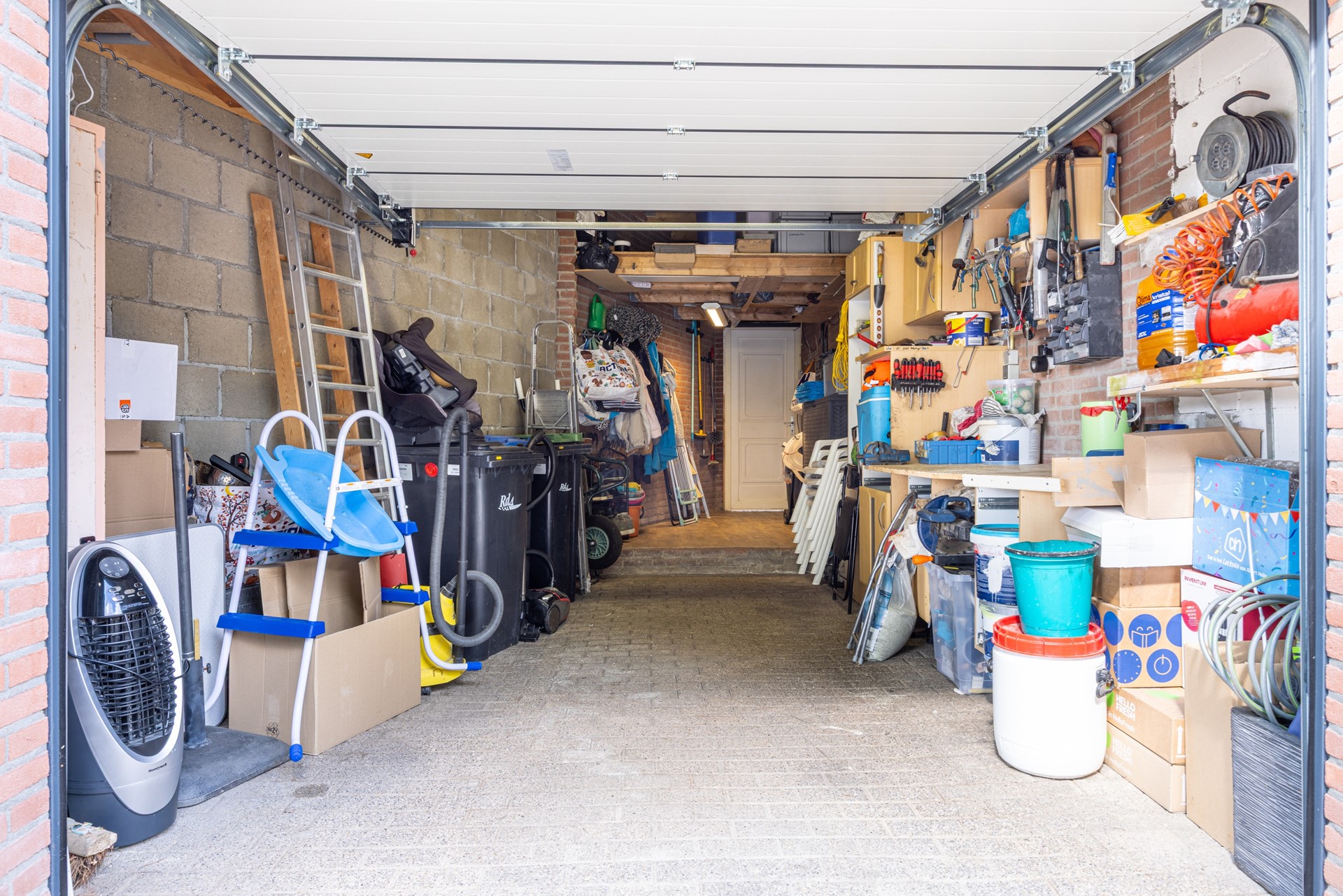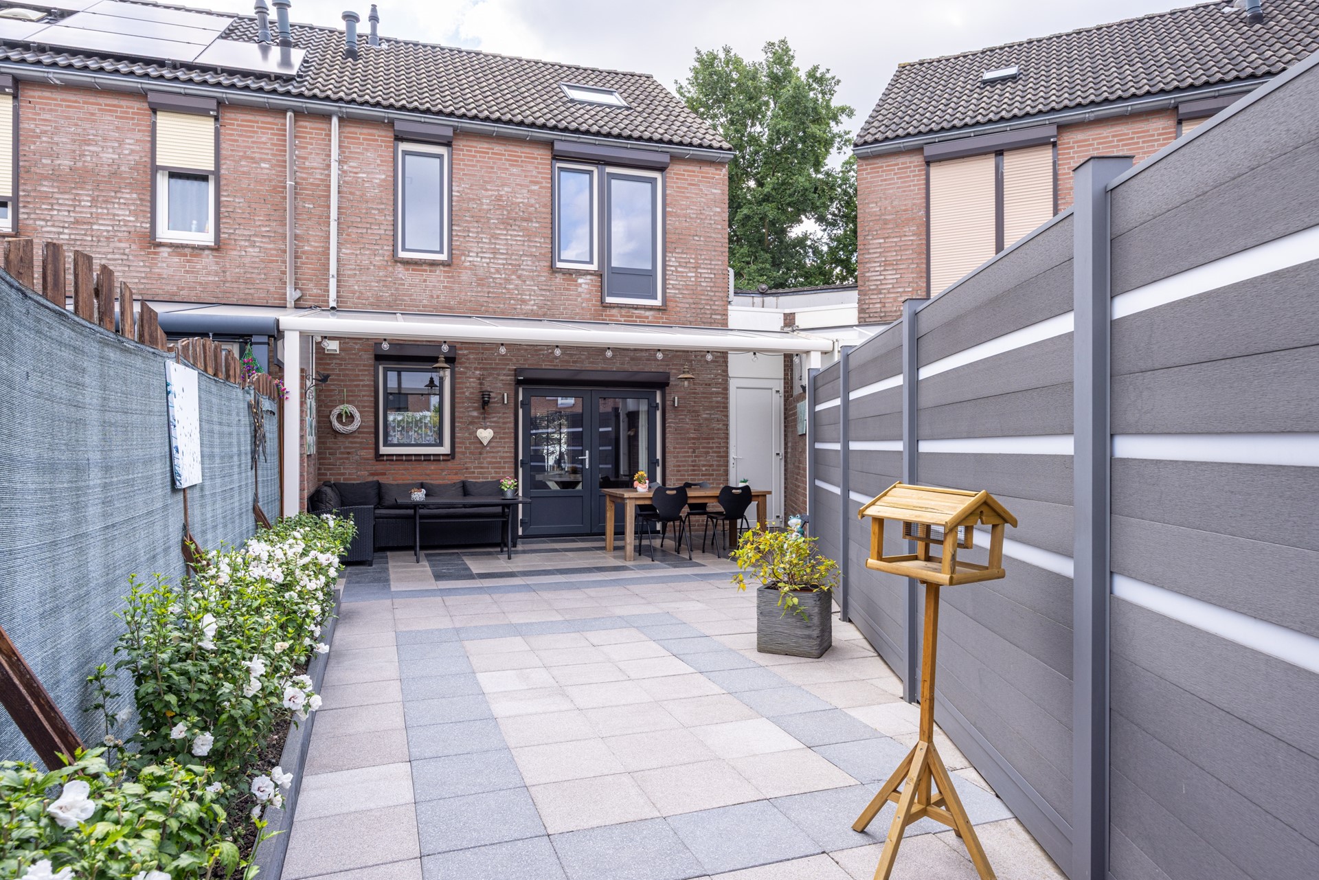 De achtertuin is volledig betegeld, onderhoudsvriendelijk en beschikt over een achterom. Het overdekte terras biedt een heerlijke plek om in alle seizoenen van het buitenleven te genieten. De borders met groen zorgen voor een frisse uitstraling. Vanuit de tuin is er toegang tot de garage, die is voorzien van een sectionaalpoort en plaats biedt voor een auto en extra opslag.