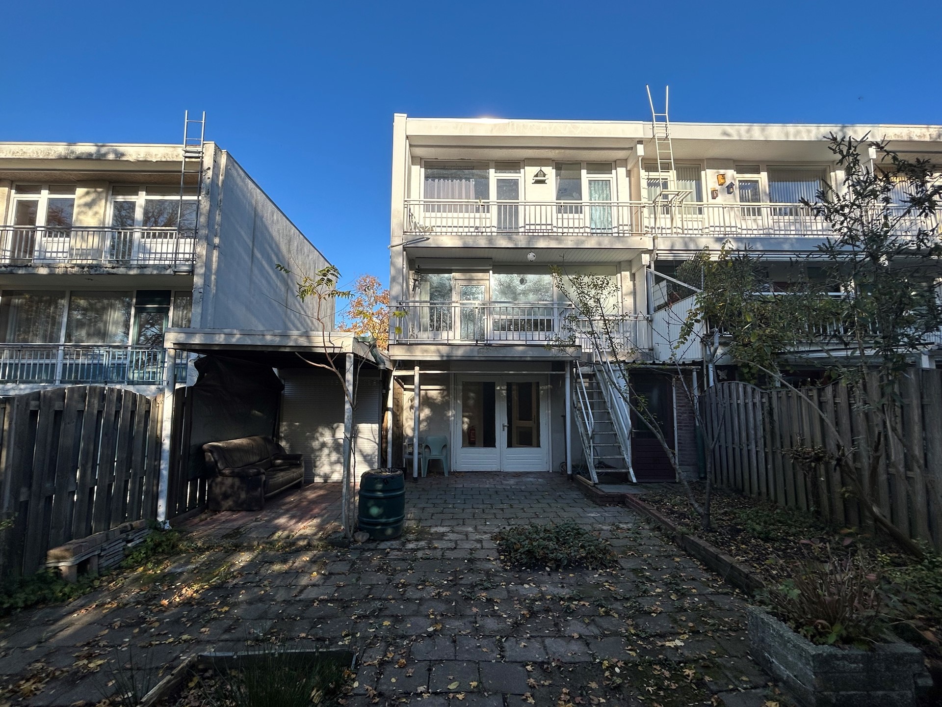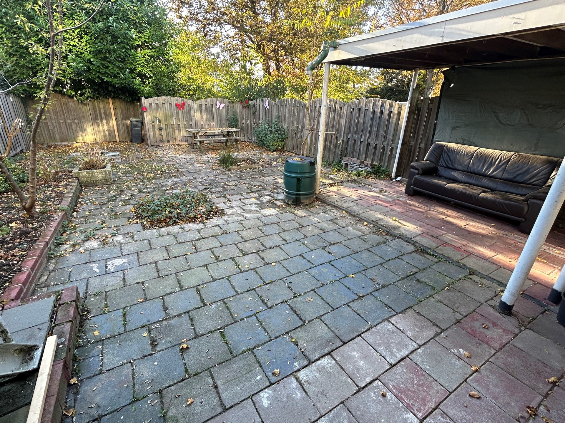 Zij-tuin is oprit voor plaatsing van meerdere auto's en doorgang naar achtertuin.