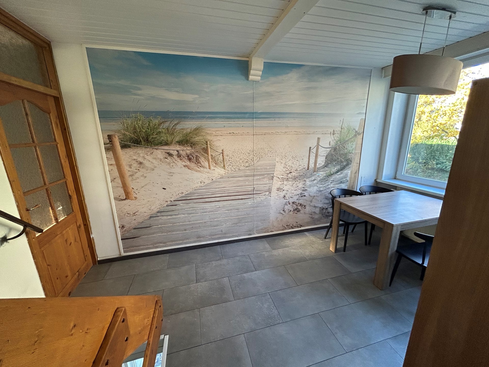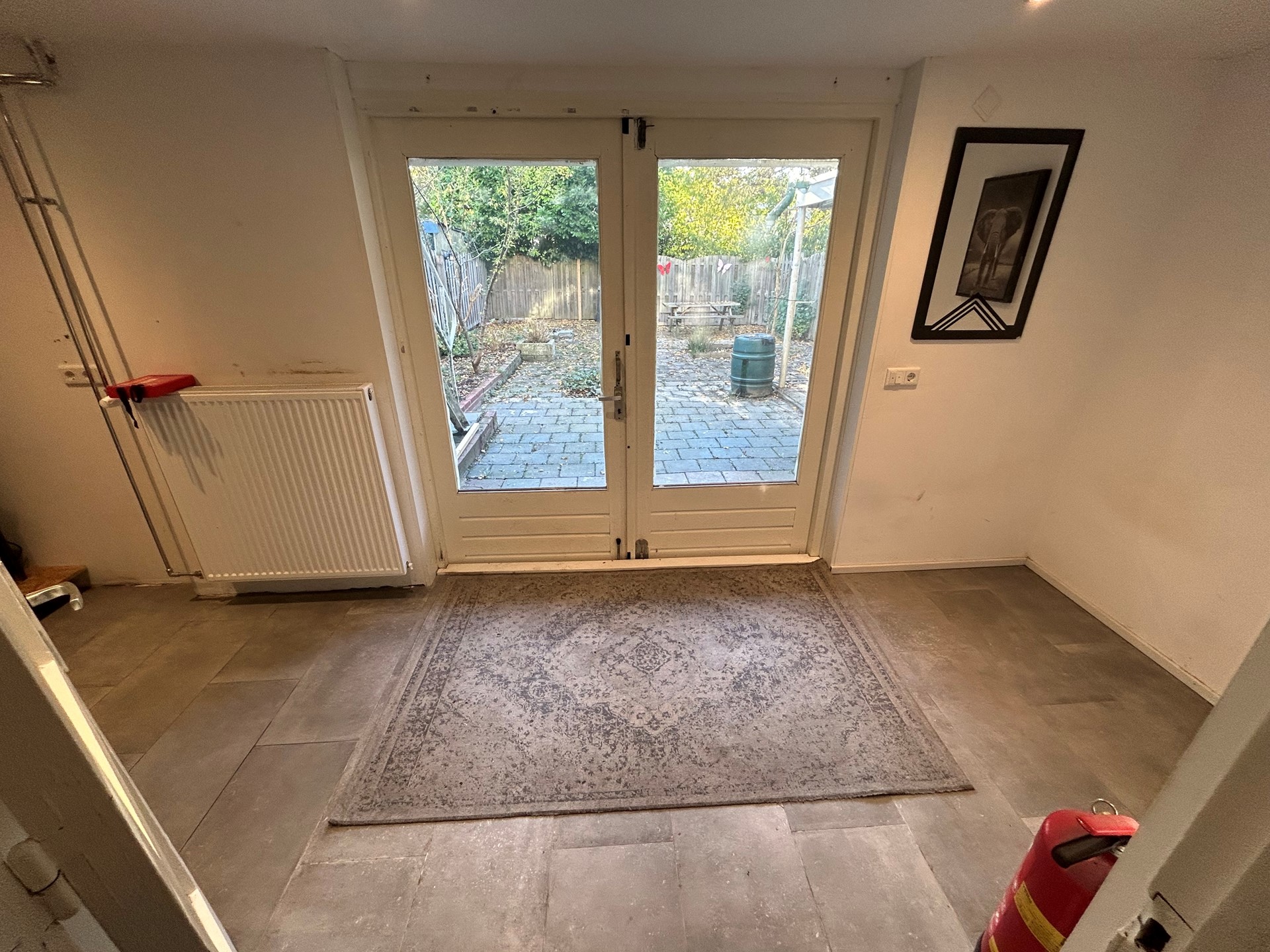 Woonkamer en hal houten kozijnen met dubbele beglazing.